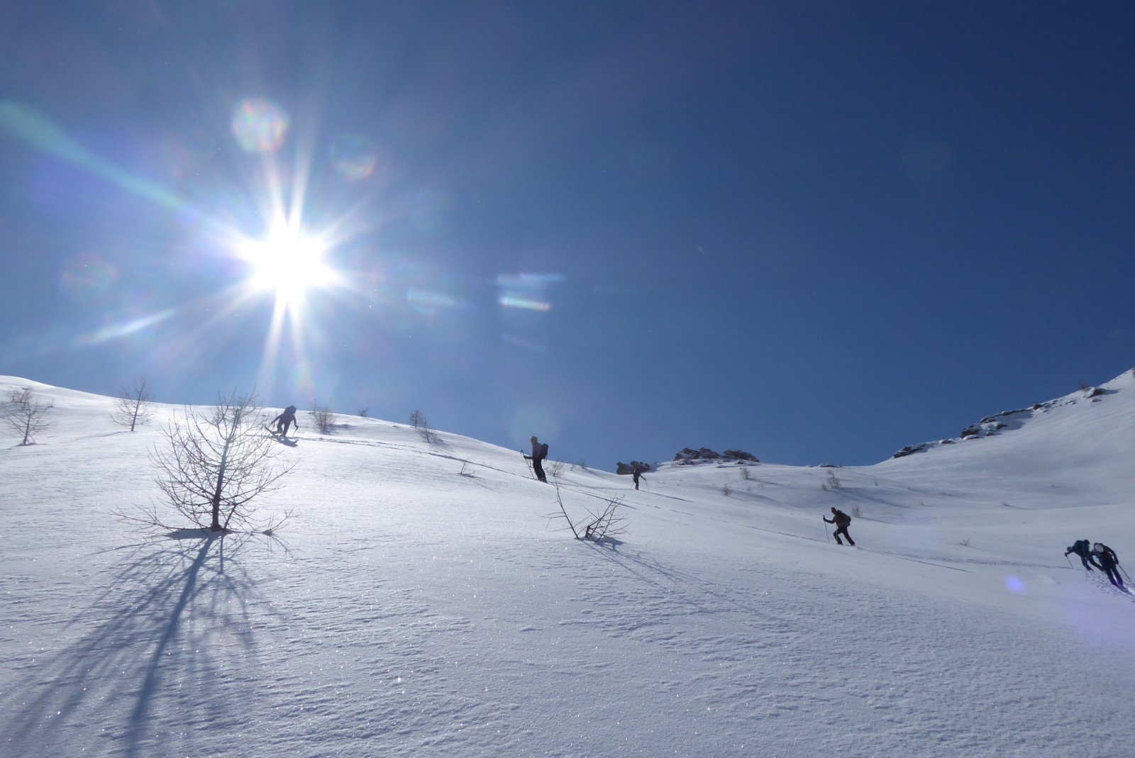 Sortie CAF Guillestrois/Queyras sous "l’autorité" de Nicolas avec Nadège, Marc, Lydie, Bernard, Marine, Cory. Après un départ friqué nous rejoignons Valpréveyre où nous faisons les tests DVA. Sur la Trace de MARINE nous passons à coté de la bergerie qui visiblement est occupé !! et poursuivons vers notre objectif du jour dans 30, 40cm de poudre et dans des pentes qui avoisine >=30°. BERA =3 donc nous prenons les espaces de sécurité.Un léger vent d'ESt nous accueil au sommet . Photos , contemplation pour ceux qui découvre les lieux et nous nous lançons dans la "peuf" *****. encore vierge de traces