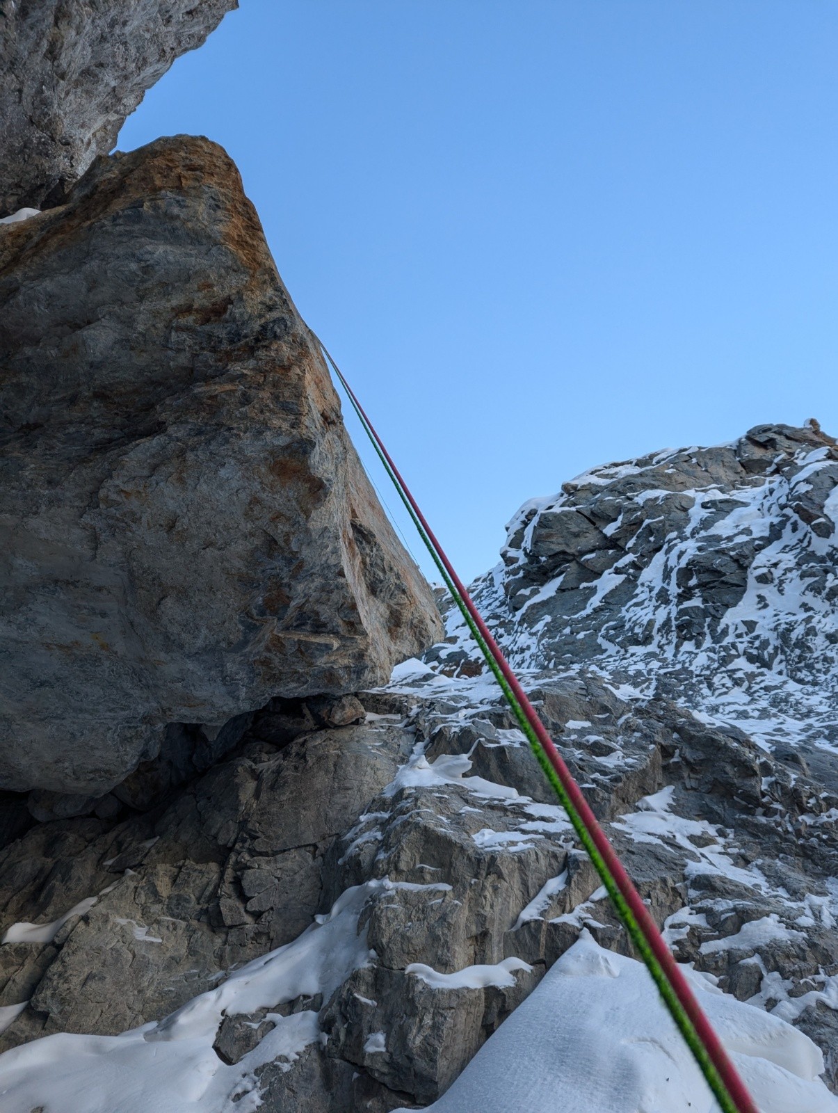 Bon, ensuite, on arrive enfin à la neige, au niveau d’une vieille corde bien visible… enfin presque : il reste un pas de désescalade 10 m sous la vieille corde, potentiellement plus ou moins galère à passer selon l’enneigement (cf. photos pour les relais et ressauts), avant de pouvoir vraiment skier.