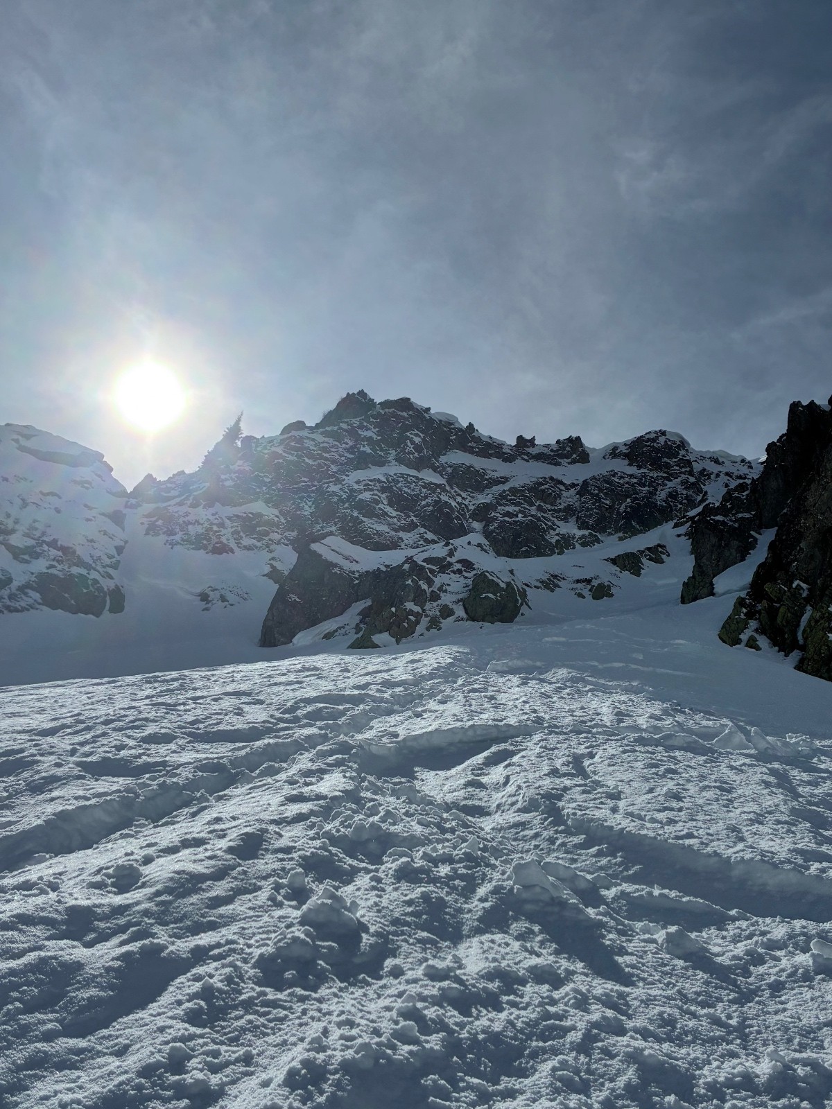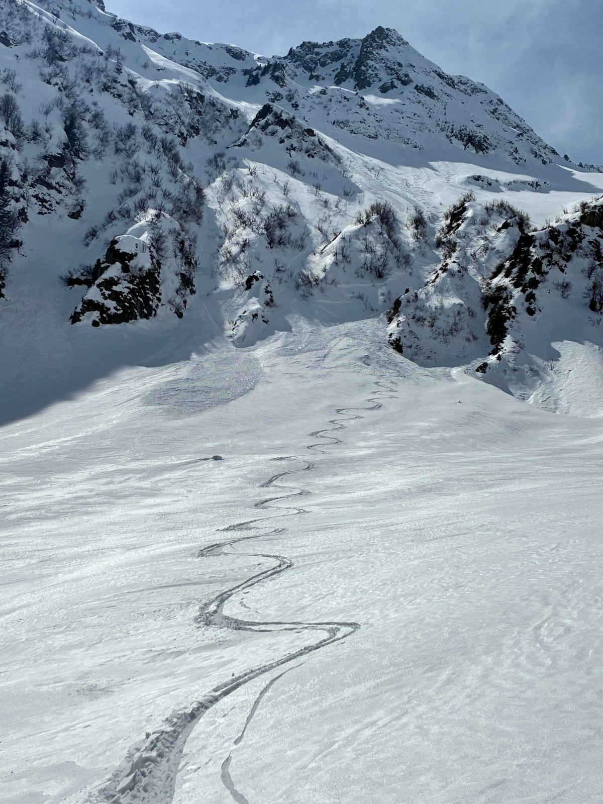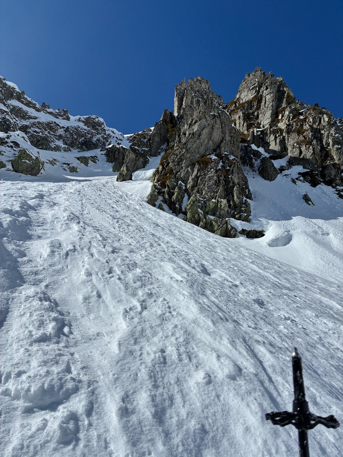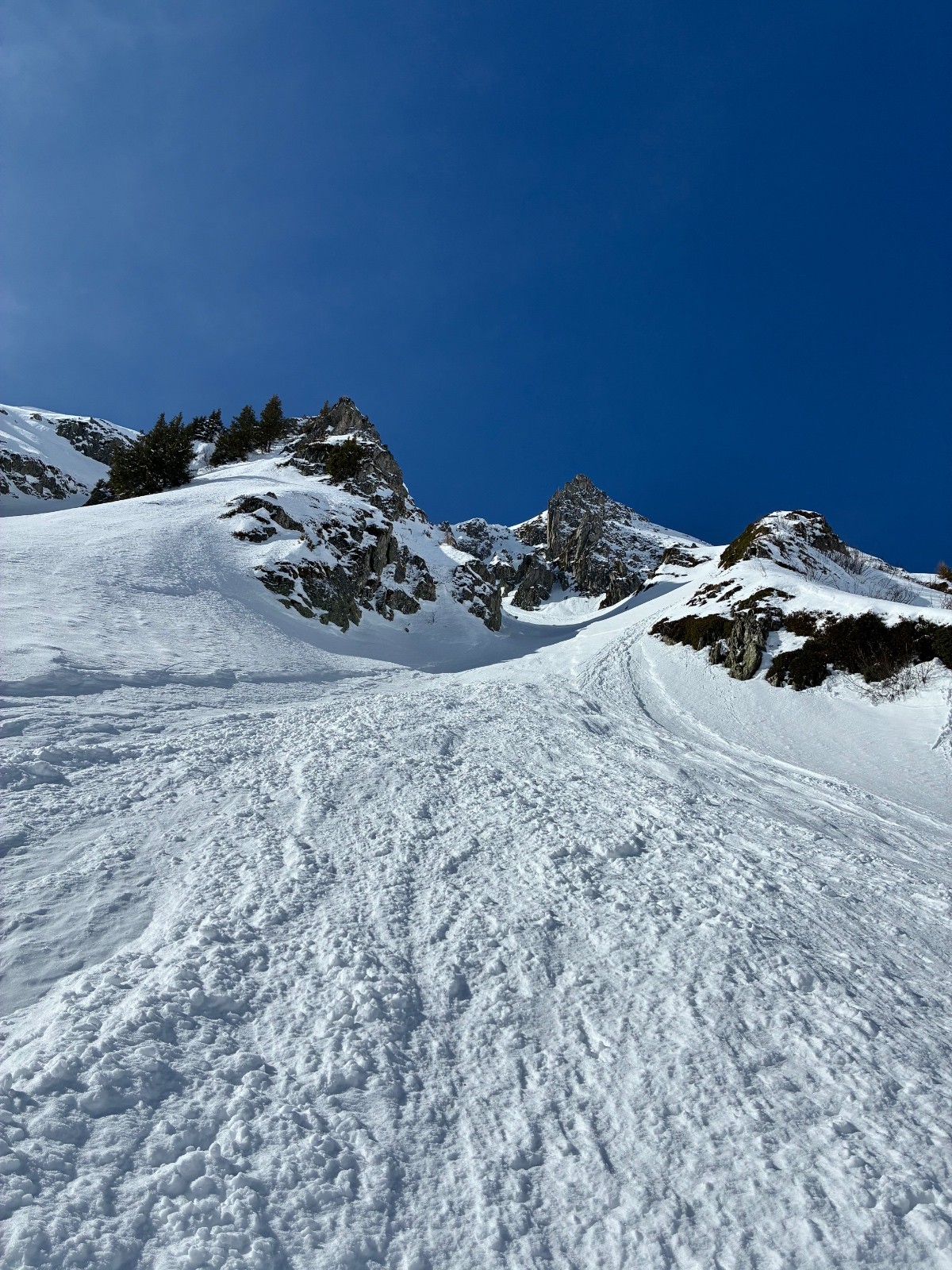 Contant d avoir trouvé une trace jusque au chalet ,car apres j en ai bavé comme un cochon ,ça chalait sévère ,j aurais pas crus tant ,il a fallut que j aille chercher loin la volonté d autant que j étais pas au top ,idem sur le départ (montée)du couloir de droite en neige molle jusque mi cuisse ,puis surprise ,les 150 m de bien raide en fine molasse sur fond béton et gelé .ave. Un passage bien raide au delà du 50 .