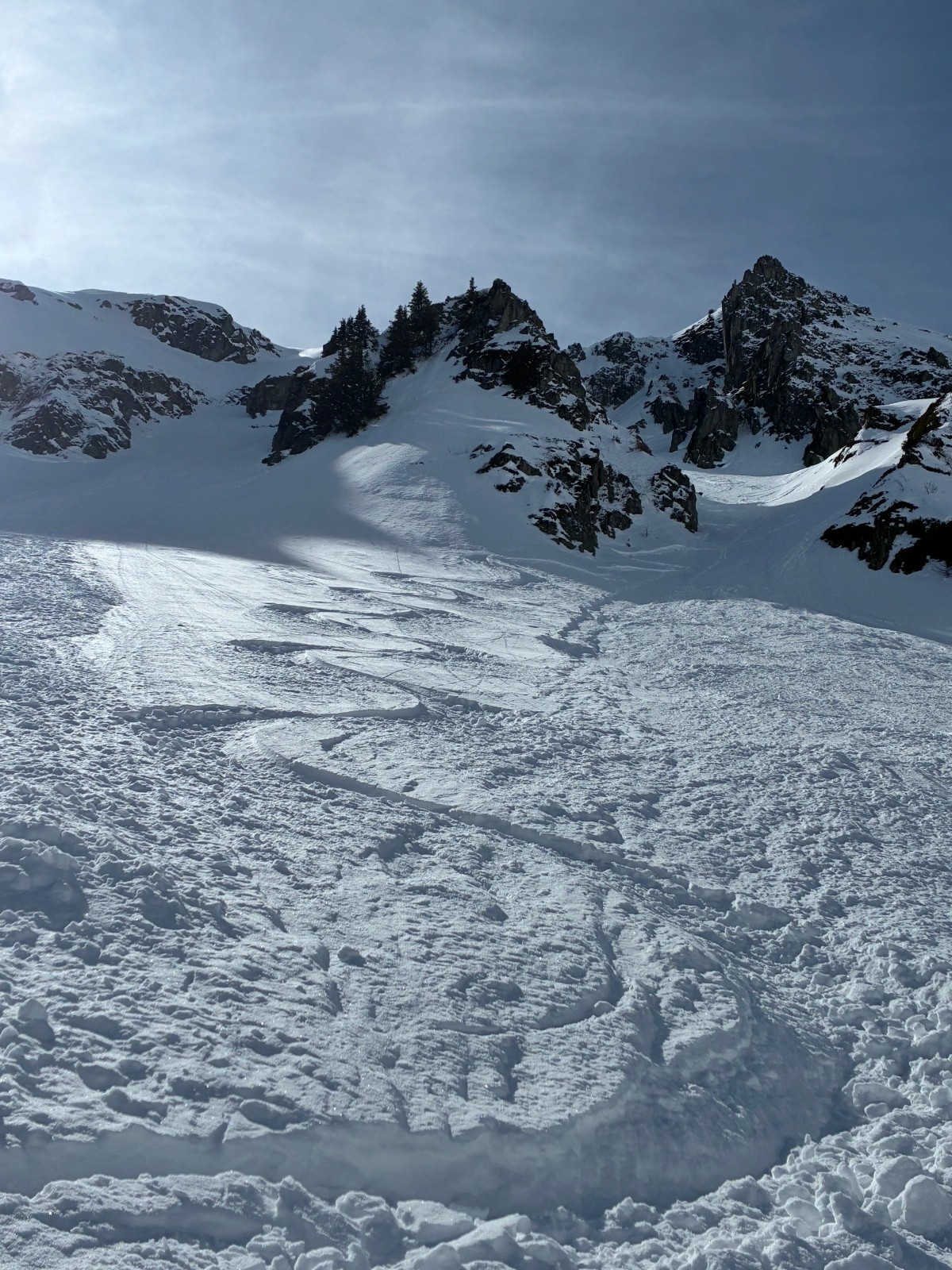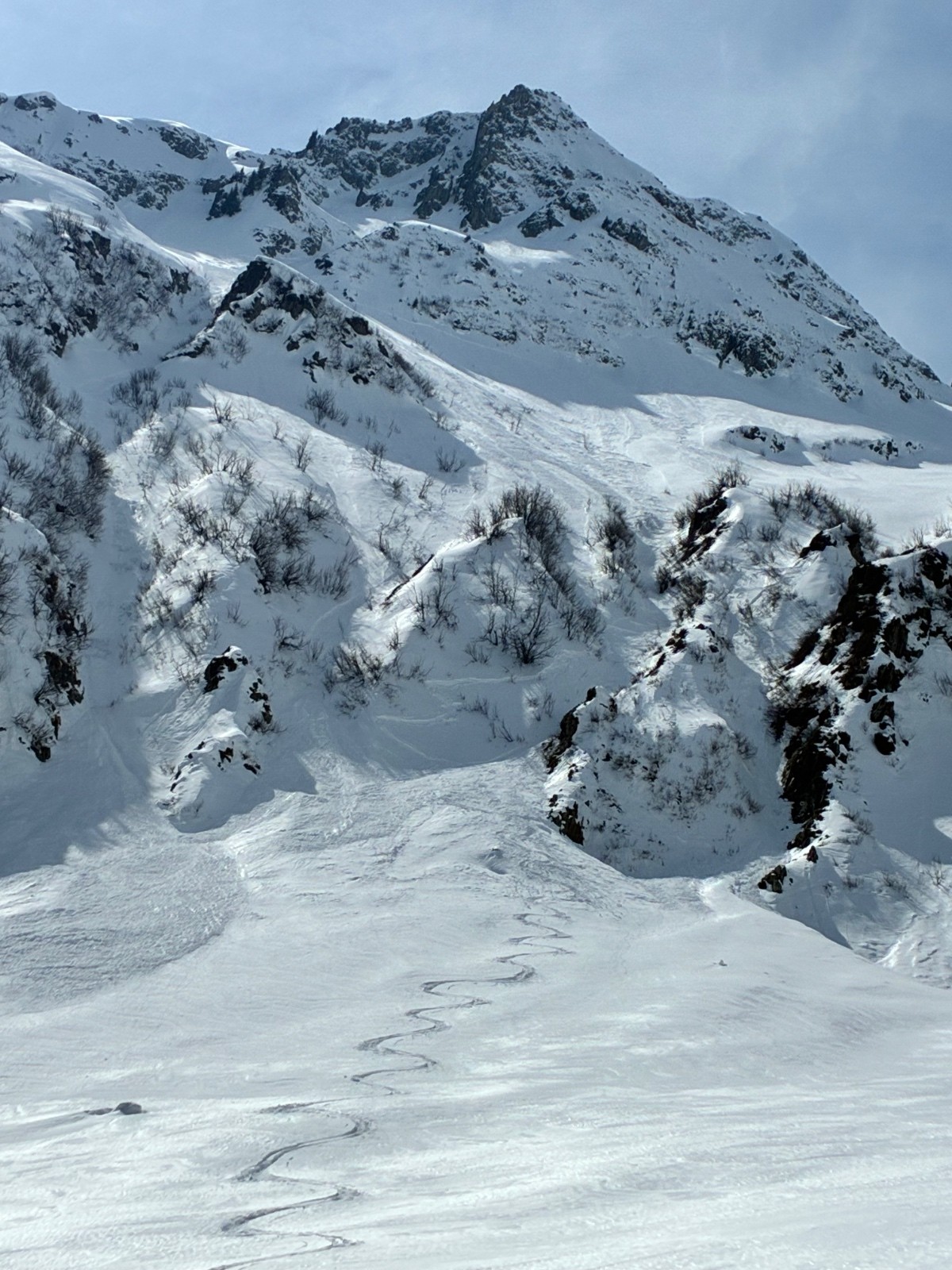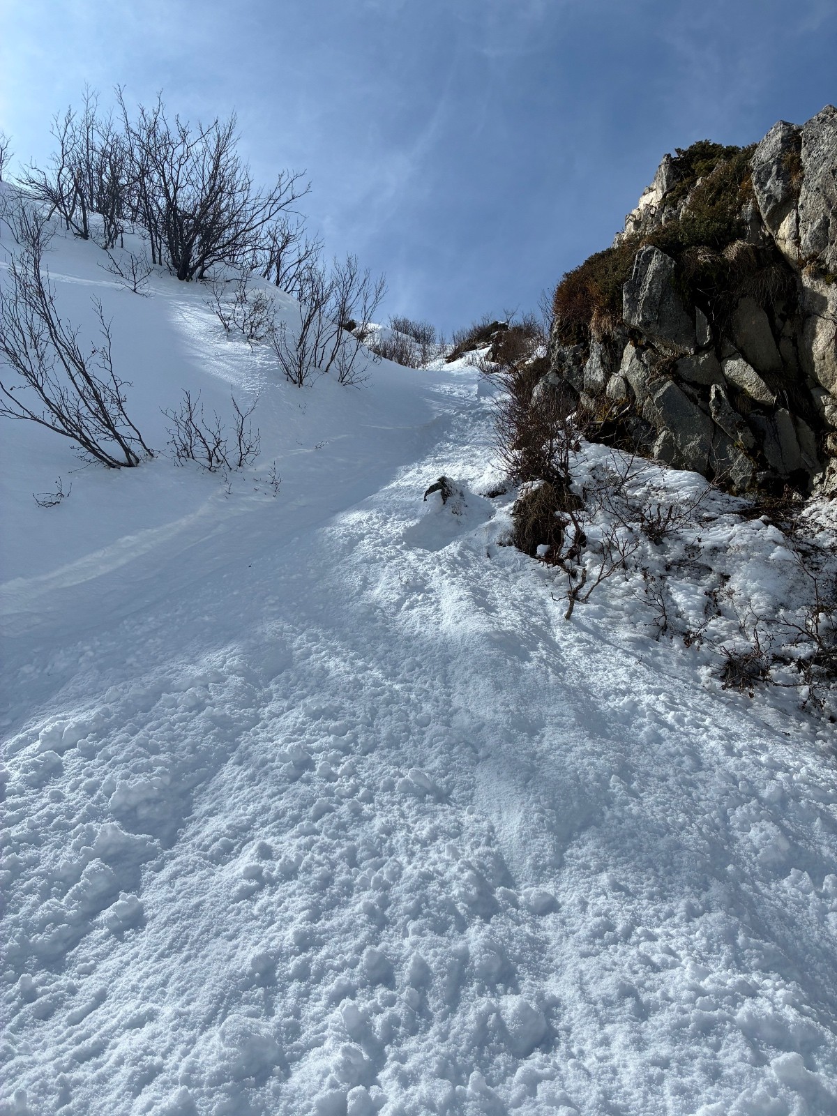 Contant d avoir trouvé une trace jusque au chalet ,car apres j en ai bavé comme un cochon ,ça chalait sévère ,j aurais pas crus tant ,il a fallut que j aille chercher loin la volonté d autant que j étais pas au top ,idem sur le départ (montée)du couloir de droite en neige molle jusque mi cuisse ,puis surprise ,les 150 m de bien raide en fine molasse sur fond béton et gelé .ave. Un passage bien raide au delà du 50 .