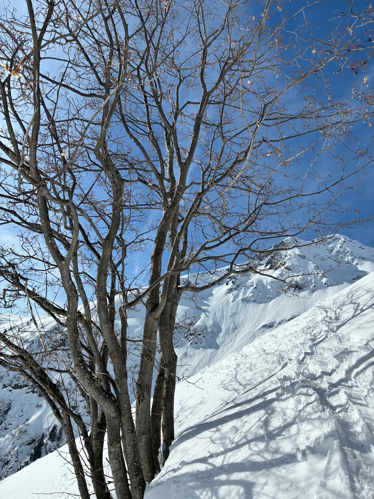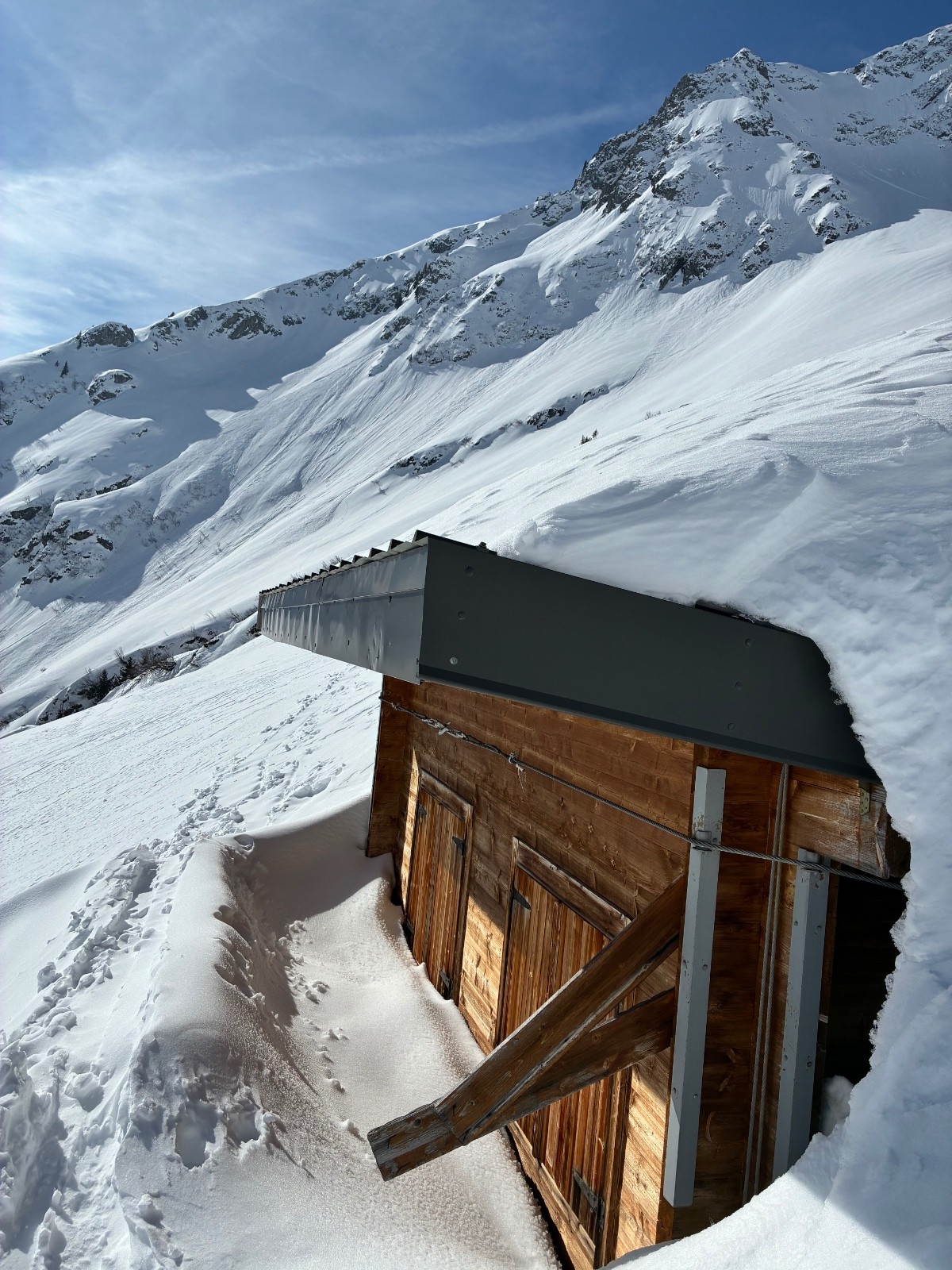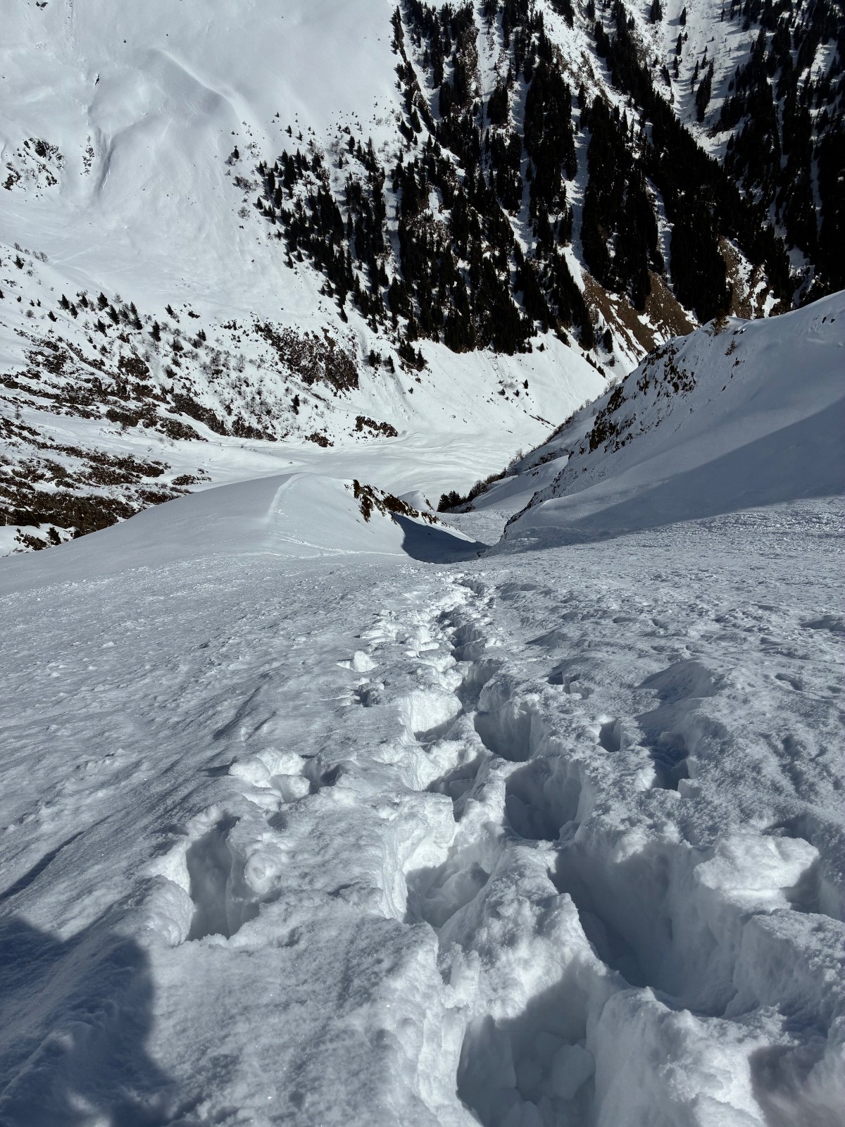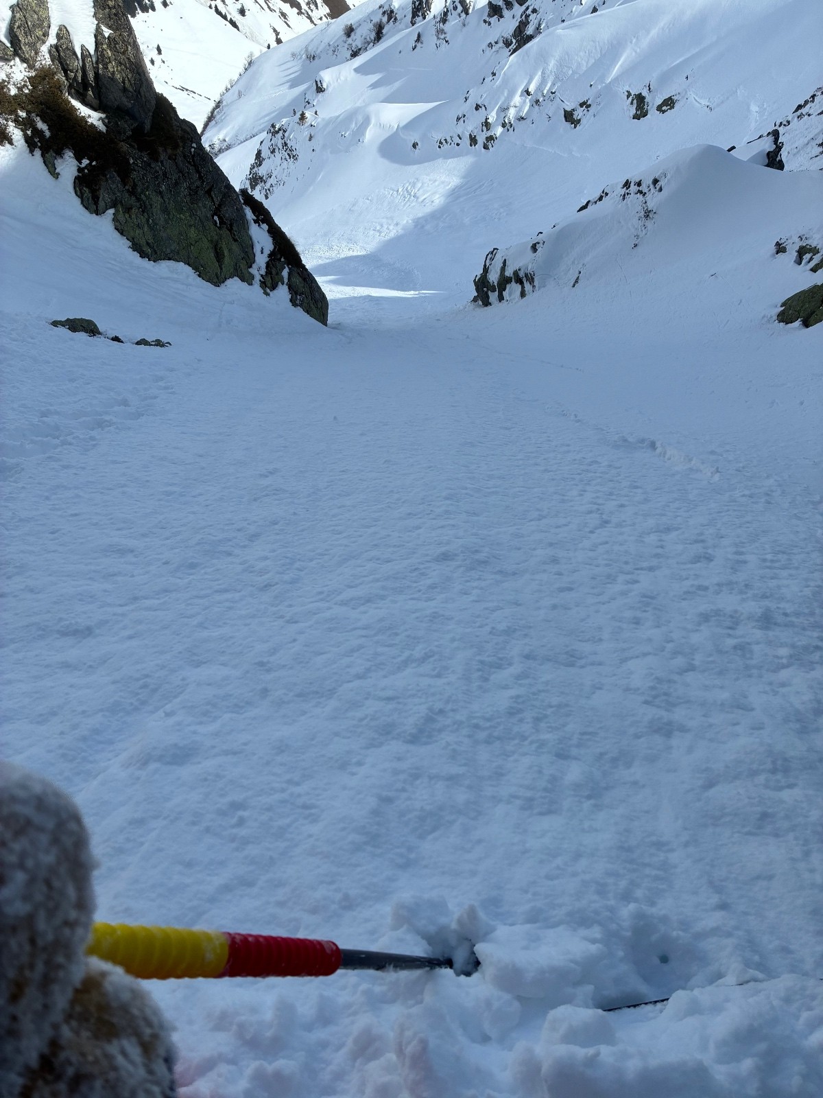Contant d avoir trouvé une trace jusque au chalet ,car apres j en ai bavé comme un cochon ,ça chalait sévère ,j aurais pas crus tant ,il a fallut que j aille chercher loin la volonté d autant que j étais pas au top ,idem sur le départ (montée)du couloir de droite en neige molle jusque mi cuisse ,puis surprise ,les 150 m de bien raide en fine molasse sur fond béton et gelé .ave. Un passage bien raide au delà du 50 .