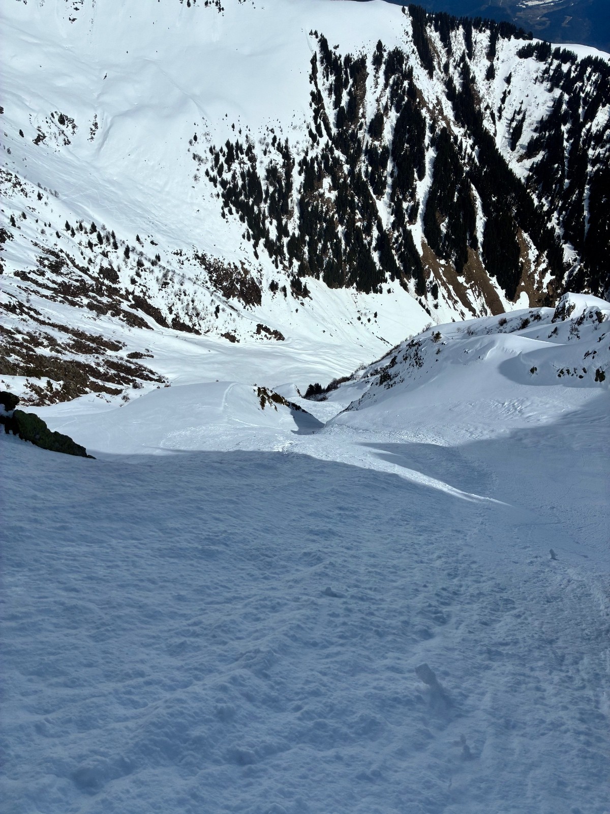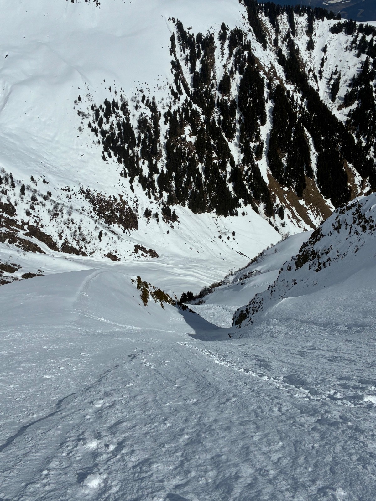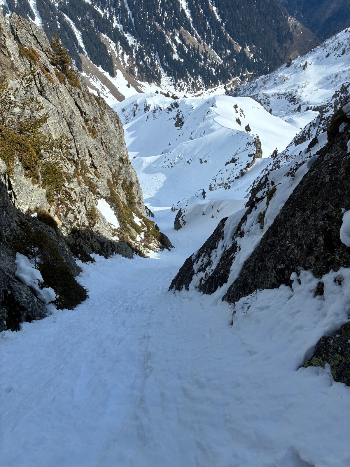Haut du couloir en neige ayant pris le soleil un peu de molle sur fond béton et glacee puis le reste bonne poudre ,pris la goulotte centrale sur la bas,quelques passages en glace évitables puis ras ,préférer la belle pente de gauche vers le chalet ,bien plus skiante .