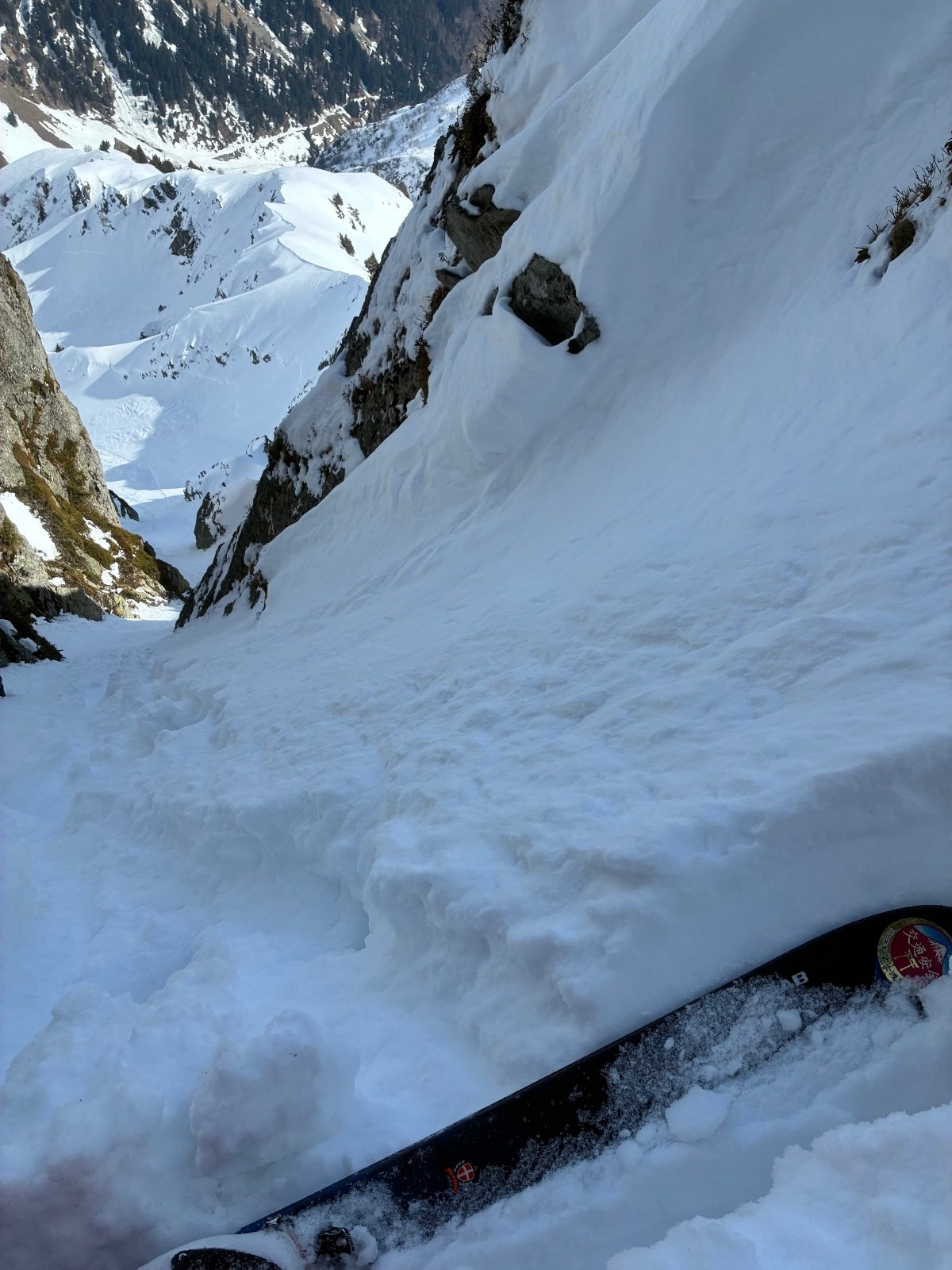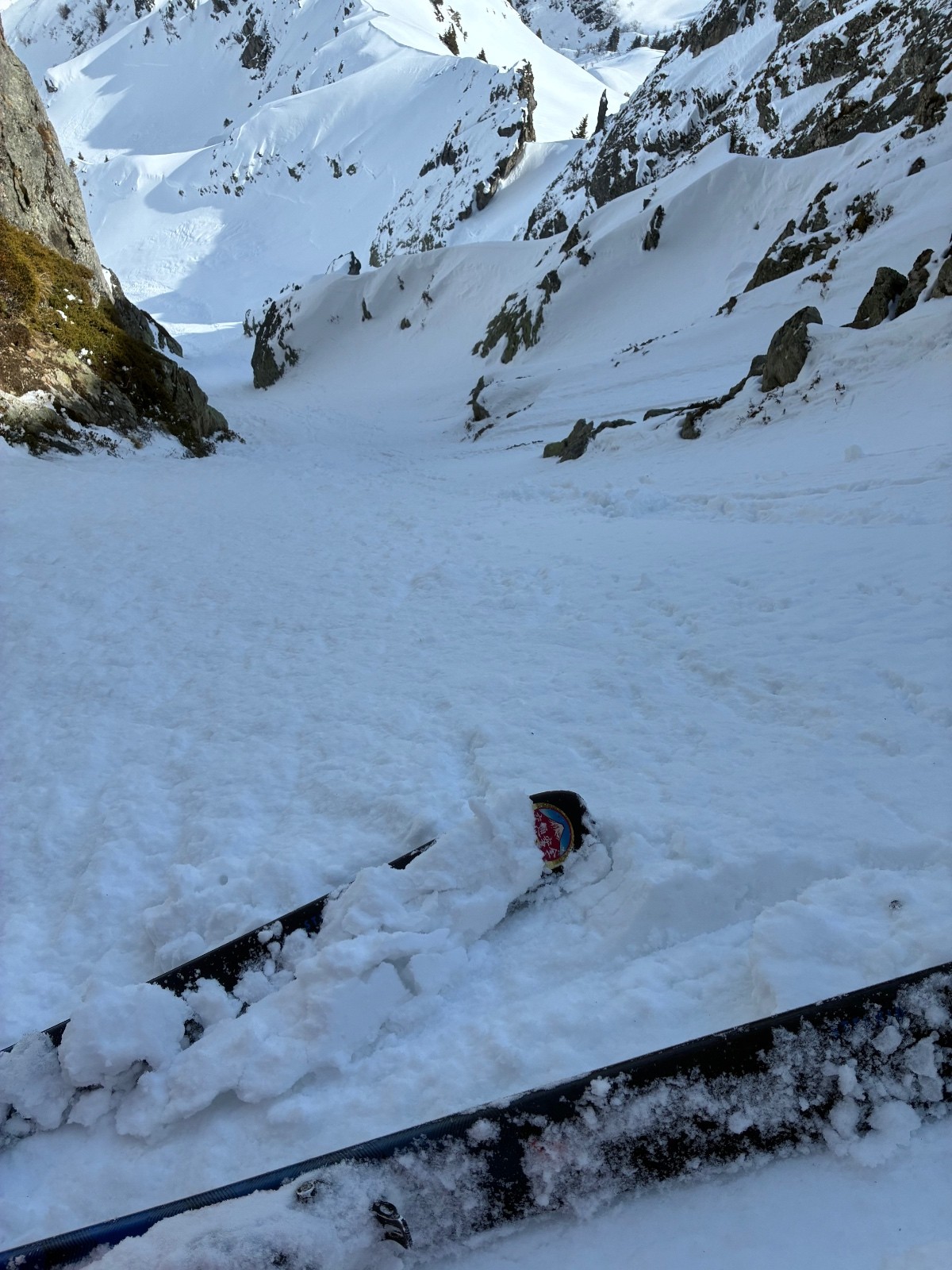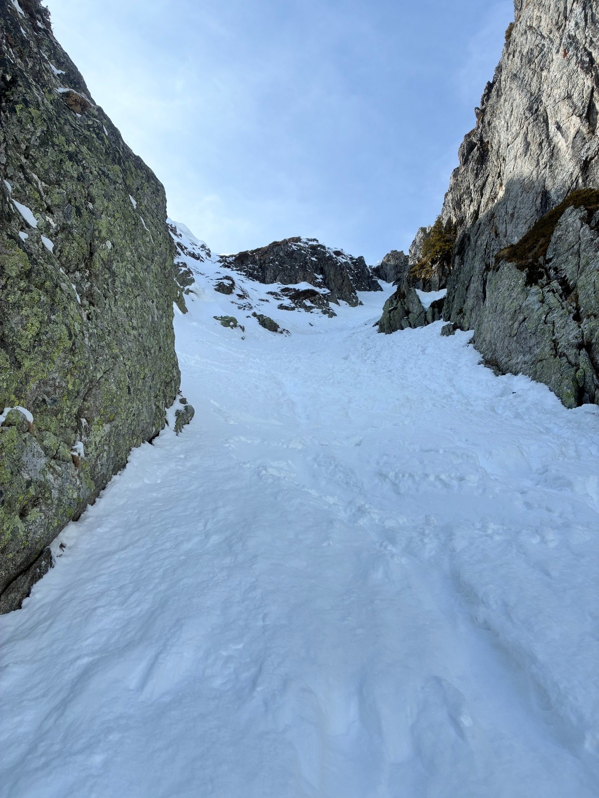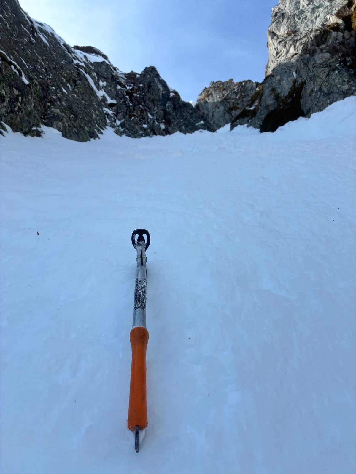 Couloir de gauche (moins raide la 5.1) plaque en sortie ,ça ne faisait pas envie ,même si ça sortait tranquille ,couloir de gauche (la 5.2) bien raide sur une neige molle puis un passage très raide (55 facile)sur une fine couche de molle posée sur de la glace .50 mètre d etroiture ou les skis (164)touchent les bords .arret 15 mètres sous le sommet ,sortie avec 20 cm de neige sur la caillasse ,pas envie de latter mes skis ,ni de risquer de m en coller une .