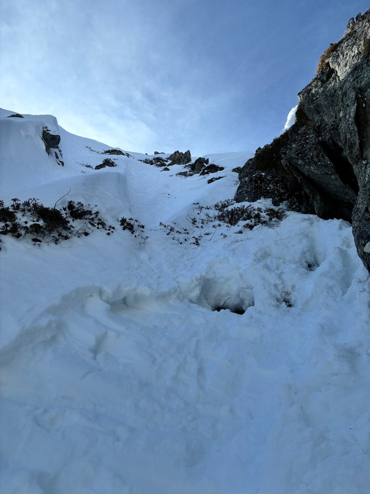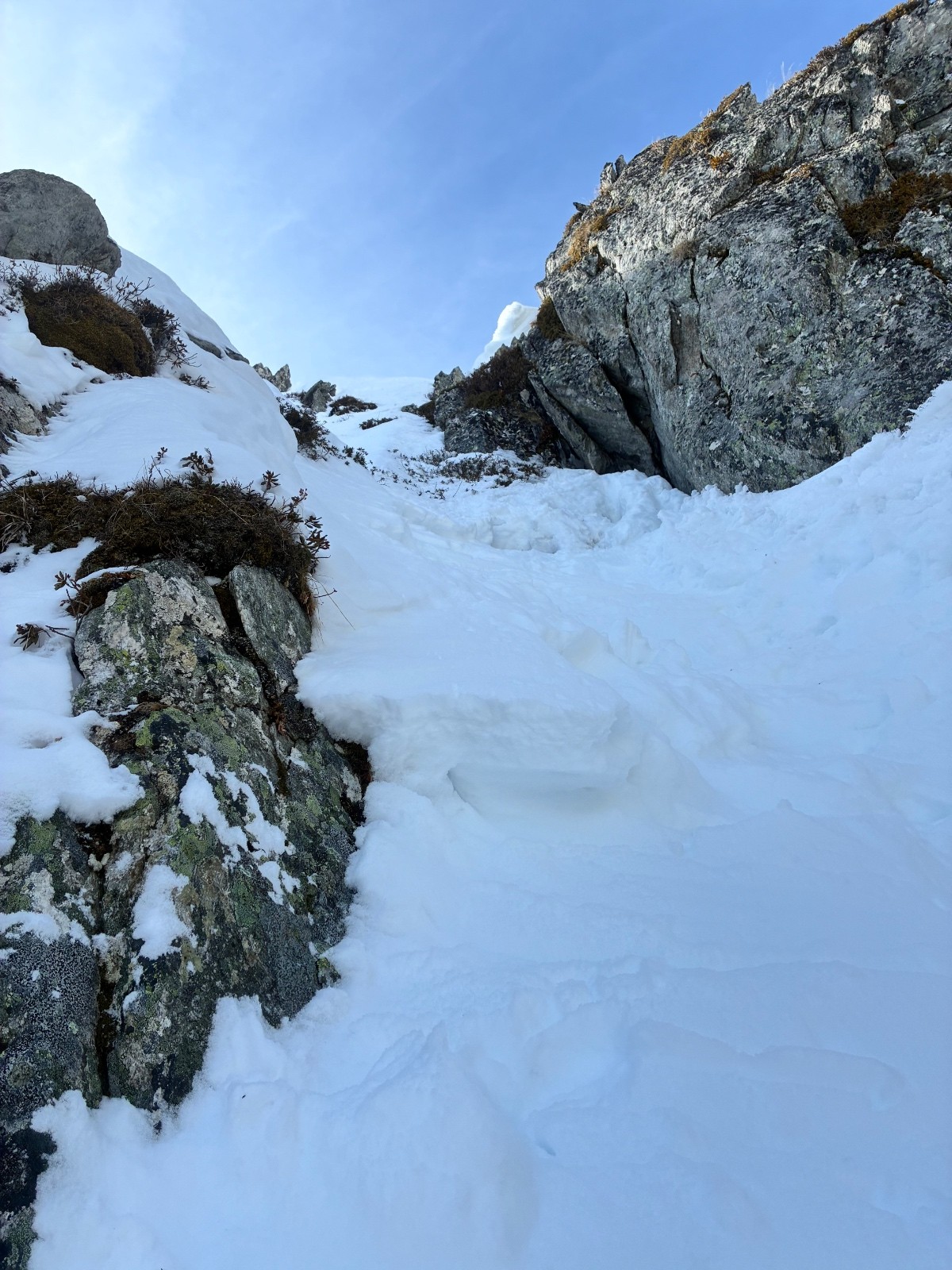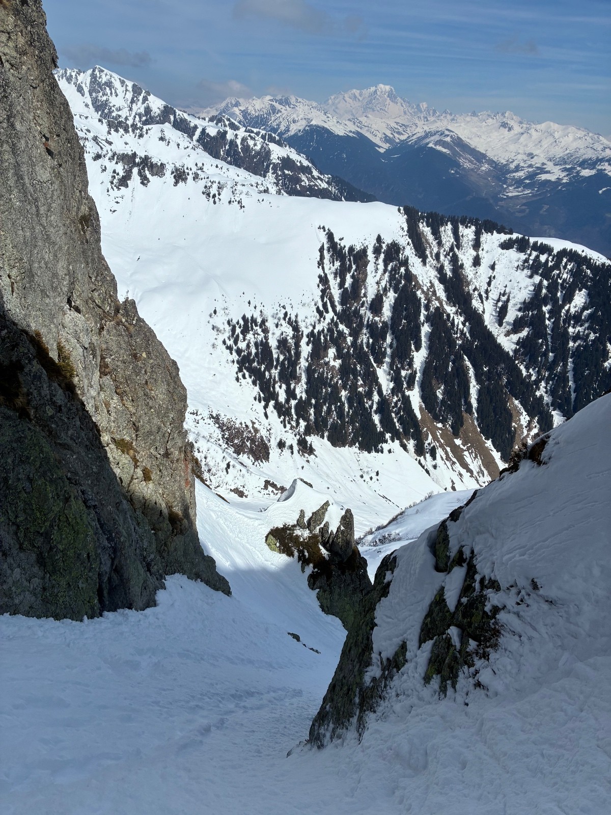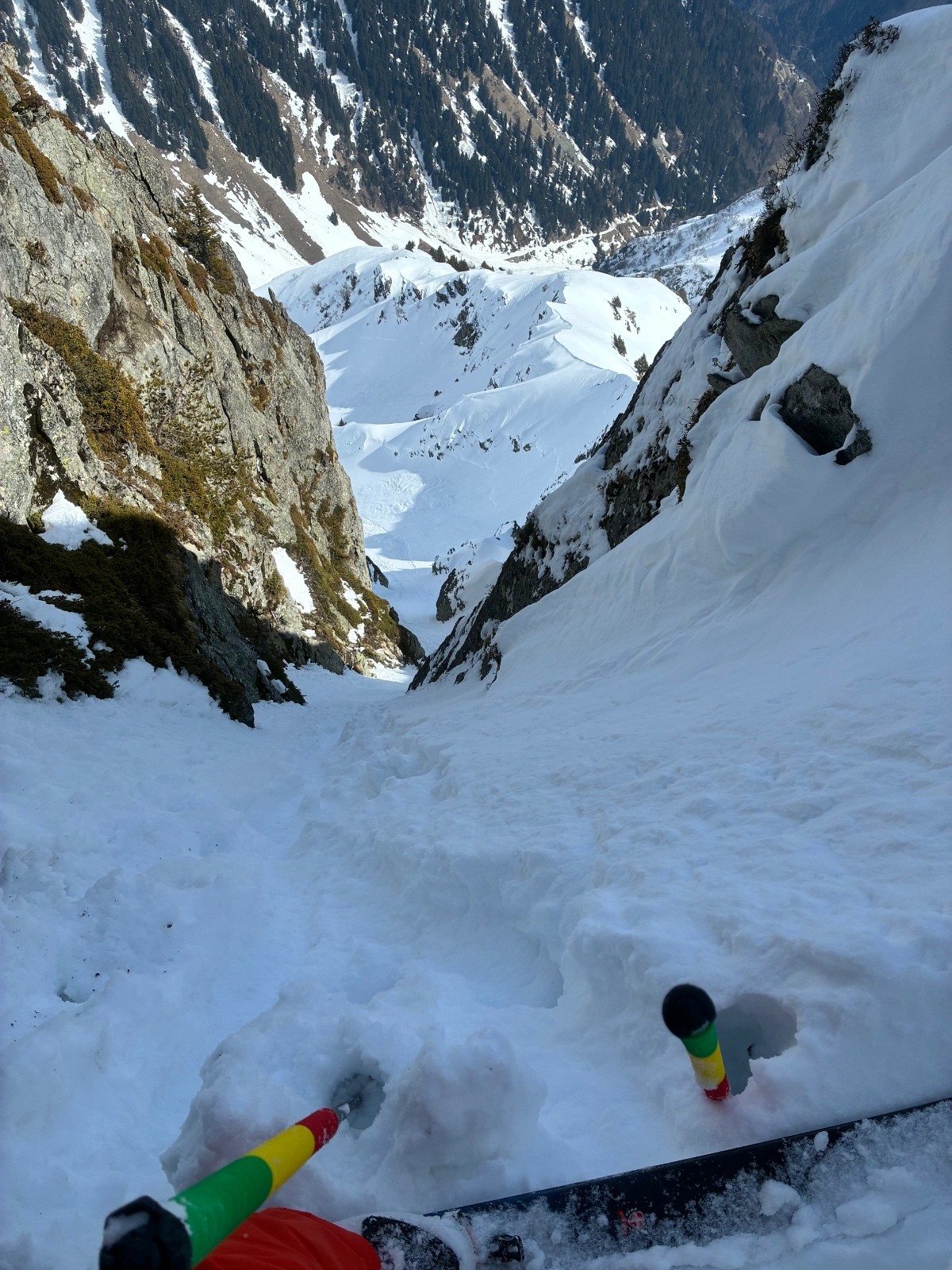 Couloir de gauche (moins raide la 5.1) plaque en sortie ,ça ne faisait pas envie ,même si ça sortait tranquille ,couloir de gauche (la 5.2) bien raide sur une neige molle puis un passage très raide (55 facile)sur une fine couche de molle posée sur de la glace .50 mètre d etroiture ou les skis (164)touchent les bords .arret 15 mètres sous le sommet ,sortie avec 20 cm de neige sur la caillasse ,pas envie de latter mes skis ,ni de risquer de m en coller une .
