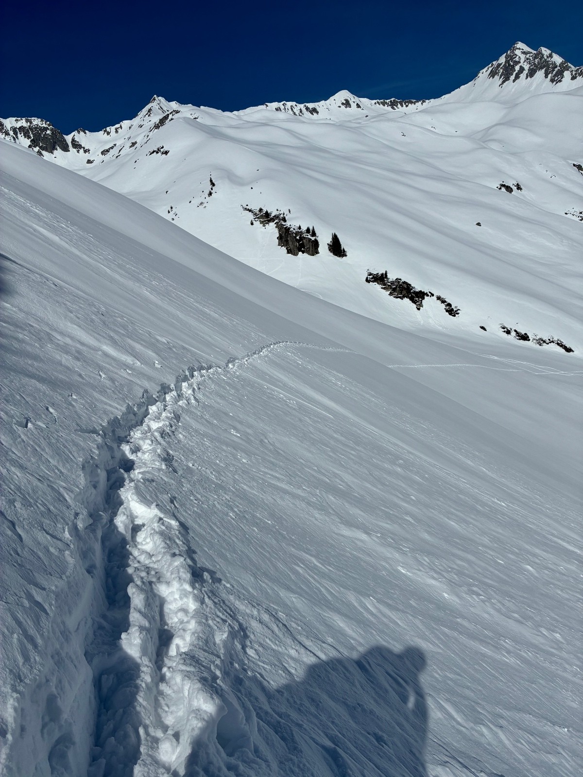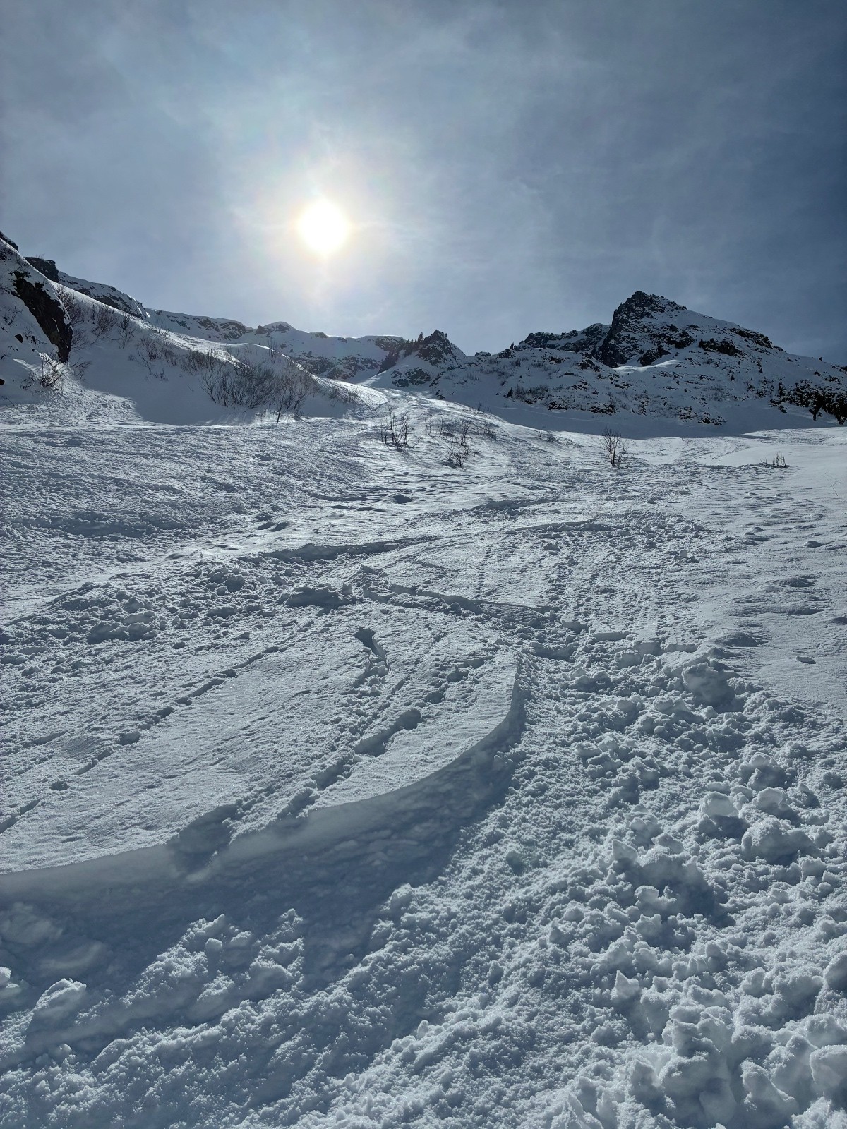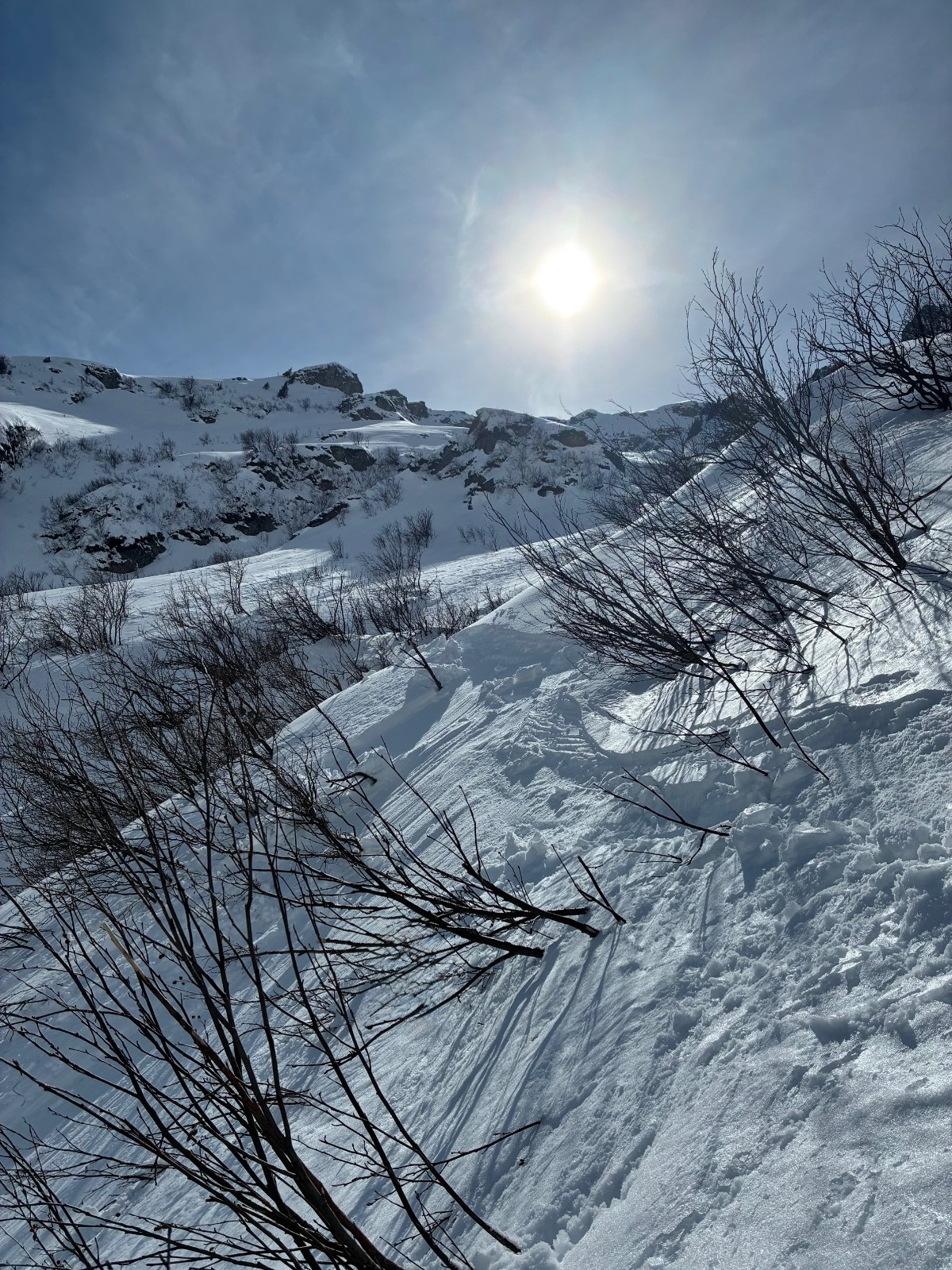 Attaque de la pente ,le bas sur une coulée de surface (genoux )puis un peu de dure pour rejoindre la pente centrale ,la pas la même limonade ,traçage sur une poudre non portante on s enfonce jusque mi cuisse .