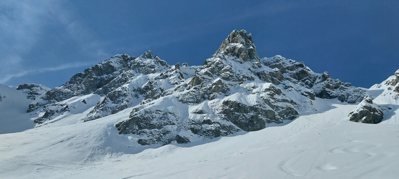 C’est la première fois que je descends cette face. Il y a moins de 72 h, en haut de ce même sommet, je disais que le E4, ce n’était pas pour moi😅. Bon, ben raté. Je dis aussi que je suis du genre opportuniste, et sur ce point, c’est un peu plus vrai. Je me suis senti hyper à l’aise dans la face. Finalement, je n’ai pas senti l’exposition grâce à une super neige, des pentes que je commence à avoir l’habitude de skier et un bon guide. Parce que, quand on ne connaît pas, c’est un peu le labyrinthe pour trouver le bon passage🤯...