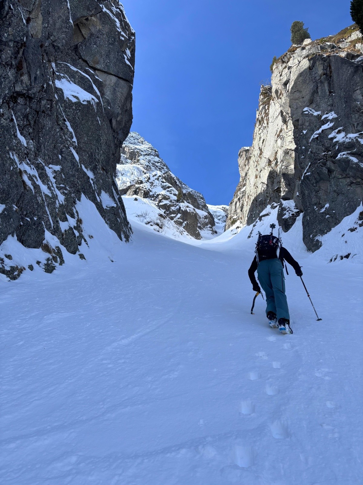 En bas du couloir neige revenue puis bien lourde en dessous proche de la forêt.