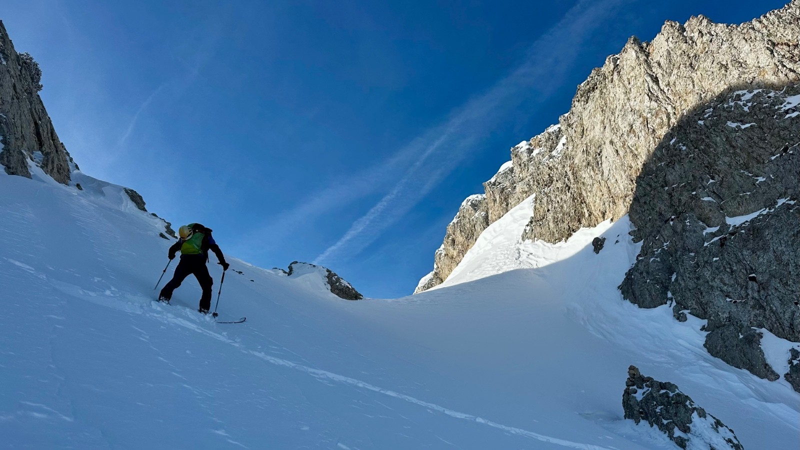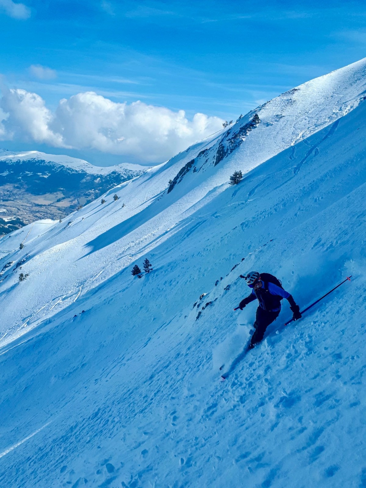 - En bonus : le couloir de la raie des fesses était déjà tracé, on a donc pris un couloir plus à gauche (qd on remonte vers le pas de la ville depuis le plateau) : le début était pas mauvais, le milieu … beurk 🤢 (neige bien dur), et la fin tout poudre top.