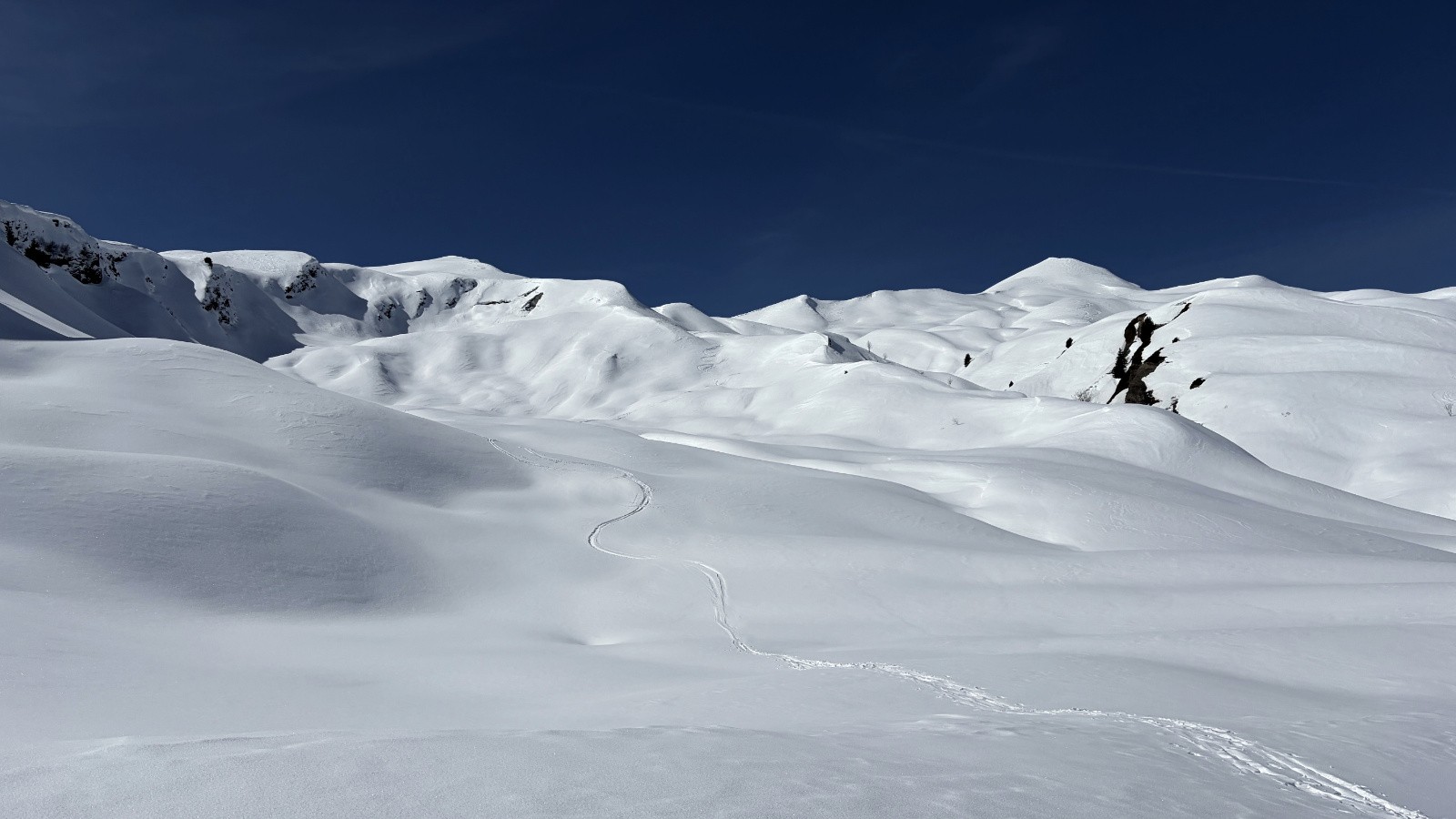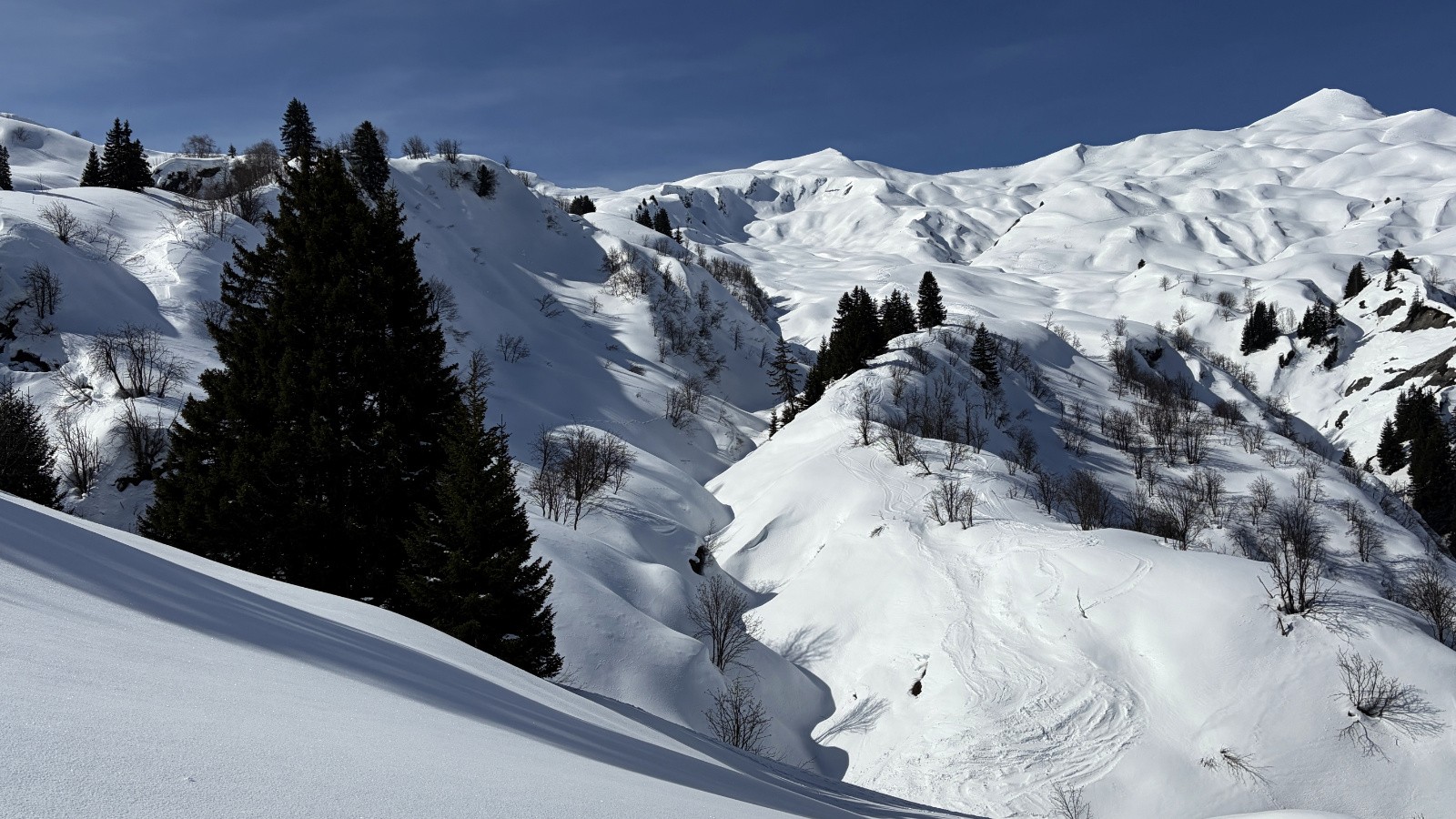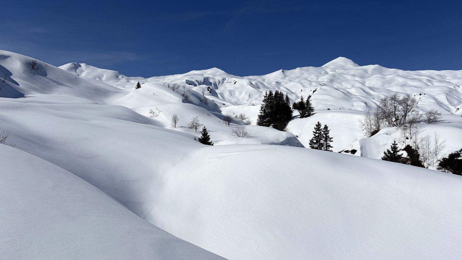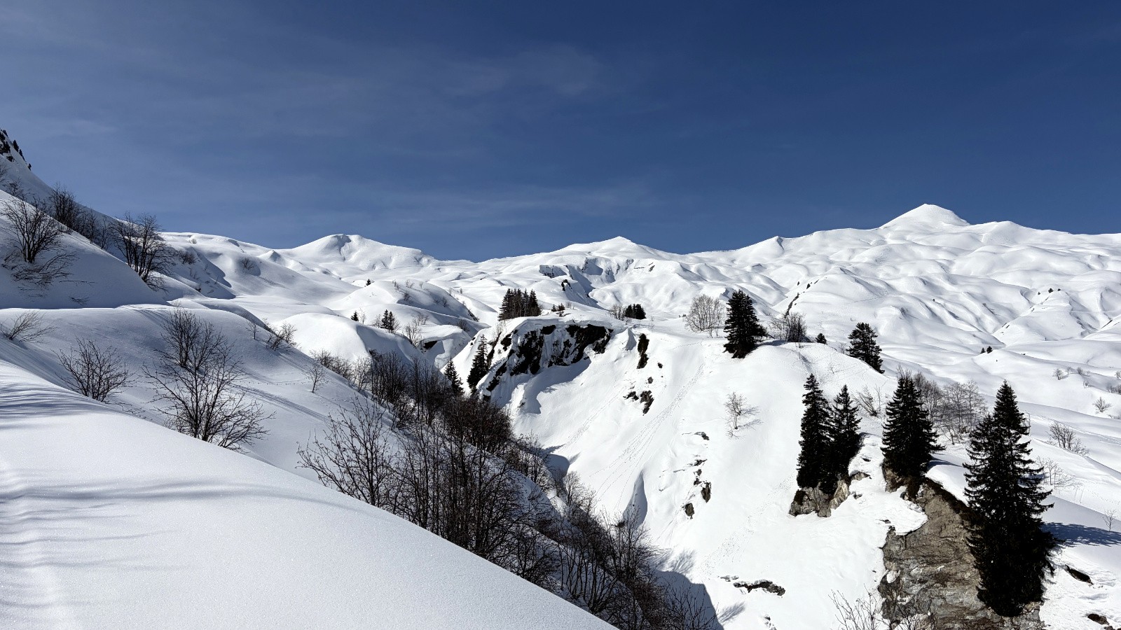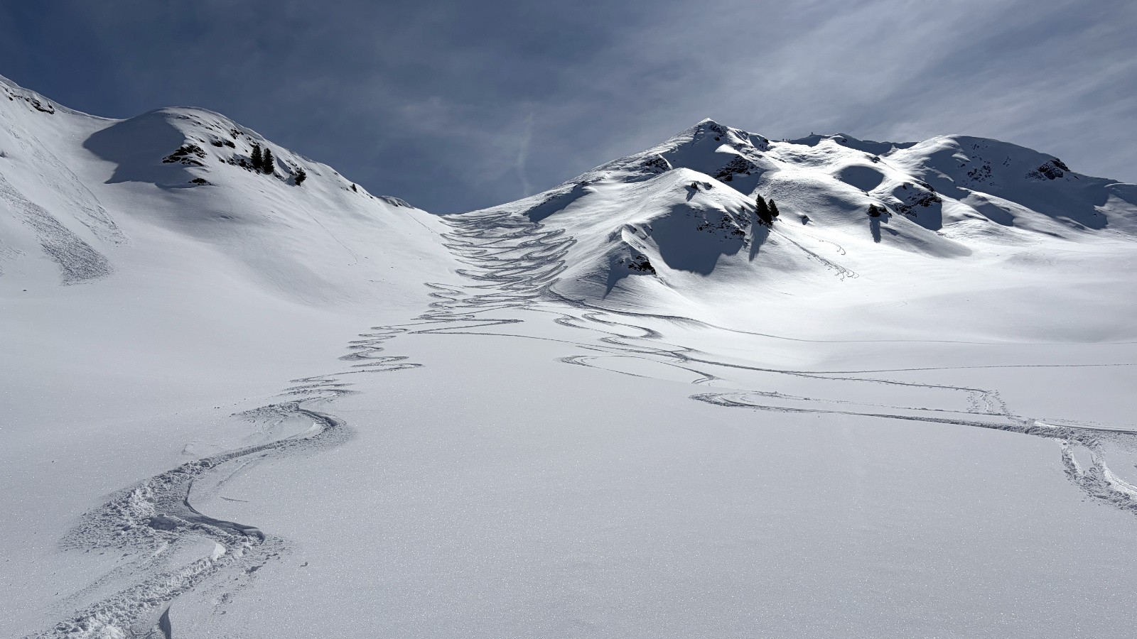 Conditions pour le ski : montée, neige en cours de transformation,bonne accroche. Descente sur la combe de la Louze en poudre, un régal !