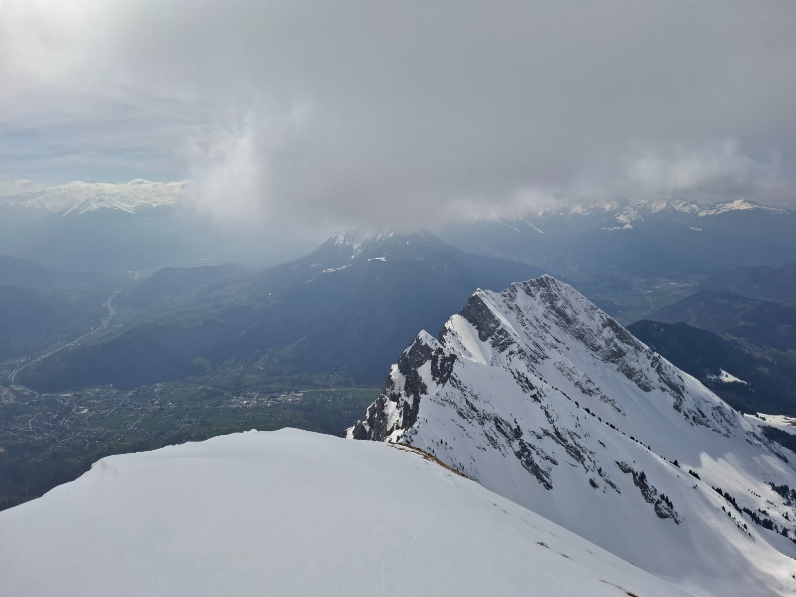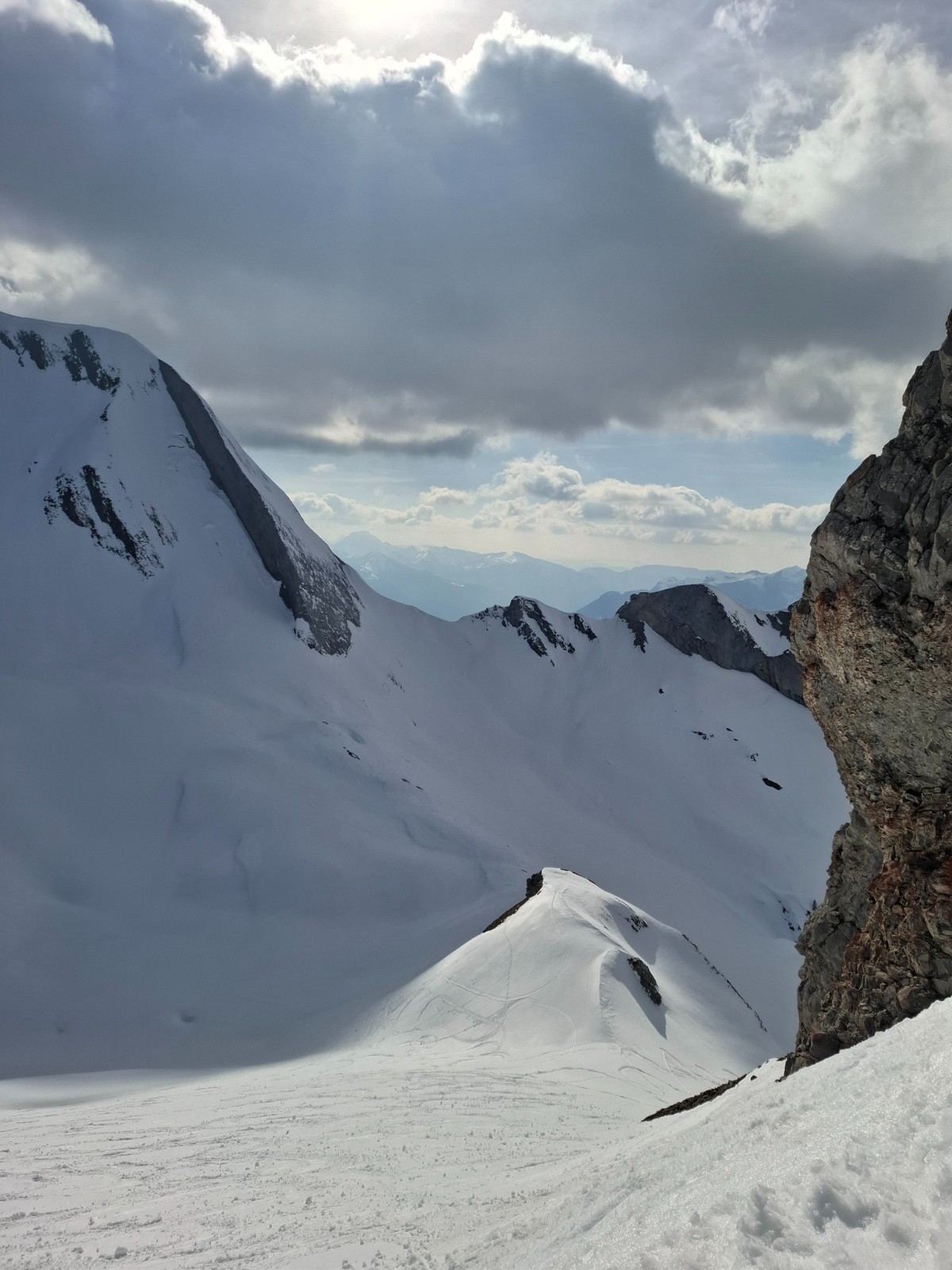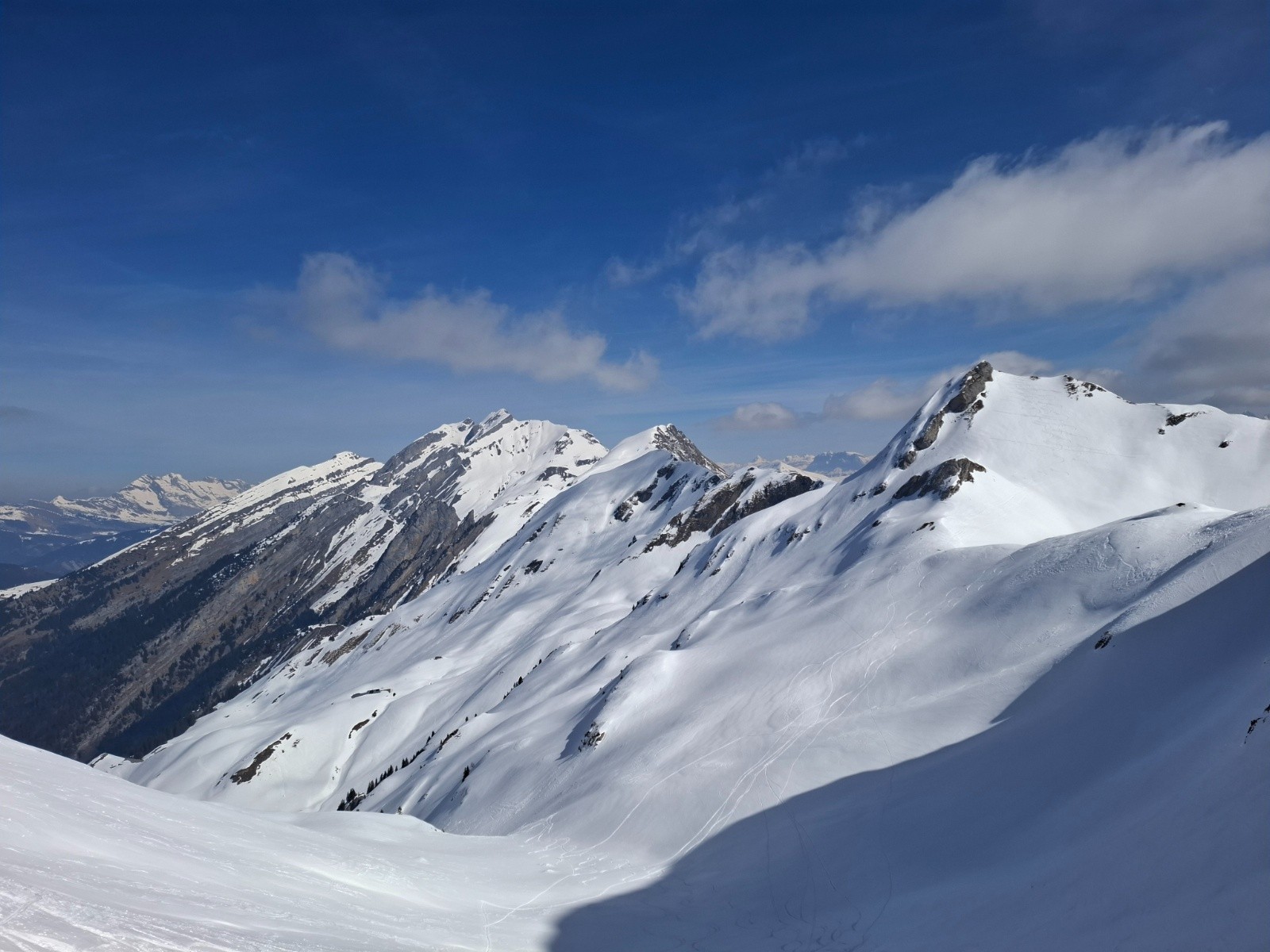 Récit : Départ un peu tardif à 9h à cause des bouchons, 4 voitures au parking avec un groupe de 5 personnes en Splitboard. Le boarder passe bien. Pour le col des Porthets je choisis la voie du haut qui passe à coté des chalets de l'Aulp d'en haut, c'est plus long que le canyon du bas mais comme ce dernier est généralement béton, j'ai préféré assuré. Au Col des Porthets bascule cote Ugine (SW), bonne neige encore un peu dure mais le décaillage n'est pas loin. Repeautage, Je récupère une trace pour la montée au Charvin, trace pas très raide et efficace. 6 personnes descendent dont certaines à priori pas très à l'aise, la neige semble être encore dure mais dans une heure ca devrait être Nickel . Sur l'arête terminale ca se complique, la neige est complètement rapée et ça dérape à tout va. j'hésite à finir à pied en crampons mais vu le peu de mètres restant à faire, je persévère; mais vu l'énergie dépensée et le temps perdu avec des passages en mode escalier, il aurait été plus judicieux et surtout plus rapide de passer à pied. 13h15, Descente , Celle ci passe très bien, arête en mode dérapage (N), pente ( NW) avec le haut dans une neige légèrement croute fine qui casse bien, et bas en neige décaillée très bonne. Donc du coup très bon timing👍 . Repeautage pour le col des Porthets, il fait vraiment trop chaud, la montée se fait en Tee shirt. Rebascule coté Manigod, Brève descente en poudreuse (N). Repeautage et montée à la Goenne, Neige bien ramollie. Descente SW neige moquette à poil long pour rejoindre mon point de traversée du matin au dessus des chalets de l'Aulp d'en Haut. Repeautage pour un dernier petit sommet à gauche de la Rouelle, histoire de passer les 2000m de déniv. Descente finale, encore de la moquette en SW puis boarder, celui passe encore bien mais des pierres et des parties sans neige, absentes le matin, commencent à apparaitre par endroit.