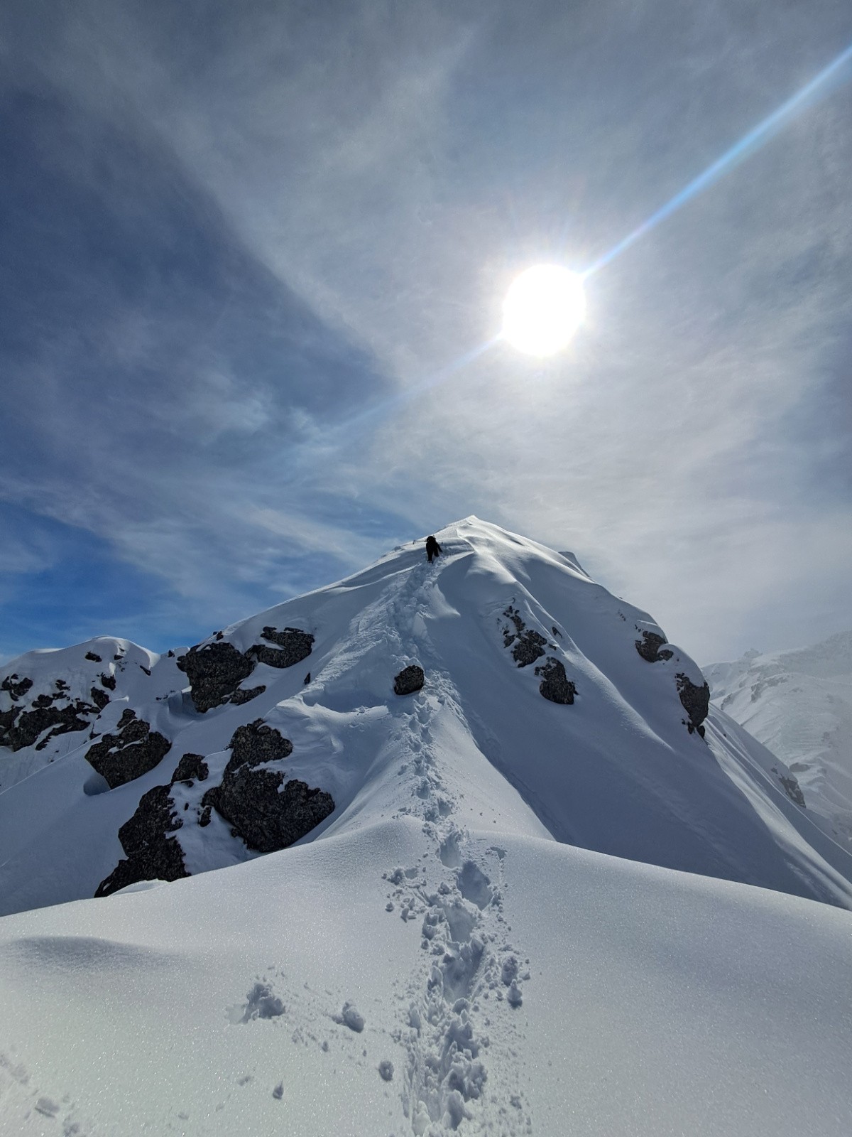 Itinéraire suivi : Perdus dans nos pensées, nous loupons le pas de la Coche et nous retrouvons au pied du couloir NE. Peu tentés de le remonter, nous montons par le couloir E de l'arête N pour ensuite suivre cette dernière jusqu'au sommet. Très belle arête, un plaisir de tracer notre itinéraire et de brasser de la belle poudreuse.