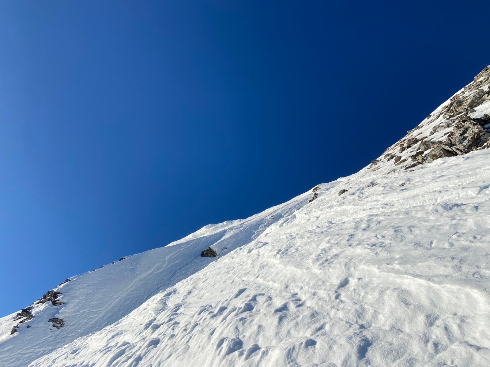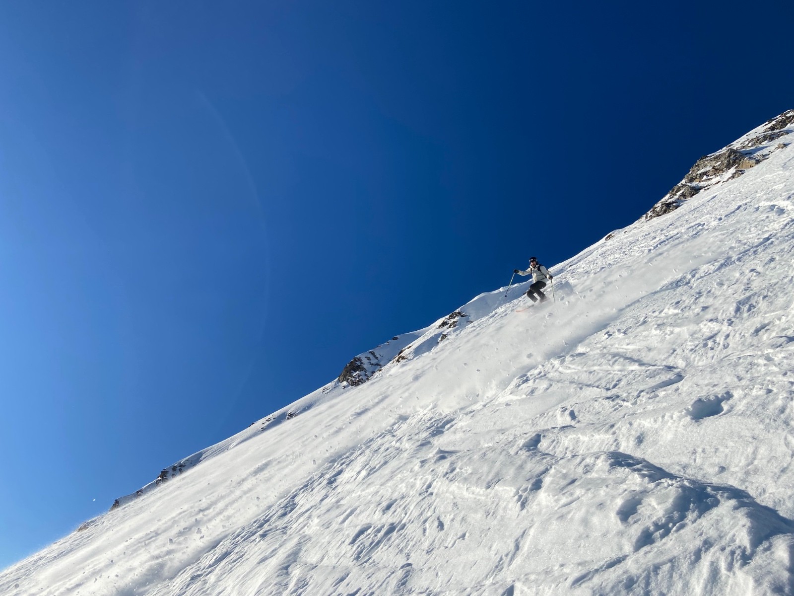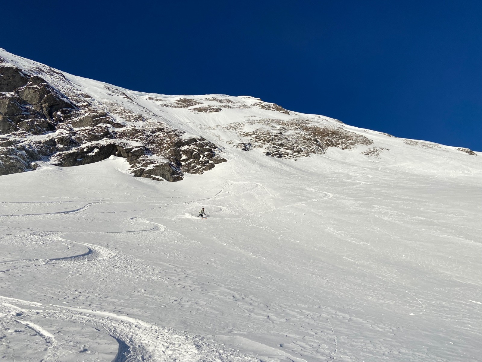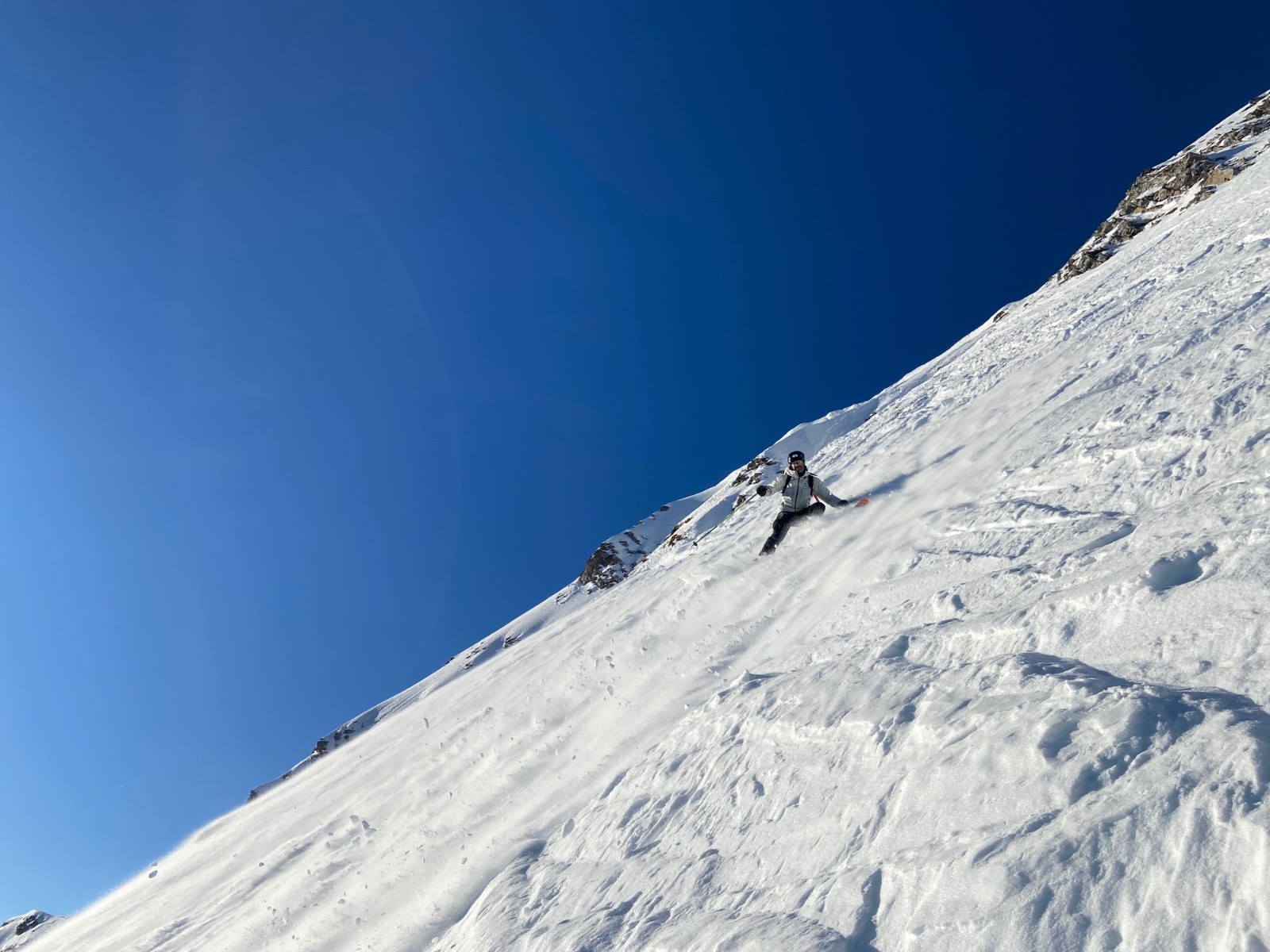 - dans la face, entrée facile. 30-40m en neige trafolée avec fond béton ou sucré, pas facile. En dessous, neige tendre ou poudre, très bon.