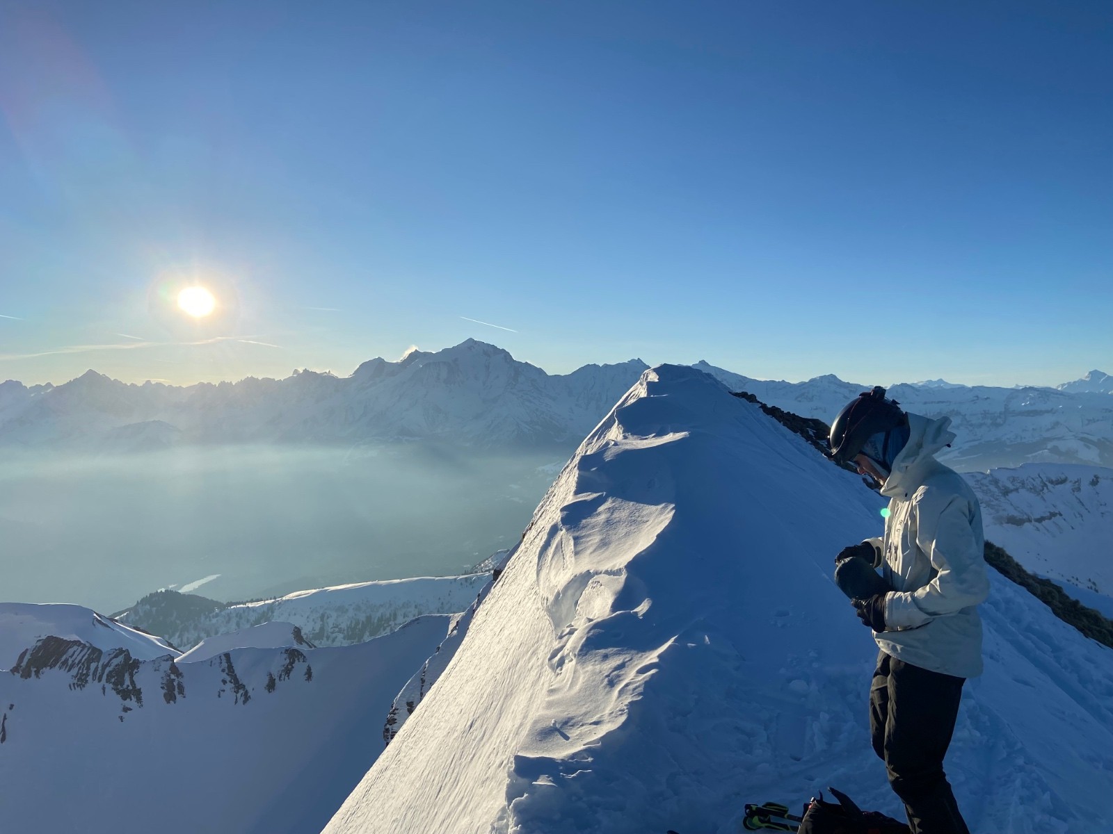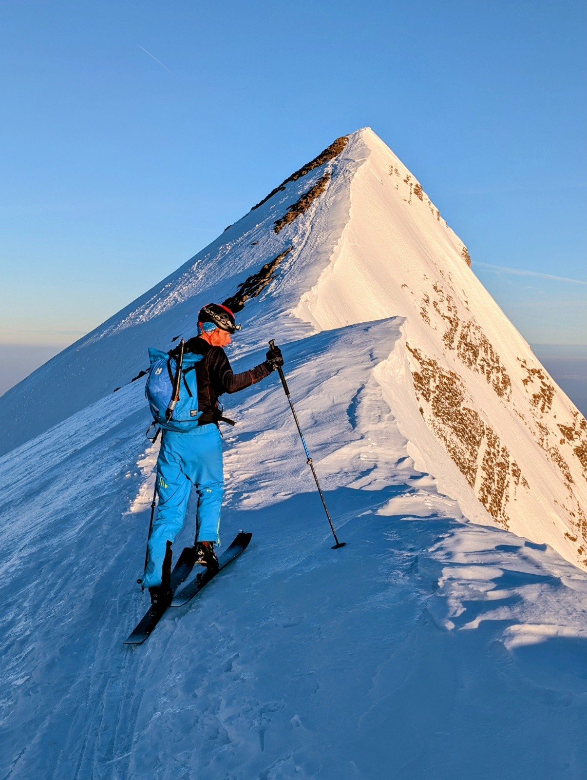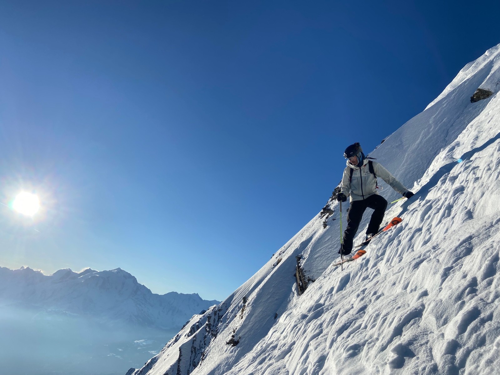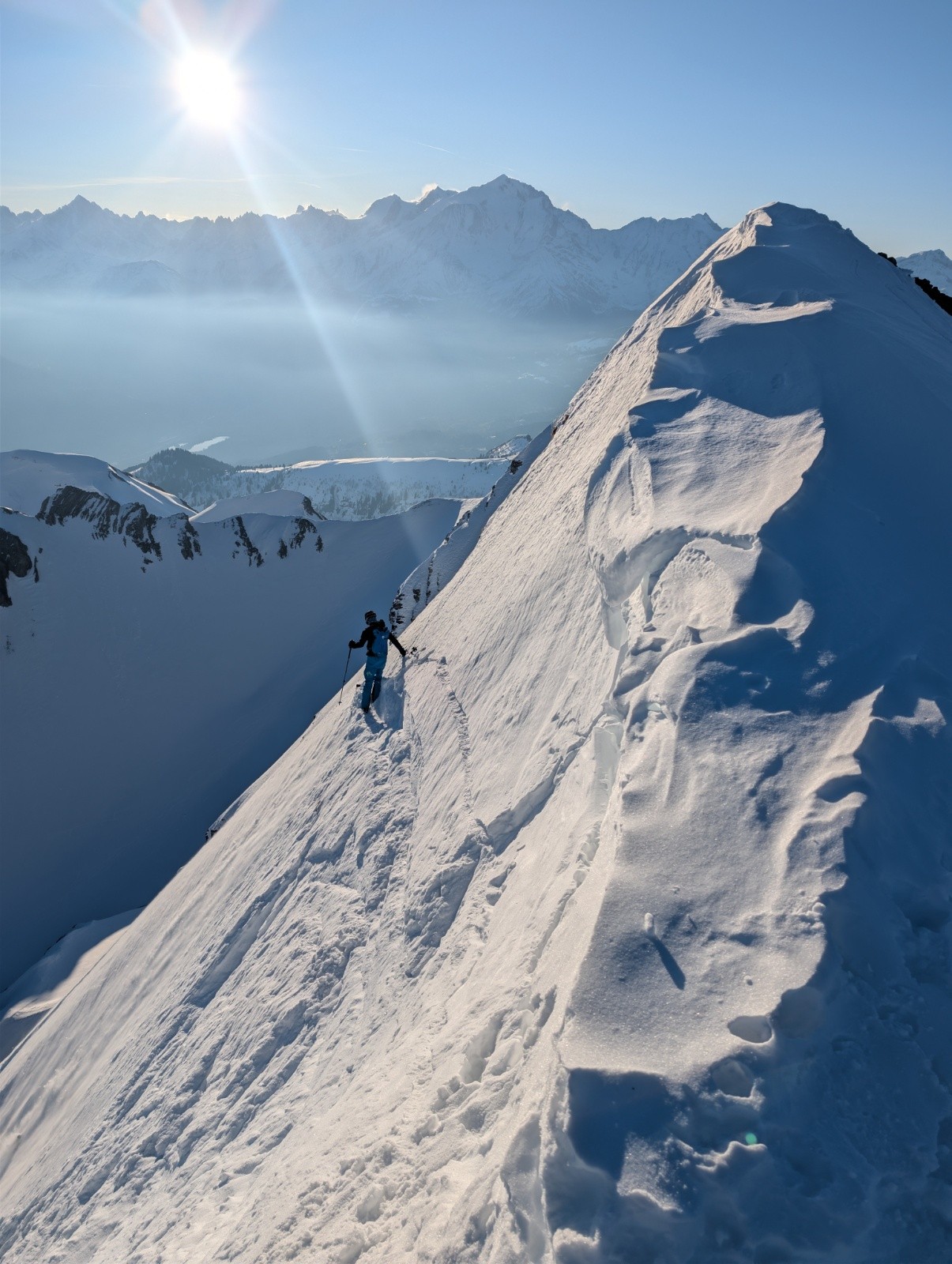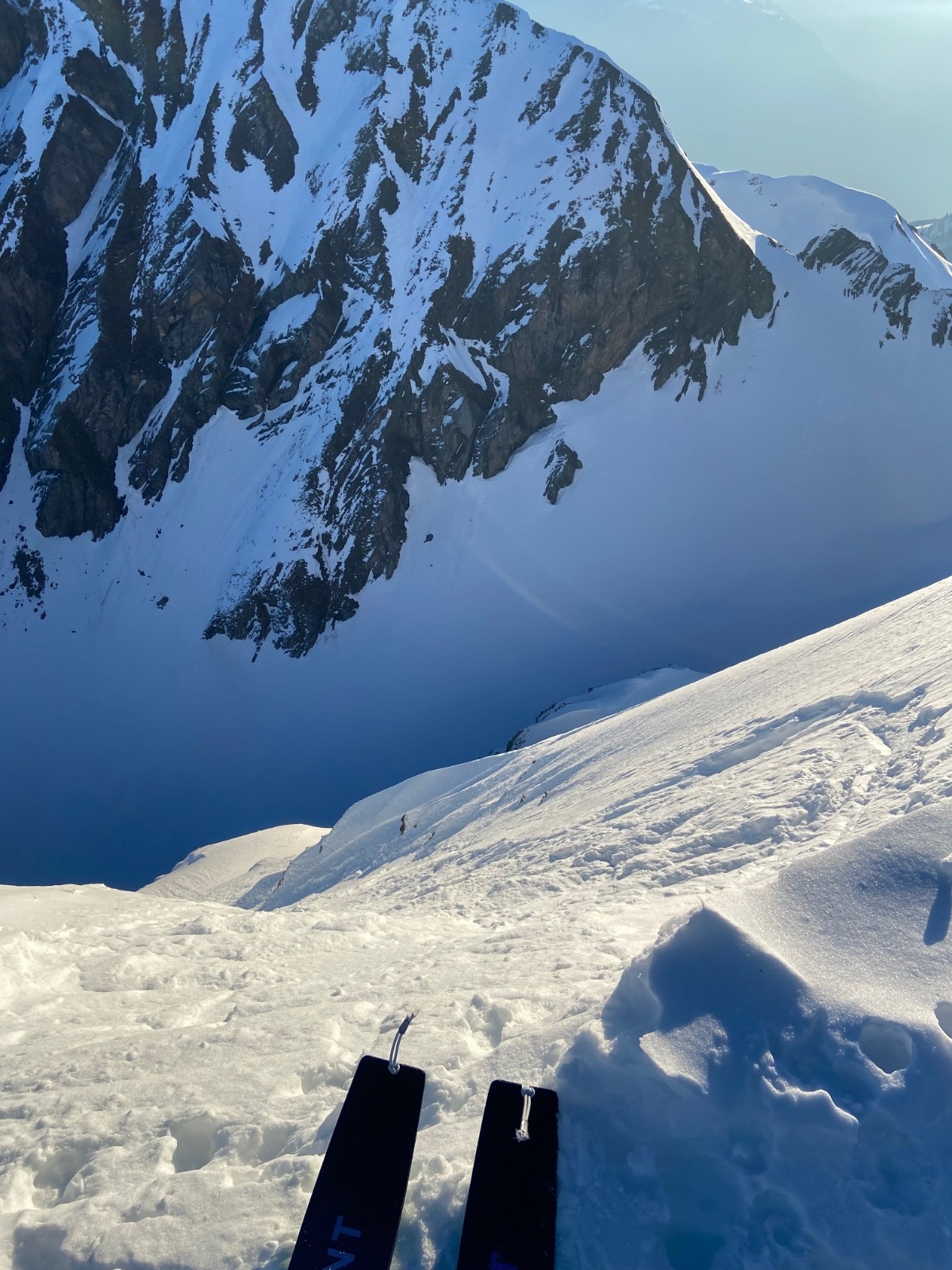 Ce qui est bien avec Arnaud c’est que piste ou pas, le tempo reste le même. J’aurais mieux fait de prendre du matos light… Montée malgré tout efficace jusqu’au sommet ou la face NE ensoleillée semble presque accueillante. Presque parce que bien que court, le haut est mort raide et les traces de quelques prédécesseurs laissent un mélange de neige béton et de sucre au début. Passés les premiers mètres c’est bien meilleur, quel plaisir de claquer des virages dans la pente au soleil avant le boulot. Retour d’abord poudreux dans la Gde Forclaz avant la partie un peu sketchy avec les peaux. A la voiture à l’heure, on peut aller bosser sereinement, les clients peuvent seulement râler maintenant, ça va glisser tout seul!