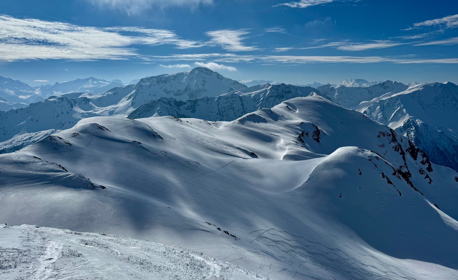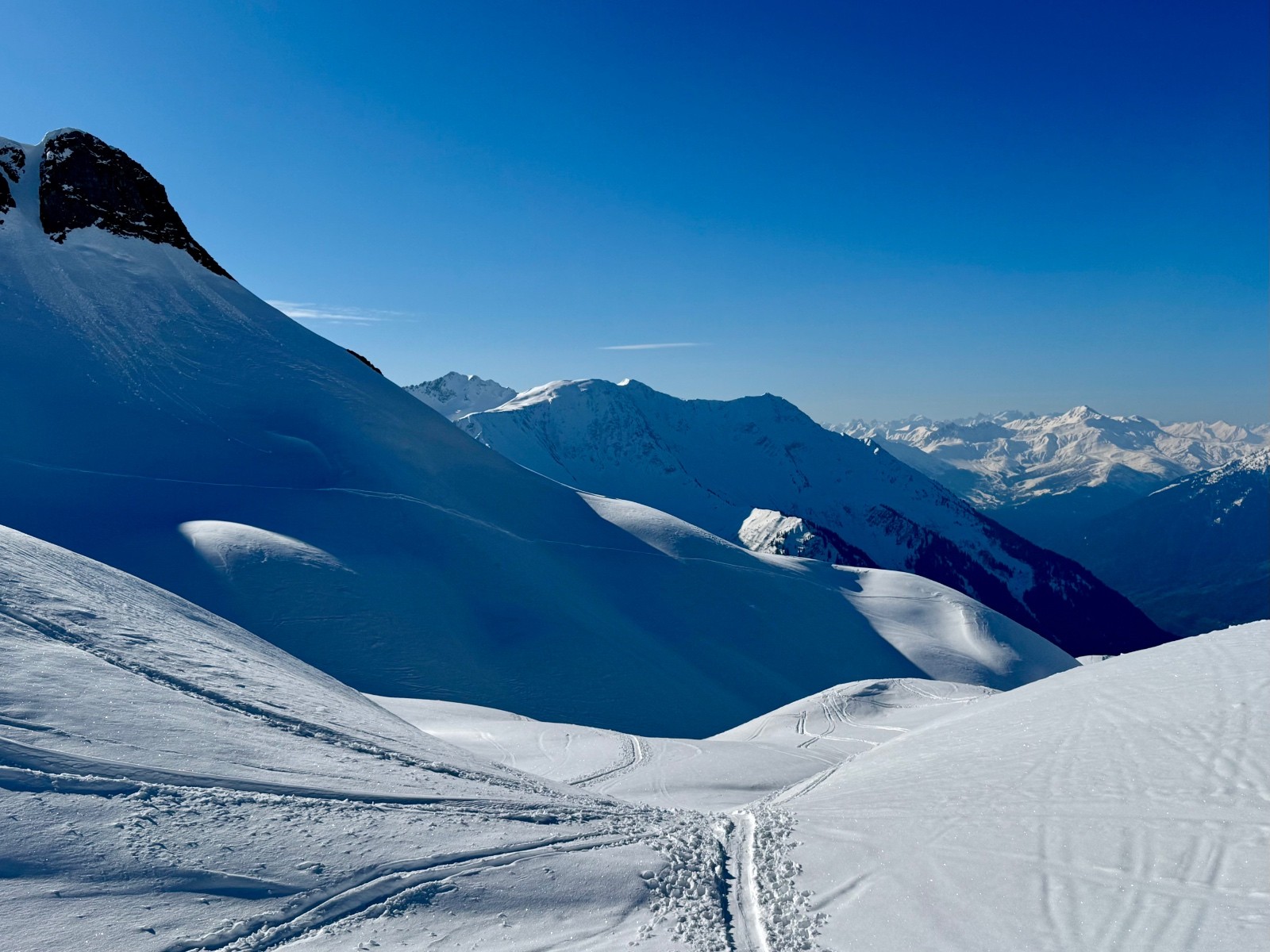 Conditions pour le ski : Manteau printanier de bas en haut, du bon ski même si le petit vent du haut et mon horaire bien matinal (pour garder de la marge avant l'arrivée de la perturbation) gêneront par endroits un bon décaillage.