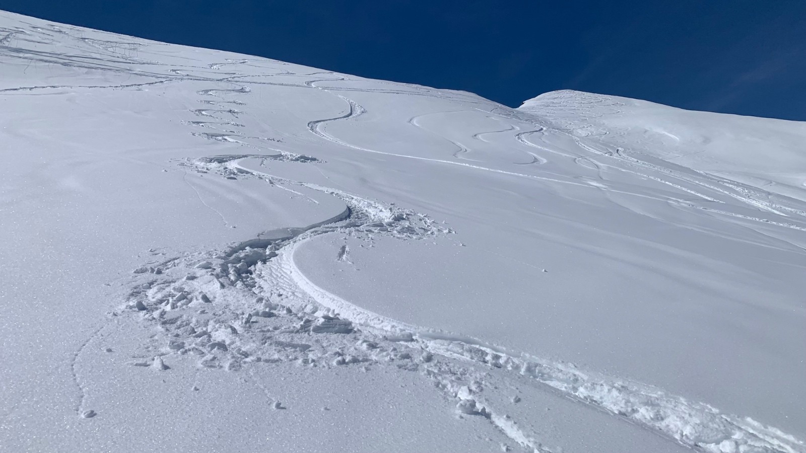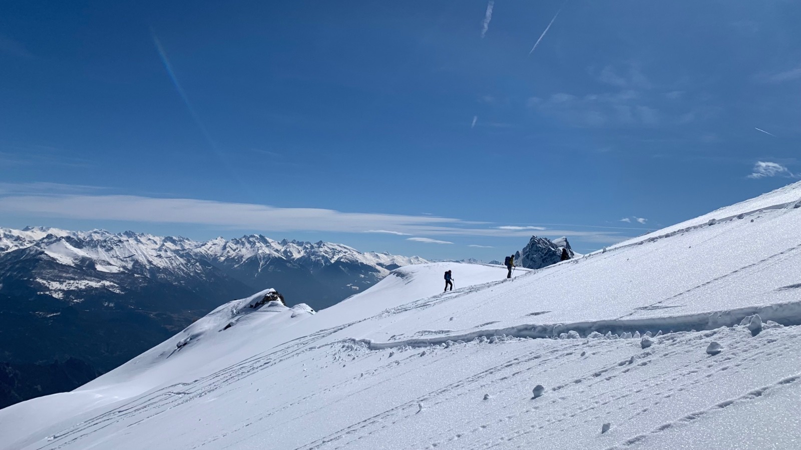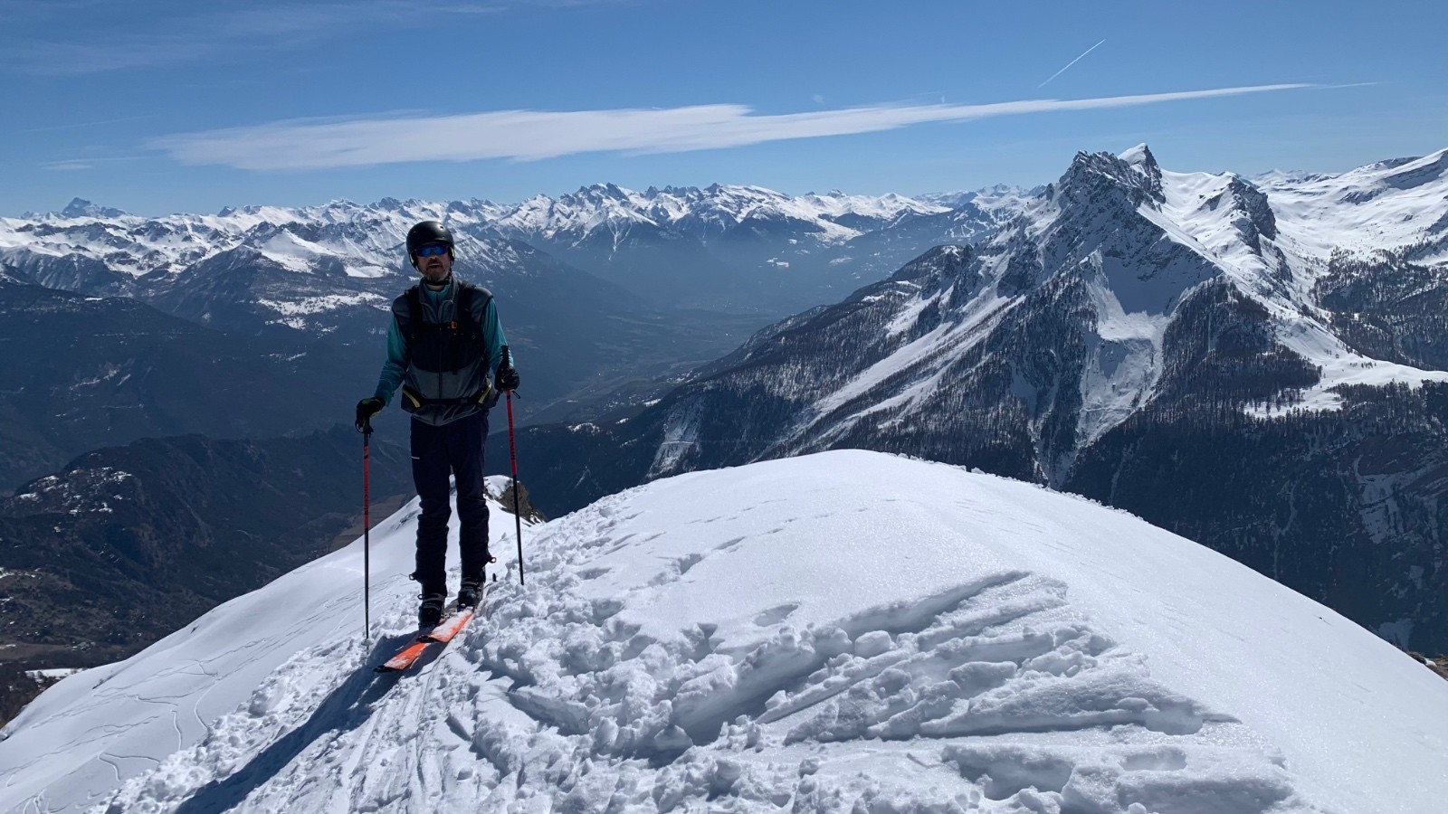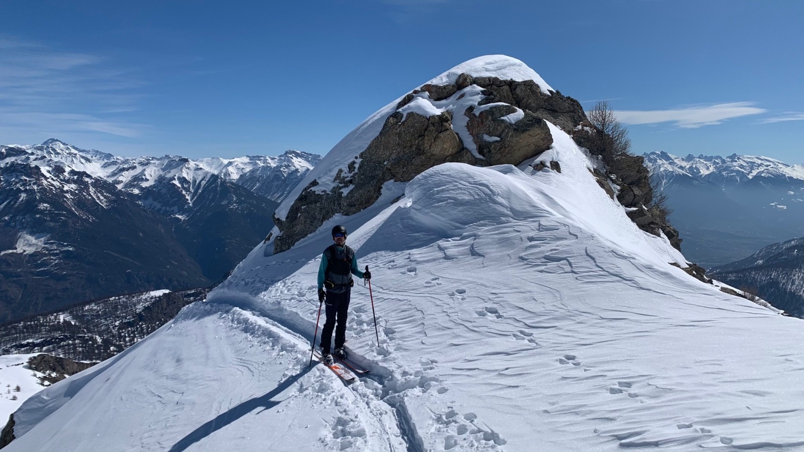 Conditions pour le ski : encore un peu poudreuse alourdie du sommet à l’altitude 2400m. Neige de printemps excellente dessous