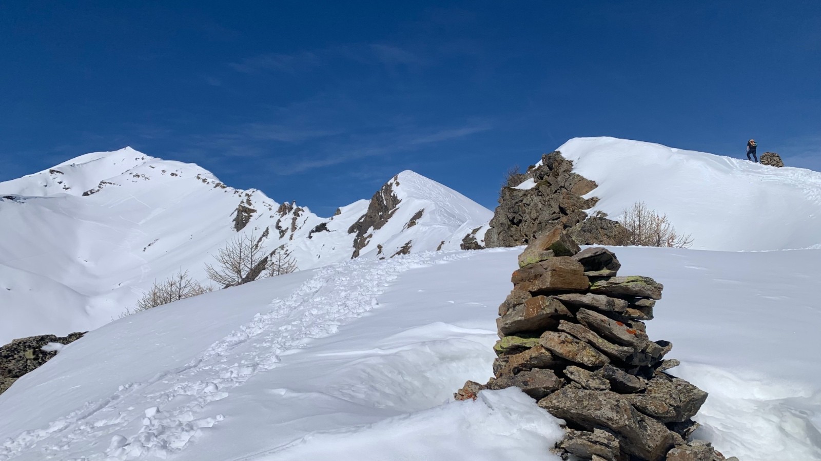 Itinéraire suivi : Depuis le parking, montée par le chemin d’été encore partiellement en neige. Chaussage vers 1650m, on zigzague entre les mélèzes et les arbustes avant de rejoindre la bifurcation sous la Cabane de Clot Saret. Ok choisit de monter par l’arête. Montée efficace et qui permet de profiter d’une belle vue panoramique. Le vallon de la Poua est tracé. Du monde sous l’Etoile.
