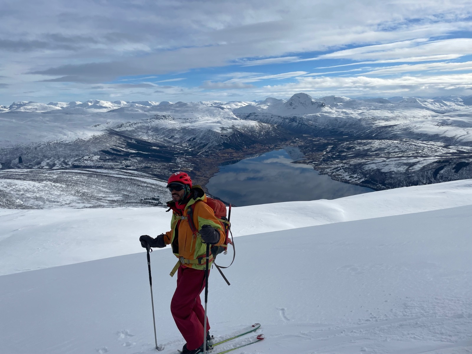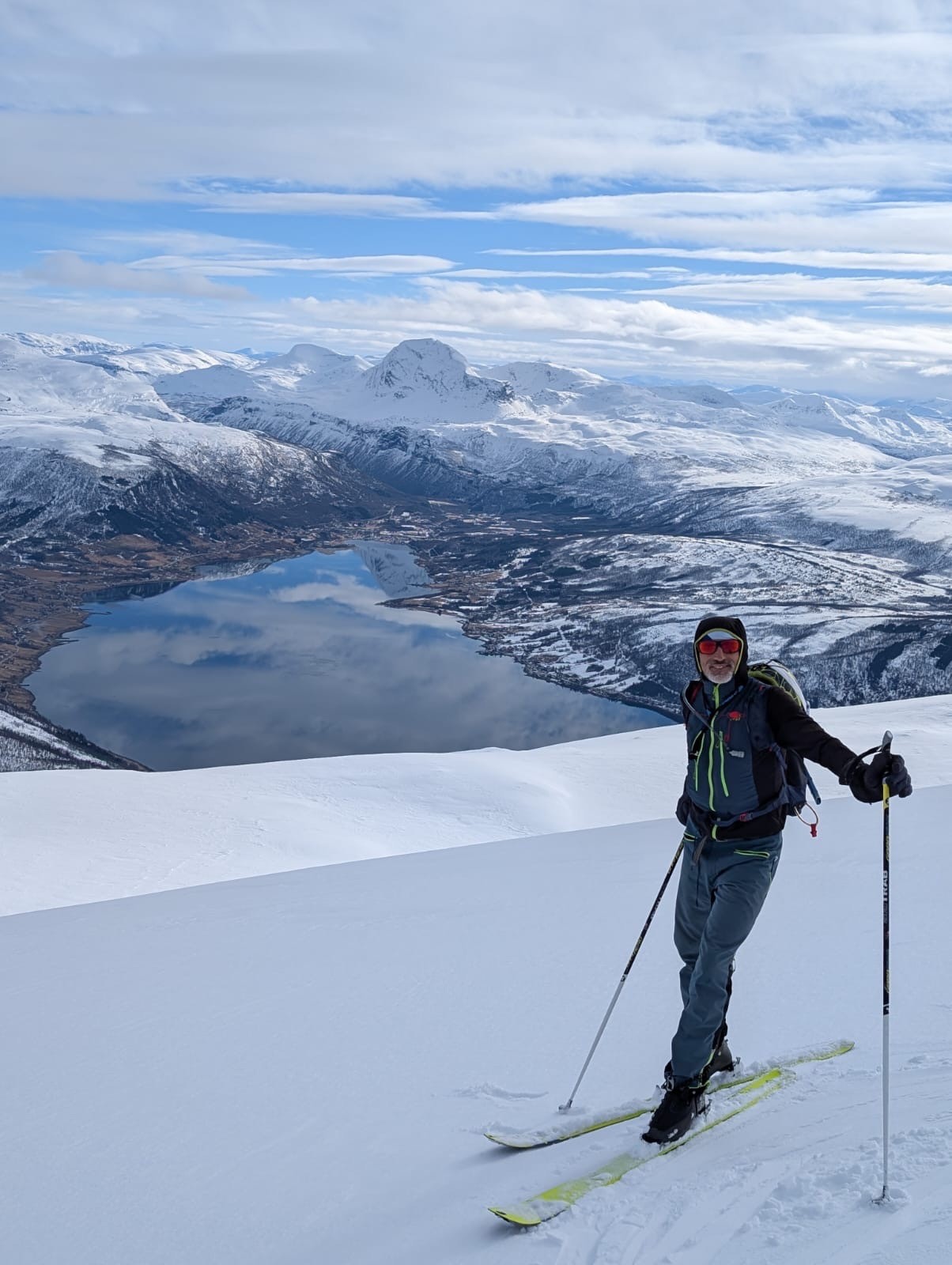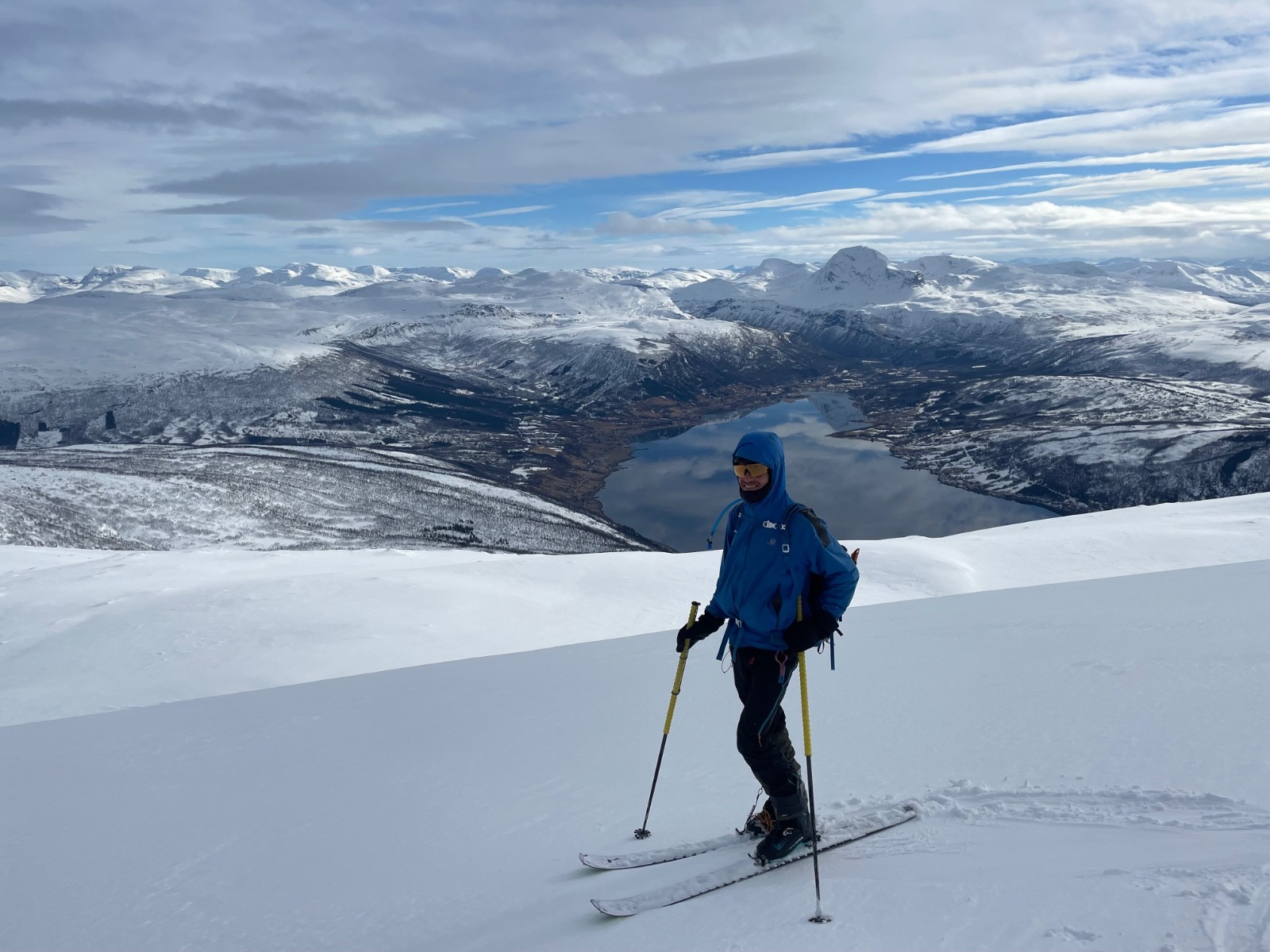 Sommet facile. Descente SE en bonne neige avec une vue magnifique sur le fjord et une belle fin dans la forêt de bouleau.
