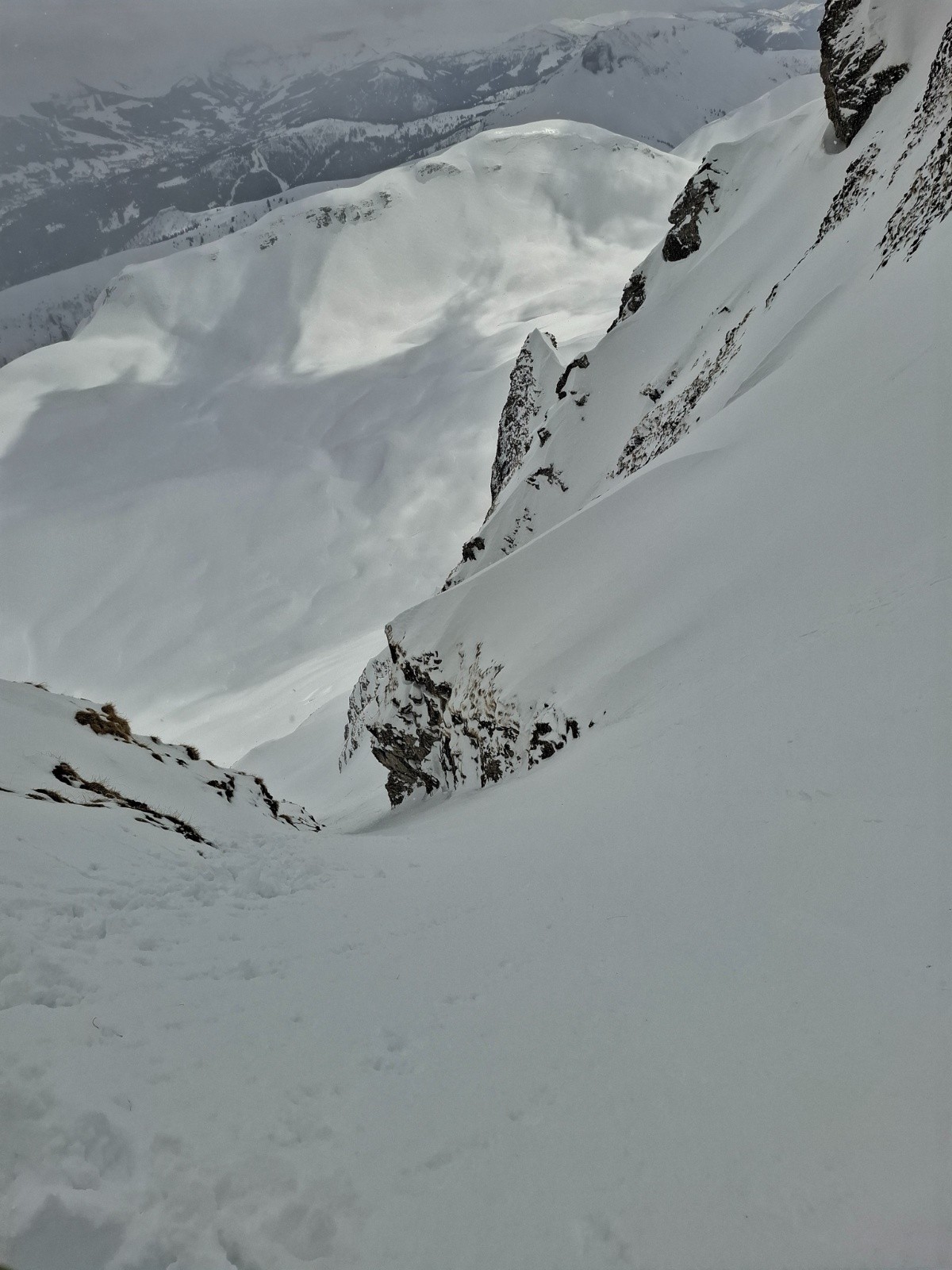 On a bien galeré la première partie du couloir, large, au soleil et grosse neige qui enfonce...on a eu des doutes sur la possibilité d’arriver en haut. Une fois dans le rétrécissement plus moyen de monter a ski. On a sorti les crampons (guigui n y croyait pas de trop) et sommes montés en allant chercher le cote Sud pour espérer y trouver moins de neige :bonne pioche ! (Que nous n’avions pas prise....mais ça a fait sans !)