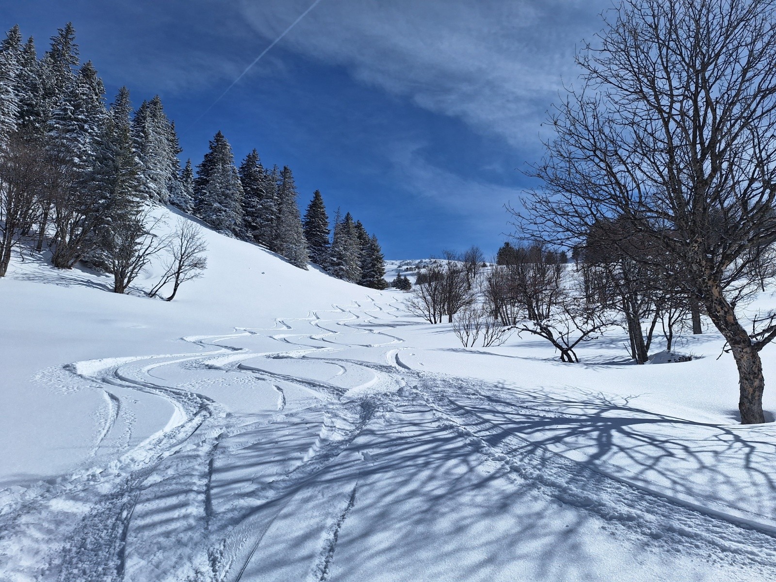 Tête des Muets Est: poudre lourde puis plus légère mais parfois travaillée par le vent à mesure qu'on se rapproche de Vormy.