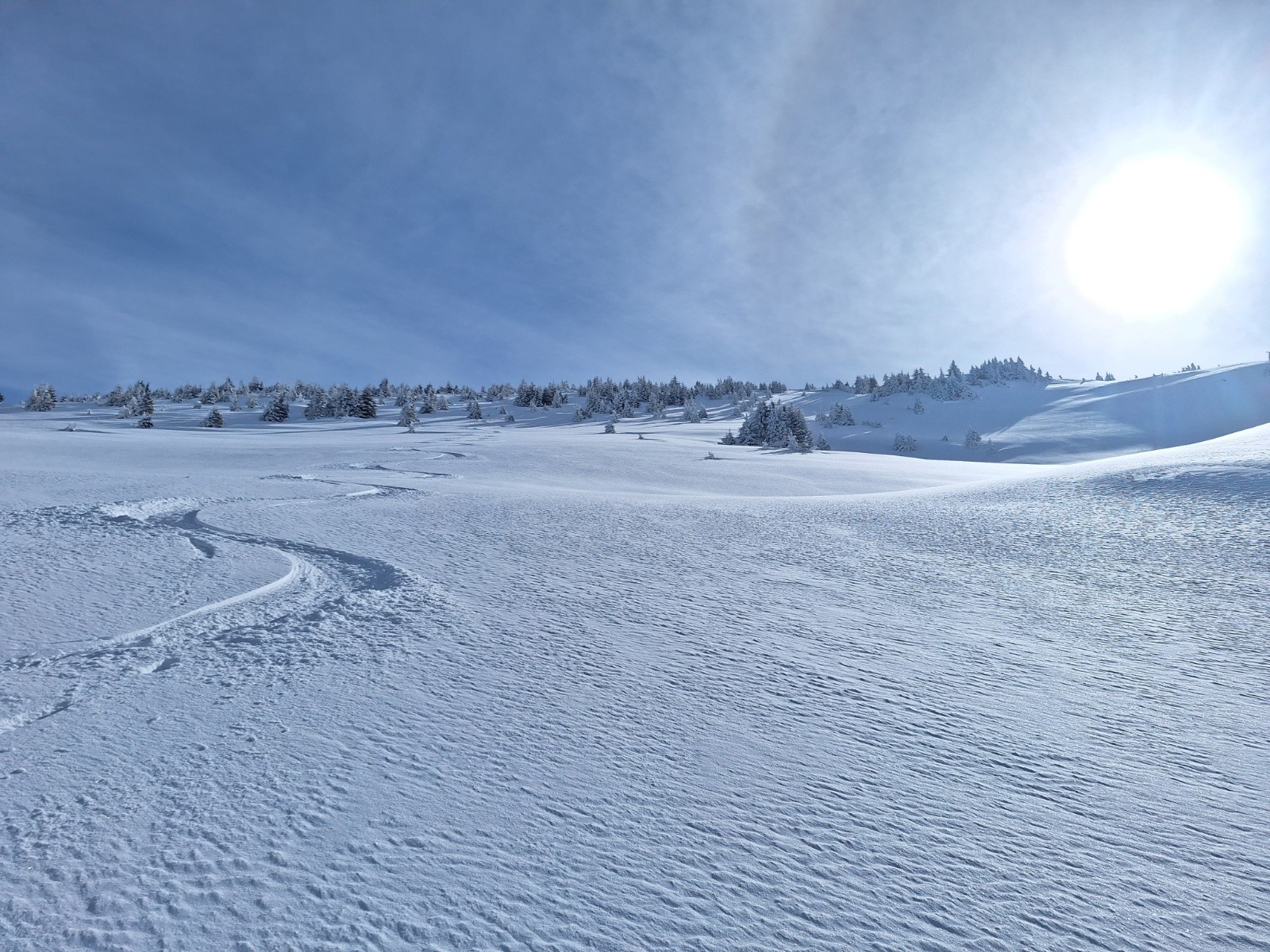 Nouvelle belle descente jusqu'à la lisière de la forêt puis je recolle! Je suis une trace unique plus proche de la crête (merci au traceur), rate de peu l'entrée de la combe à gauche de la Pointe du Château puis trace celle-ci jusqu'à la Gueule à Vent... pas trop moyen d'éviter une traversée de 6km cette fois-ci 😅