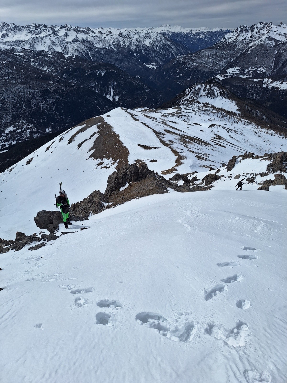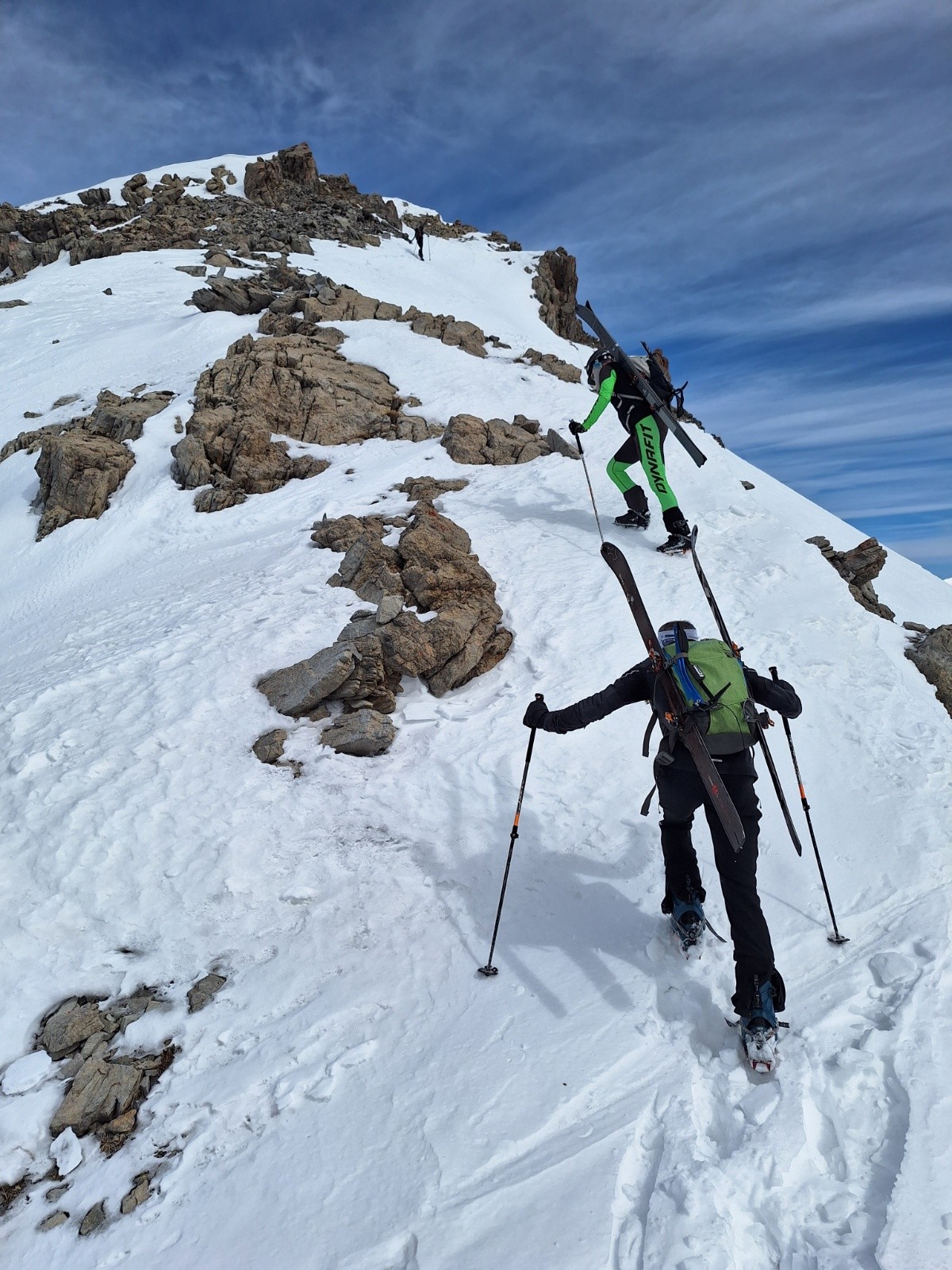 D'abord à ski sur l'arête, puis dans un court mais beau couloir bien raide. On ne quitte plus les crampons jusqu'au sommet, splendide.