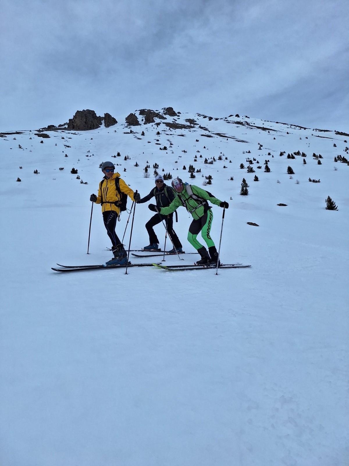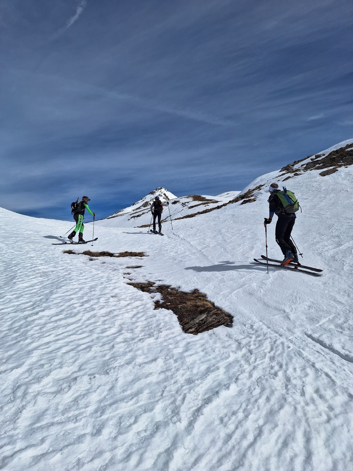 Pour éviter le bois deneigé du départ, on file plein Sud. Bonne pioche, le névé nous descend sous 1900m.