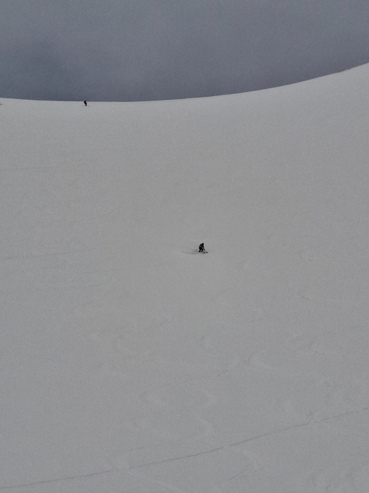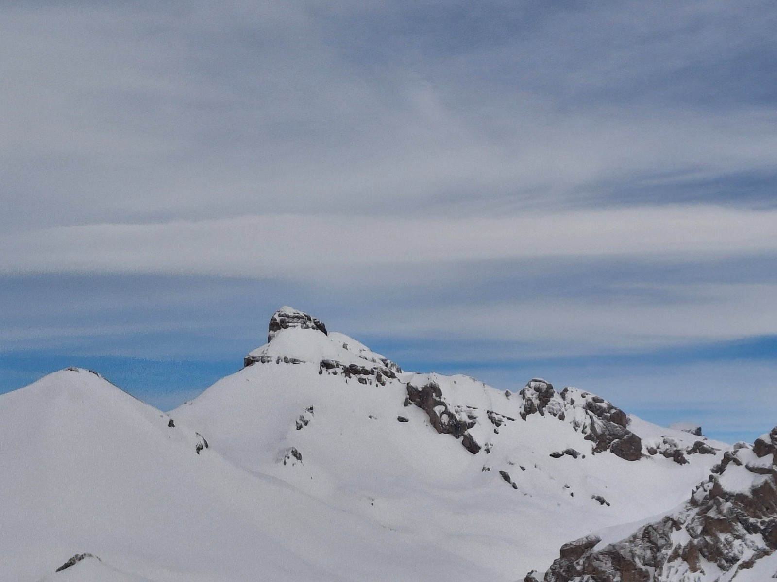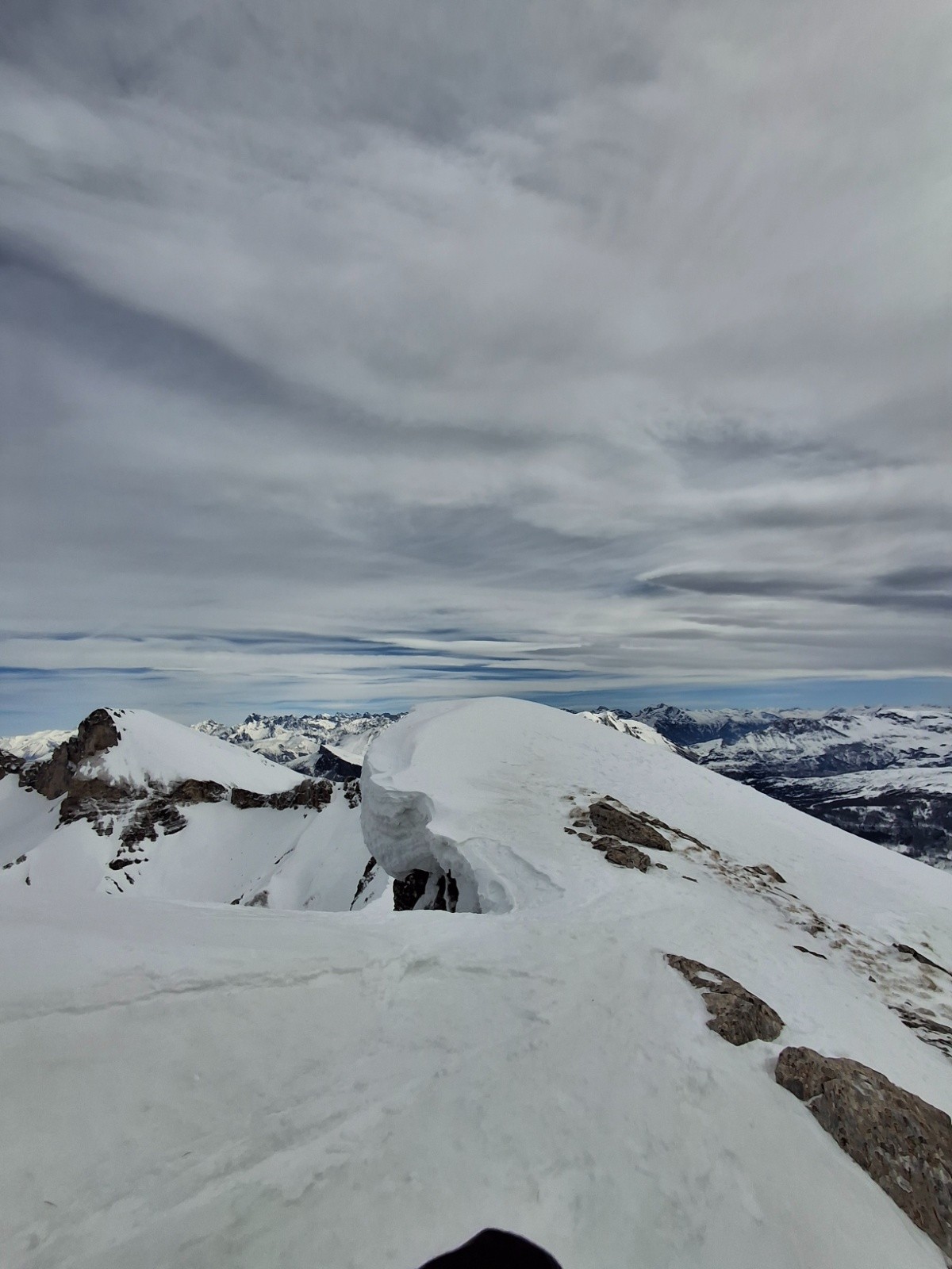 Conditions pour le ski : bonnes. Neiges hétérogènes mais toujours bien skiable. Poudre tassée sous le col avant le sommet en neige dure et ventee.
