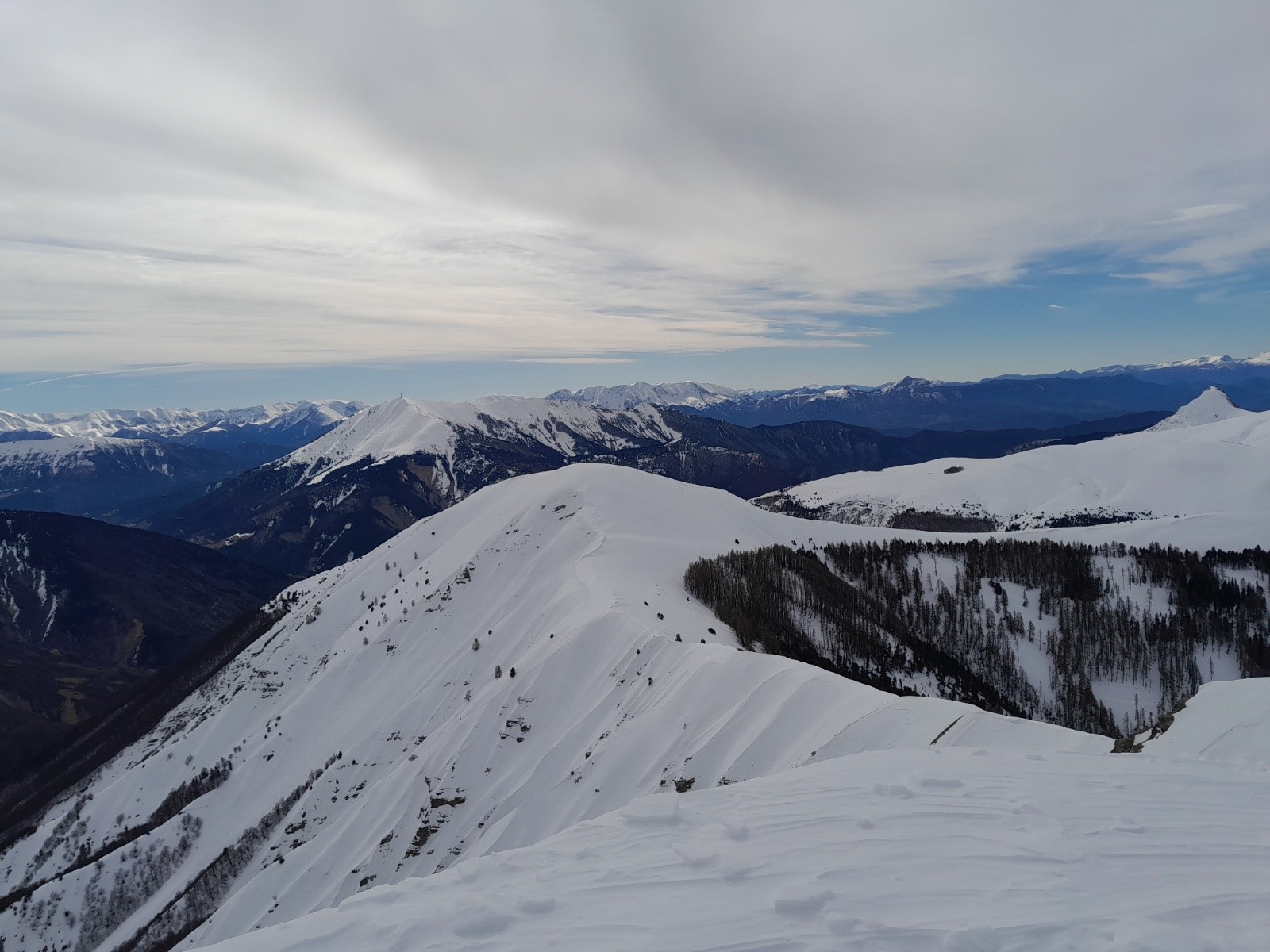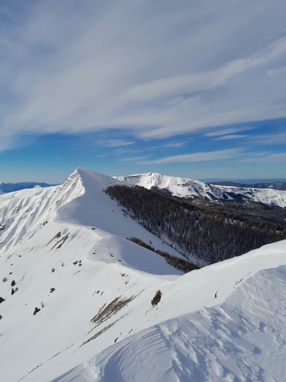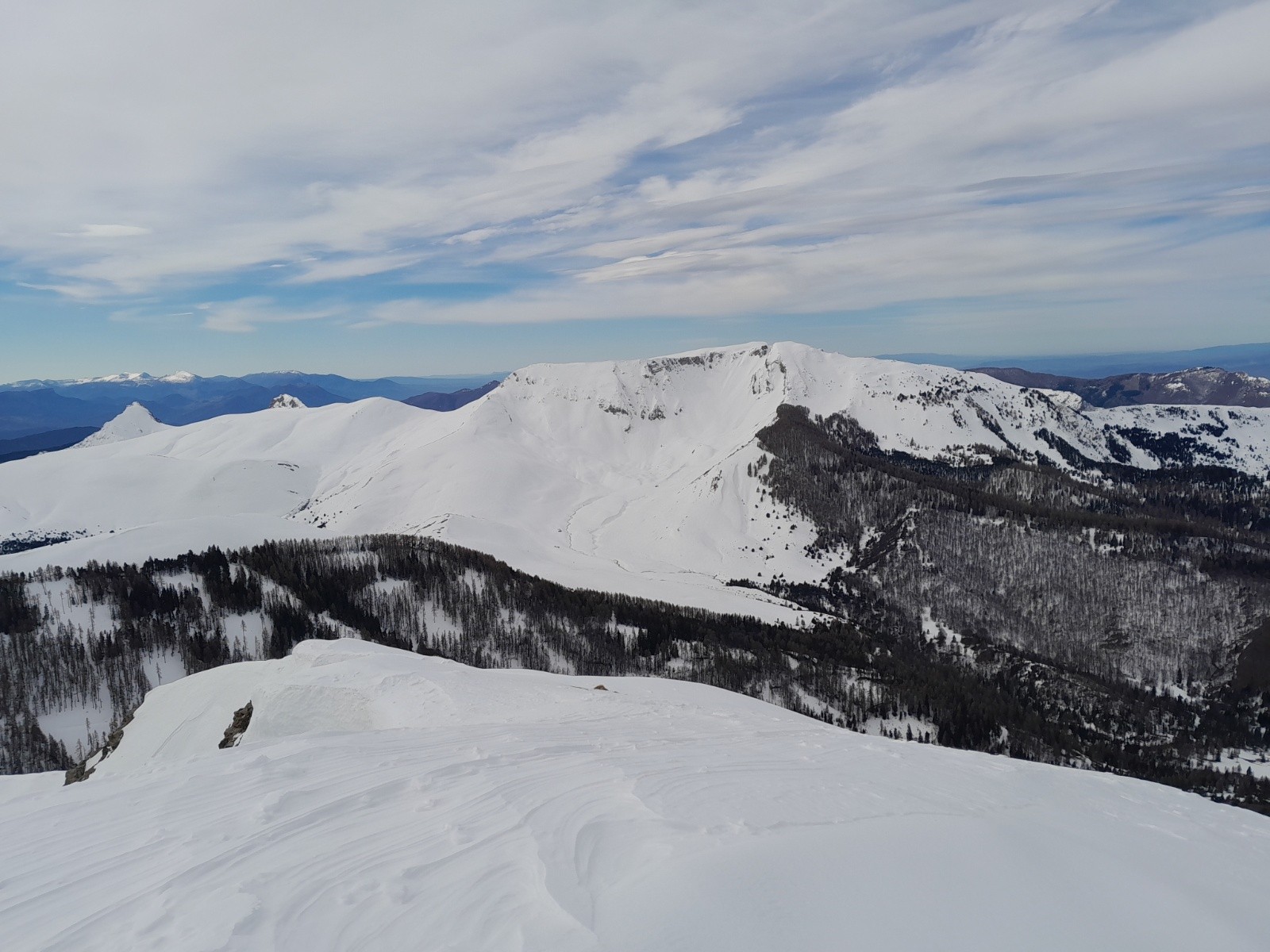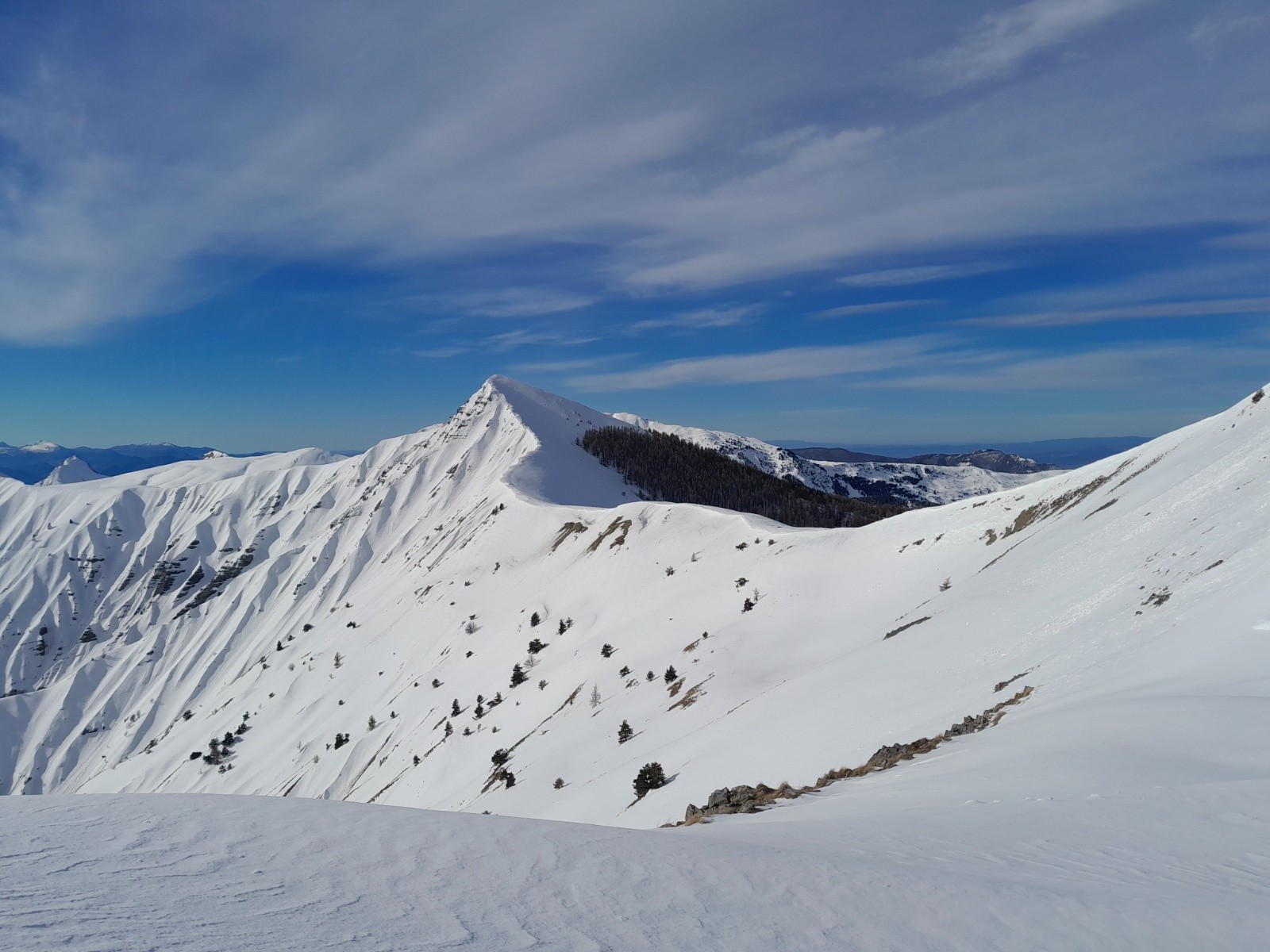Conditions pour le ski : globalement correcte mais de tout (du dégueulasse à très bon). Croute infâme en N et NE mais parfois de la poudre ***. Neige soufflée proche des crêtes **. Neige dure ailleurs allant du très dure *** au plus souple **** (pas de décaillage)