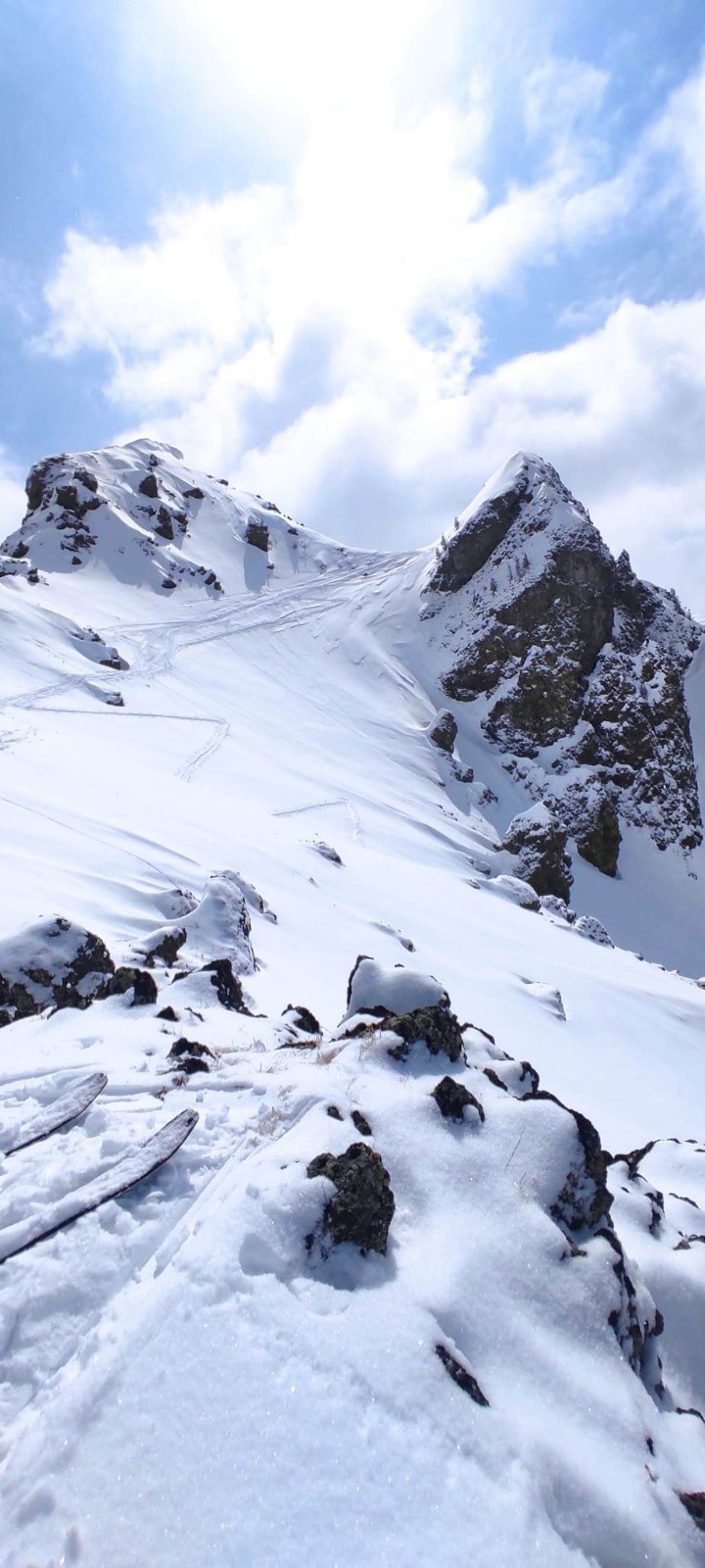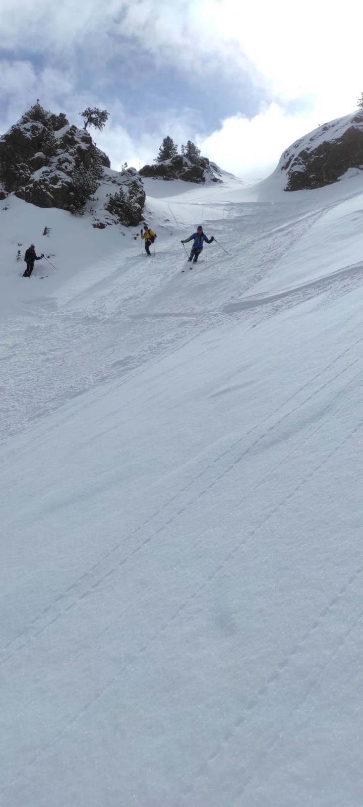 Pour la descente, plein Nord, on se dirige a main droite sous la Loubatiere dans un couloirs que l'on avait déjà skié en 2025., énorme, une bonne poudre vierge que l'on peut skier après avoir déclenché un sluff rassurant, car c'est raide sur - 250m.