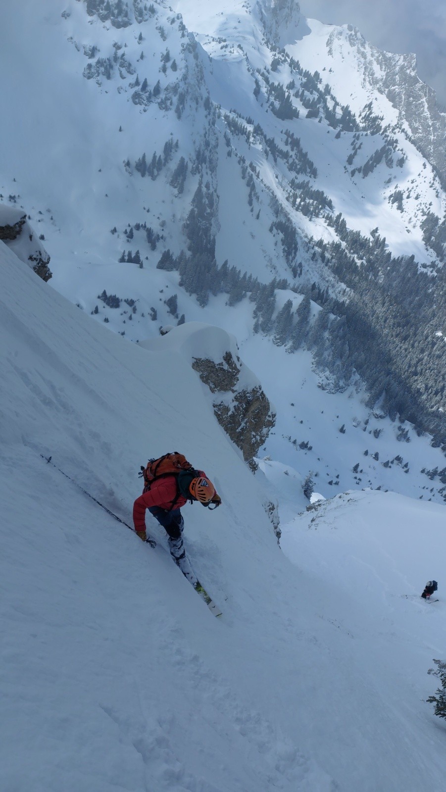 C'est clair que la skiabilité était parfaite. On a fait des virages partout, même dans le verrou habituellement sec. Mais c'est au prix d'une nivologie pas idéale. Le premier a skié 2 x 30m encordé (au départ, puis assuré depuis le petit sapin au-dessus du verrou). Bien content de pas être seul aujourd'hui !
