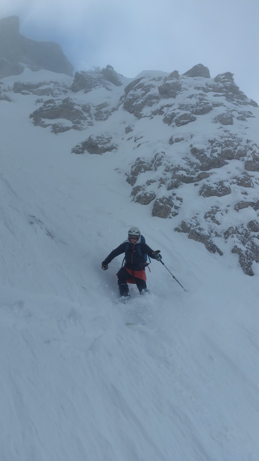 Conditions nivo et activité avalancheuse : neige froide un peu dense par endroit. 20m sous le sommet et encordé, on a déclenché une plaque friable de 10cm qui a purgé le couloir. Mais on a déclenché une 2me plaque friable (10cm) sur une contrepente un peu en hauteur rive droite au milieu du couloir.