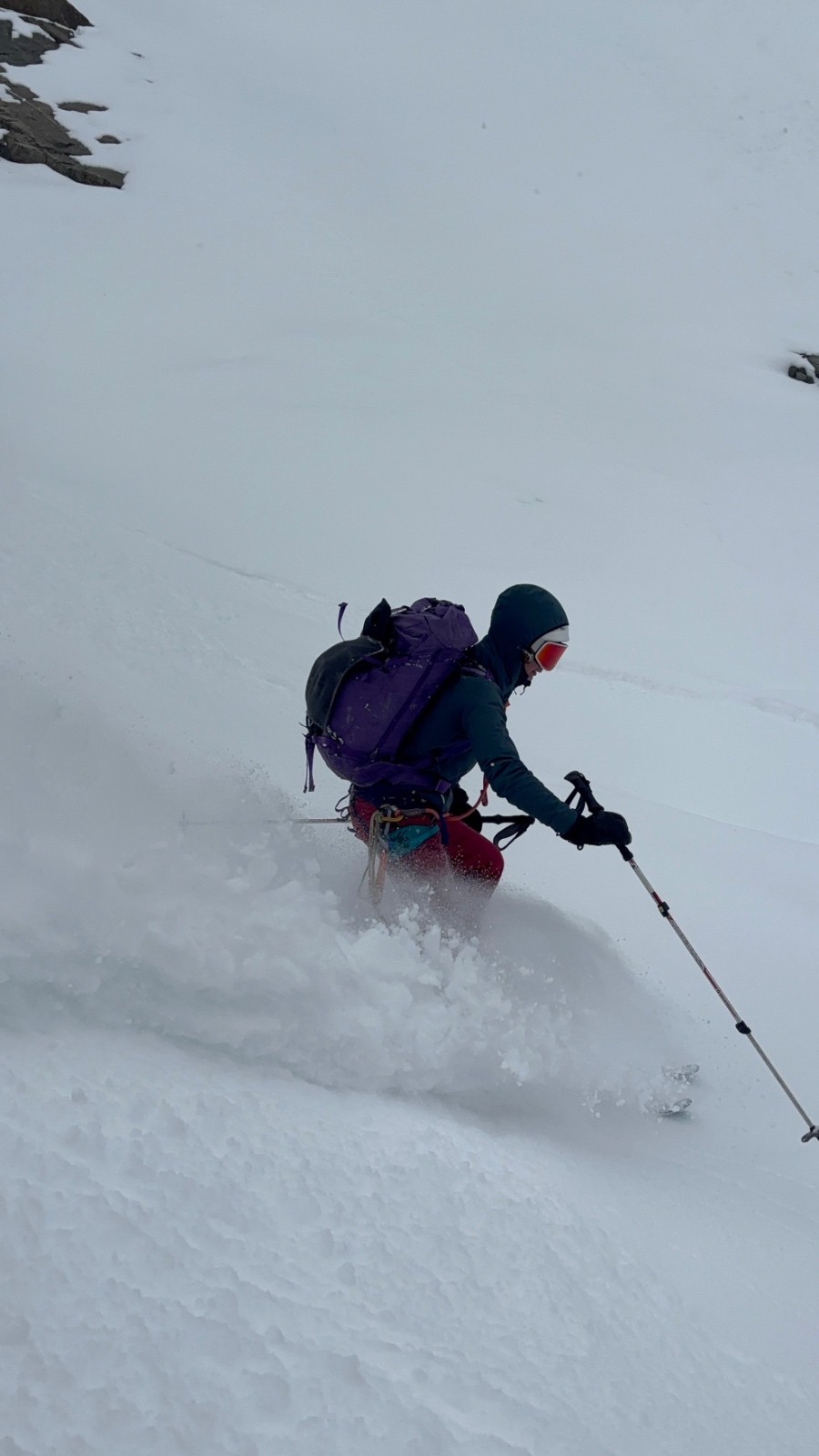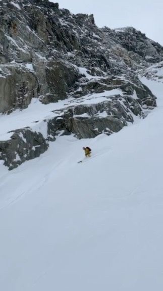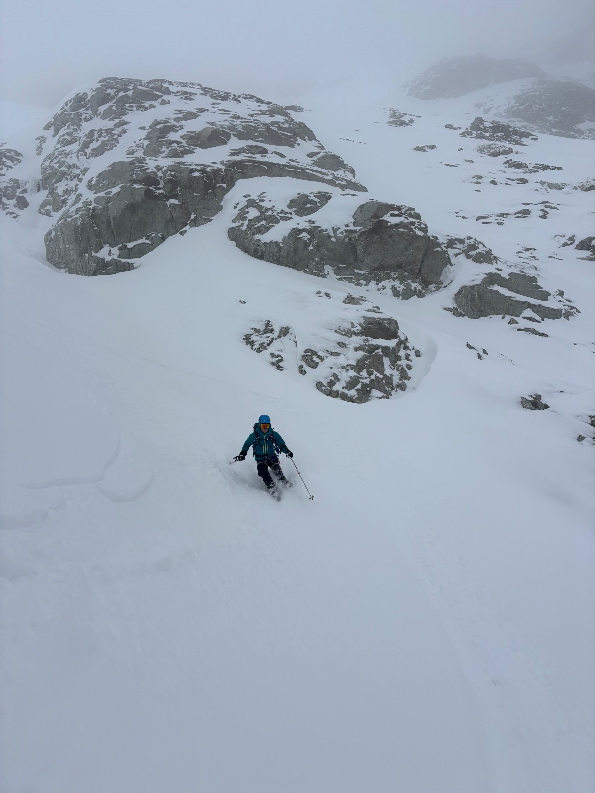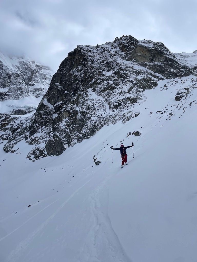 Les champions du rösti retrouvés, le trio aborde le Couloir des Poubelles, non sans quelques doutes quant à une semblable corniche en entrée du large couloir, qu'il controunera par la gauche. Crrrr crrr voilà les pierres. Les 700m offrent de bonnes sensations, le vent a travaillé durant la nuit, ici de la neige dure à nue, là 40 de poudre sur 15m. Pas de plaques, pas d'accumulations alarmantes, vue l'exposition faible du couloir.