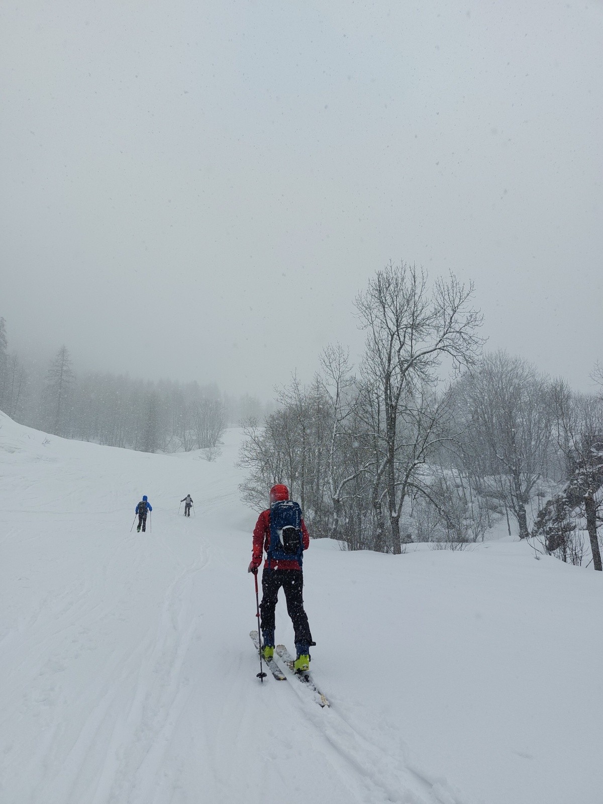 Départ sous la neige à gros flocon, il a neigé la nuit au refuge à 1600 et ça continue. La météo annonce que ça doit s'arrêter entre 10h et 12h, effectivement ca s'arrête après 30min du départ.