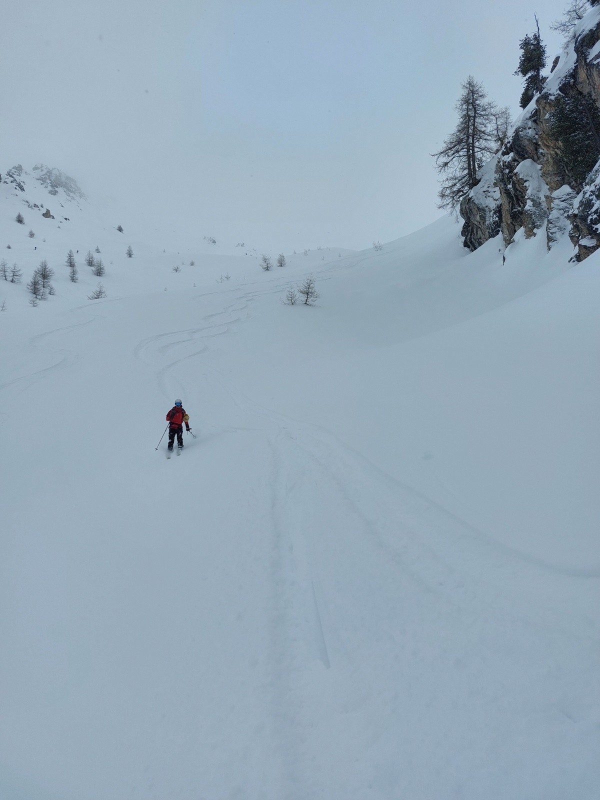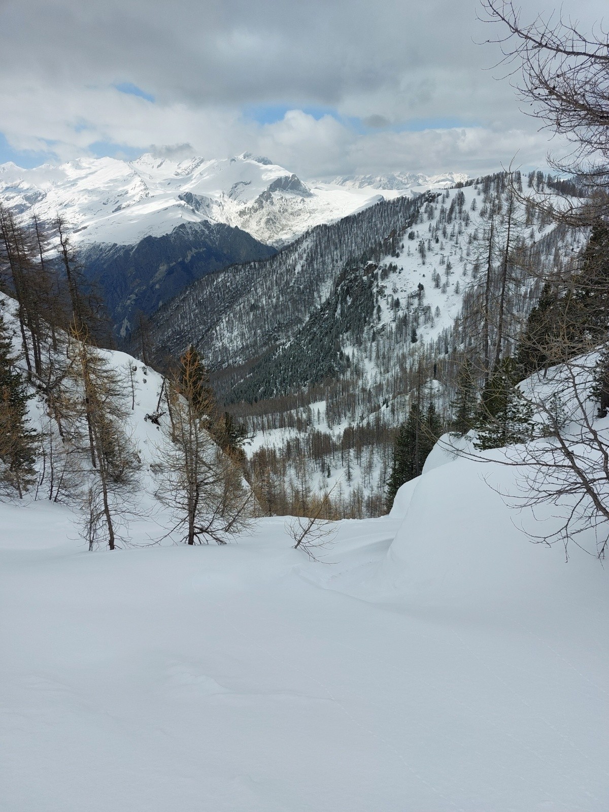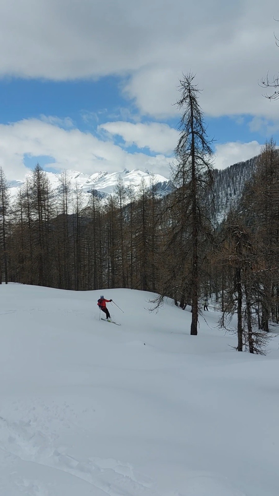 Première descente full poudre jusqu'au chalet privé, on sent le fond dur sur les parties raides. On repeaute pour remonter jusqu'au passage Nord vers la combe du Petello, on fait du rab' mais c'est plutôt crouté pour ce qui a déjà vu le soleil. Bascule en Nord : poudreuse 5* sans fond, le passage passe très bien et ça déroule dans la forêt. On se laisse embarquer sur une crête très ludique vers Grangia Ussiera, ce qui nous oblige à repeauter 20m pour retrouver le vallon de descente. On dérange un chamois solitaire juste au dessus du village de Chialvetta, pas farouche (on est sûrement moins bruyants que les locaux...).