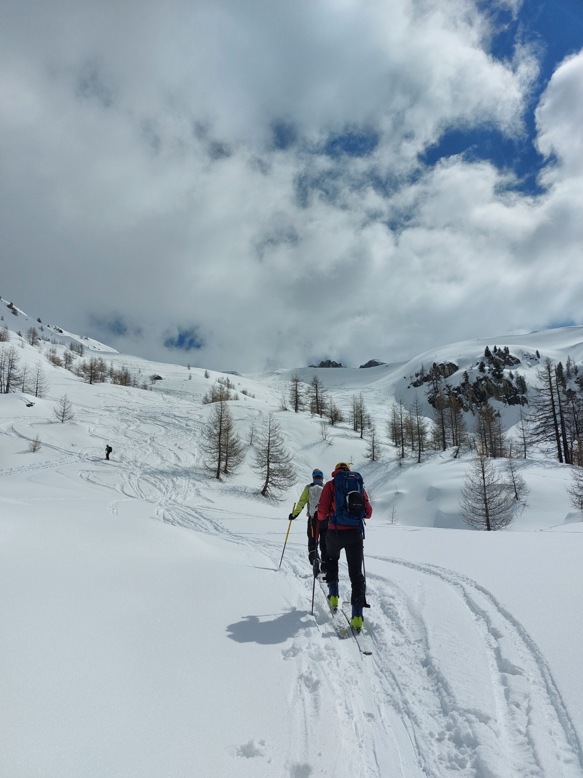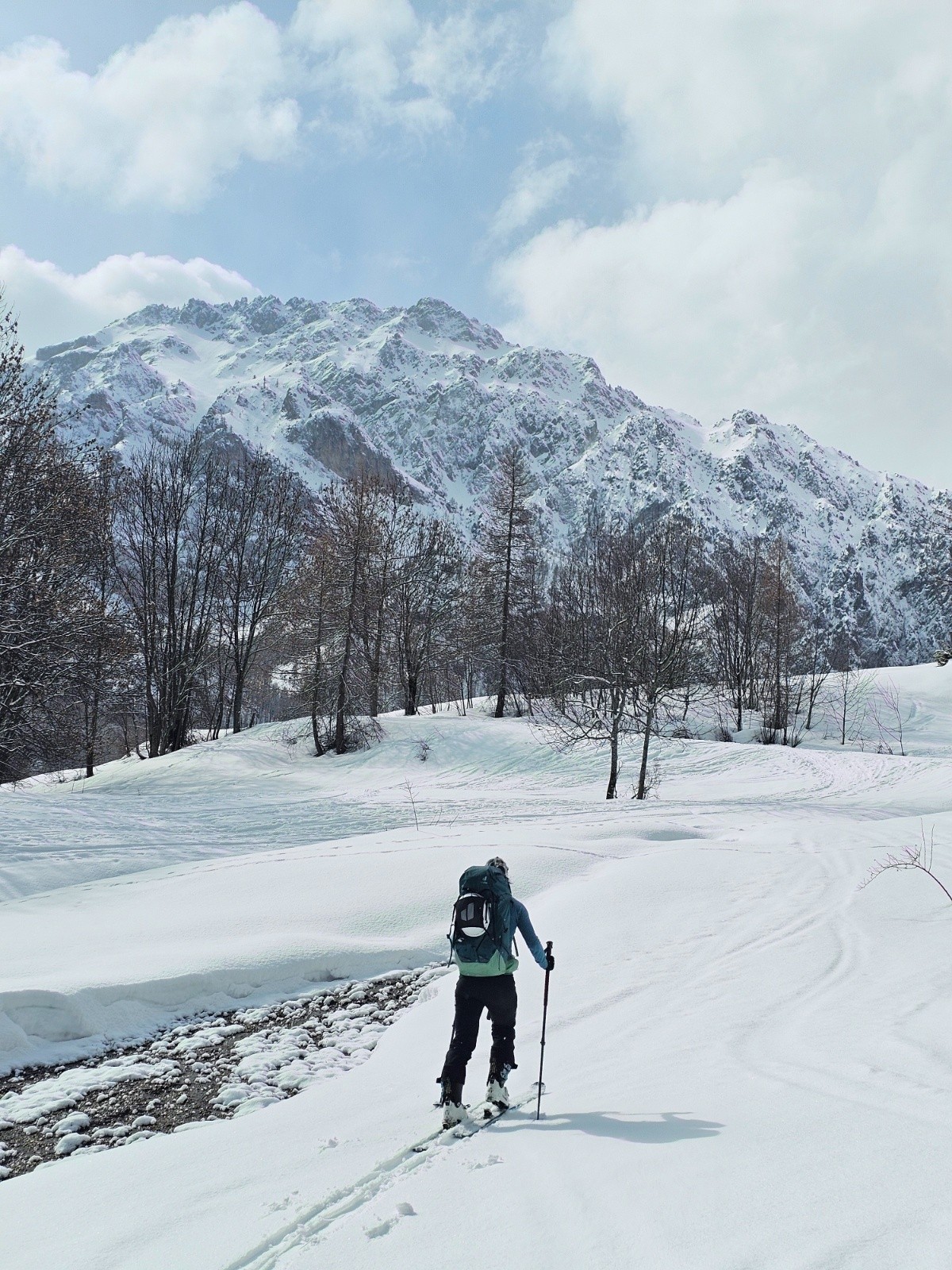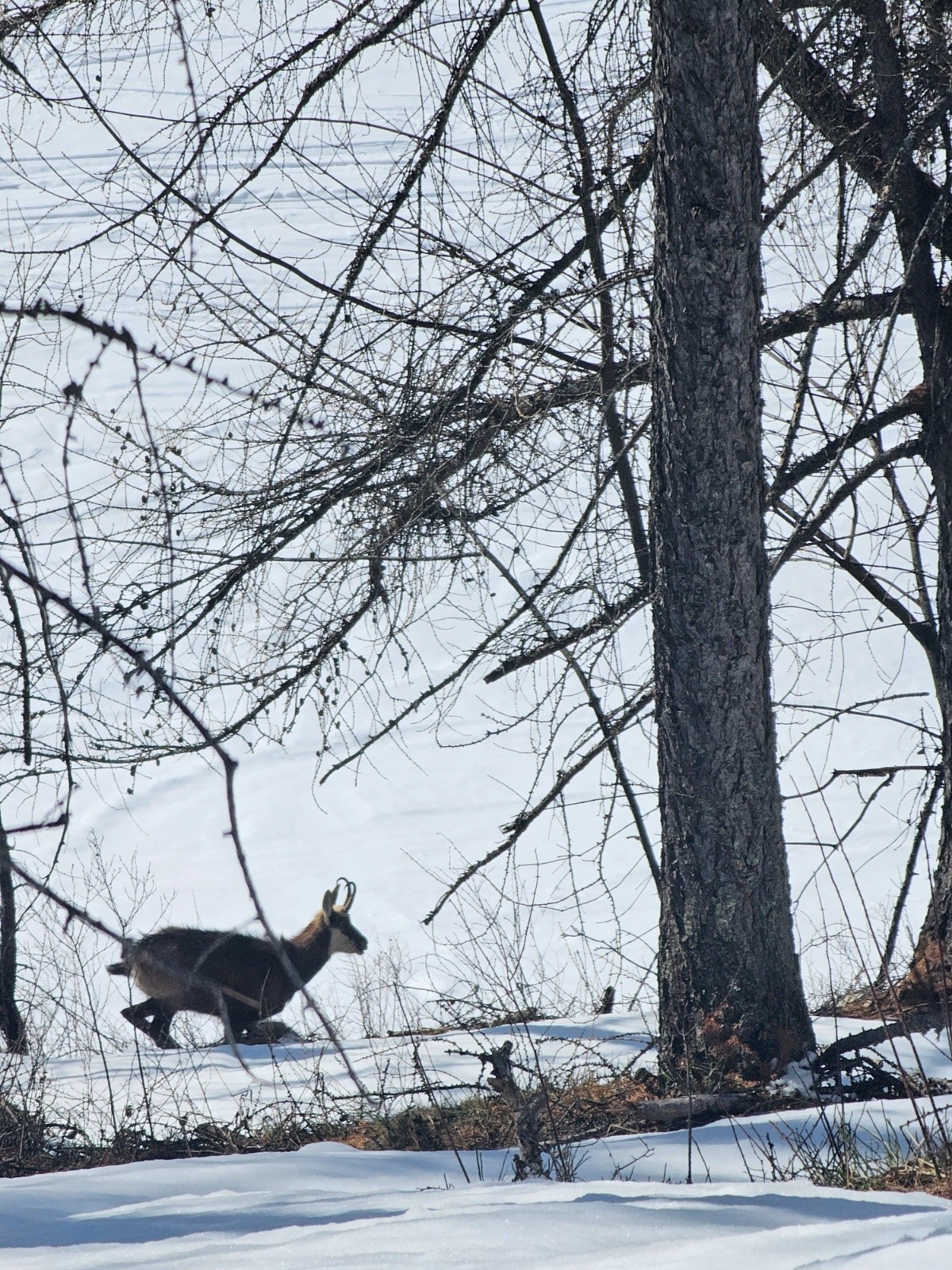 Première descente full poudre jusqu'au chalet privé, on sent le fond dur sur les parties raides. On repeaute pour remonter jusqu'au passage Nord vers la combe du Petello, on fait du rab' mais c'est plutôt crouté pour ce qui a déjà vu le soleil. Bascule en Nord : poudreuse 5* sans fond, le passage passe très bien et ça déroule dans la forêt. On se laisse embarquer sur une crête très ludique vers Grangia Ussiera, ce qui nous oblige à repeauter 20m pour retrouver le vallon de descente. On dérange un chamois solitaire juste au dessus du village de Chialvetta, pas farouche (on est sûrement moins bruyants que les locaux...).