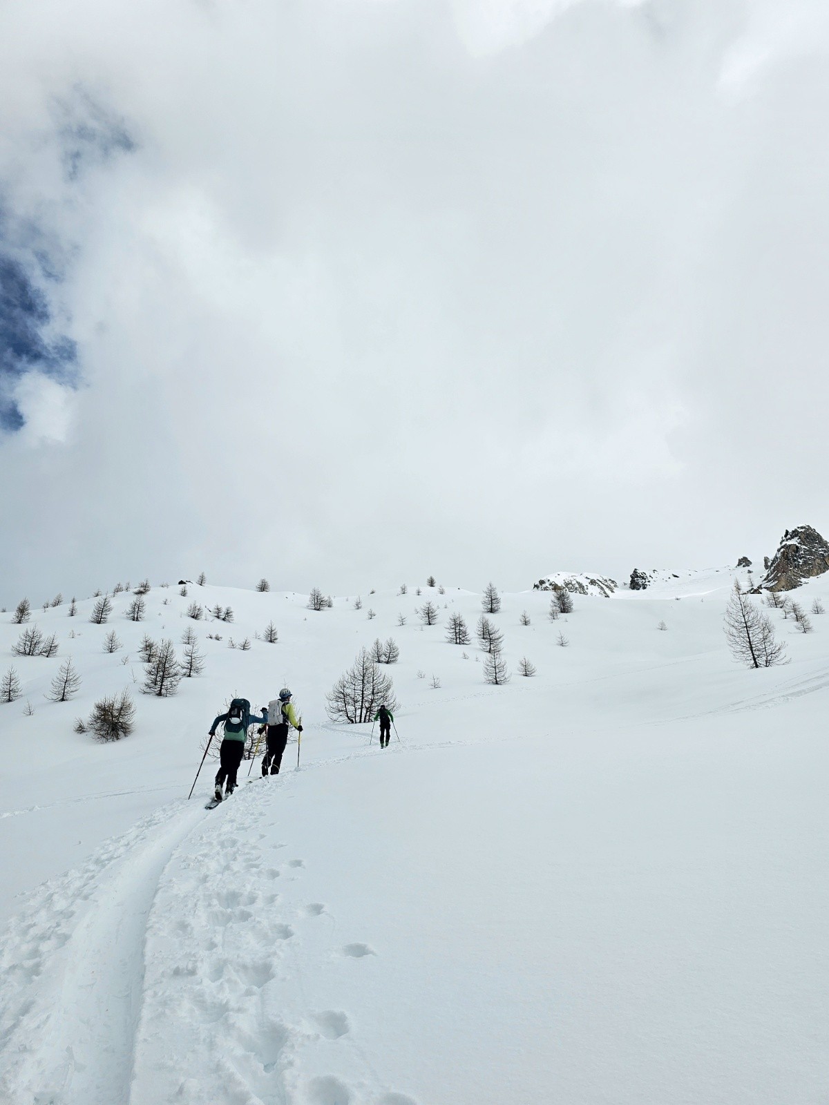 L'italien trace raide, on retrace sur presque toute la montée. La forêt est bien longue et s'arrête juste sous le sommet, dans le nuage à notre premier montée. On bloque juste dessous, début sans visibilité puis mieux des qu'il y a des arbres.