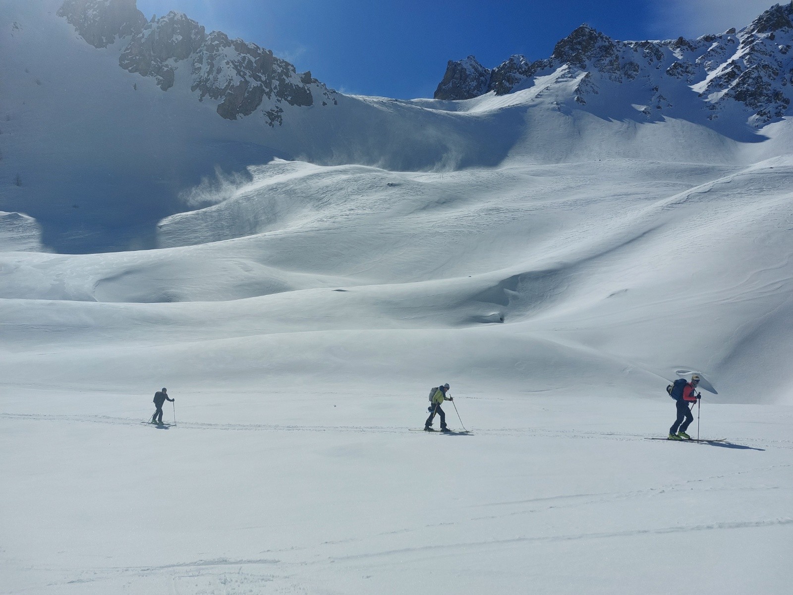 Conditions nivo et activité avalancheuse : rien vu bouger, les coulées sont déjà parties. Par contre le vent a bien travaillé toute la journée, formation de plaques en cours