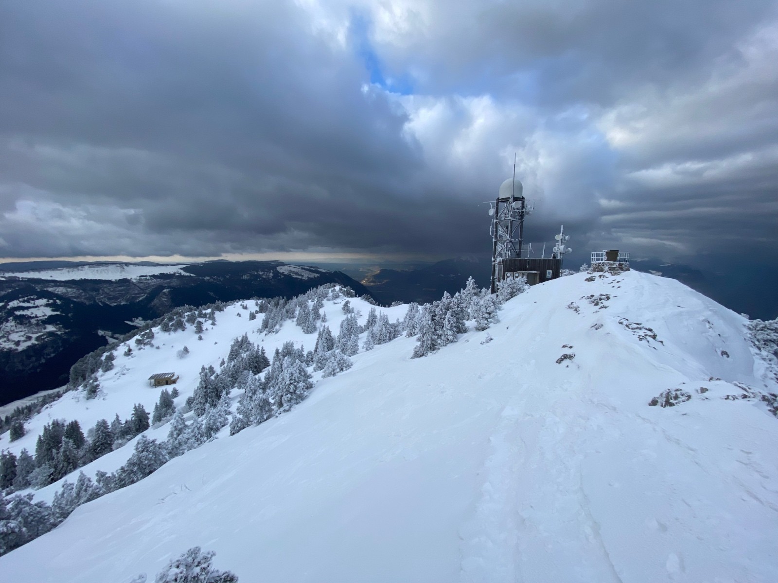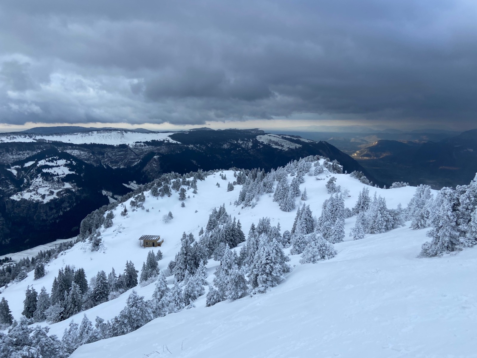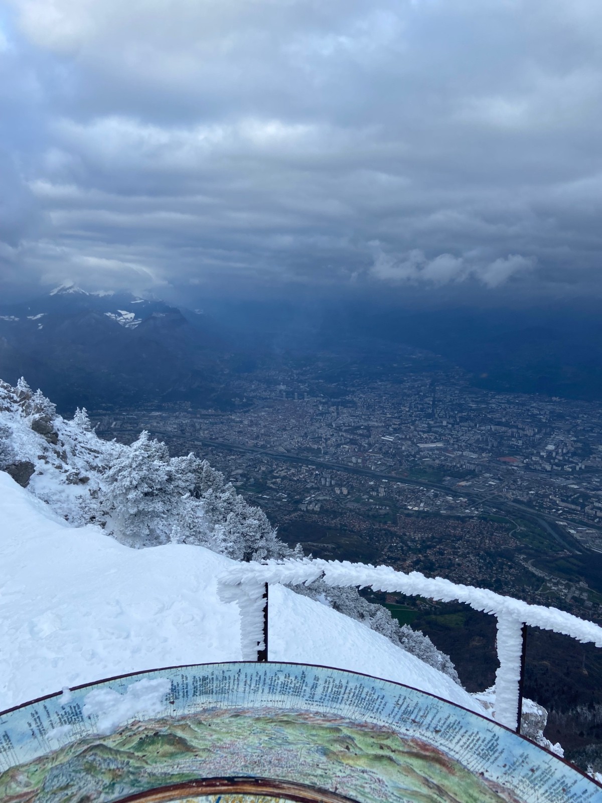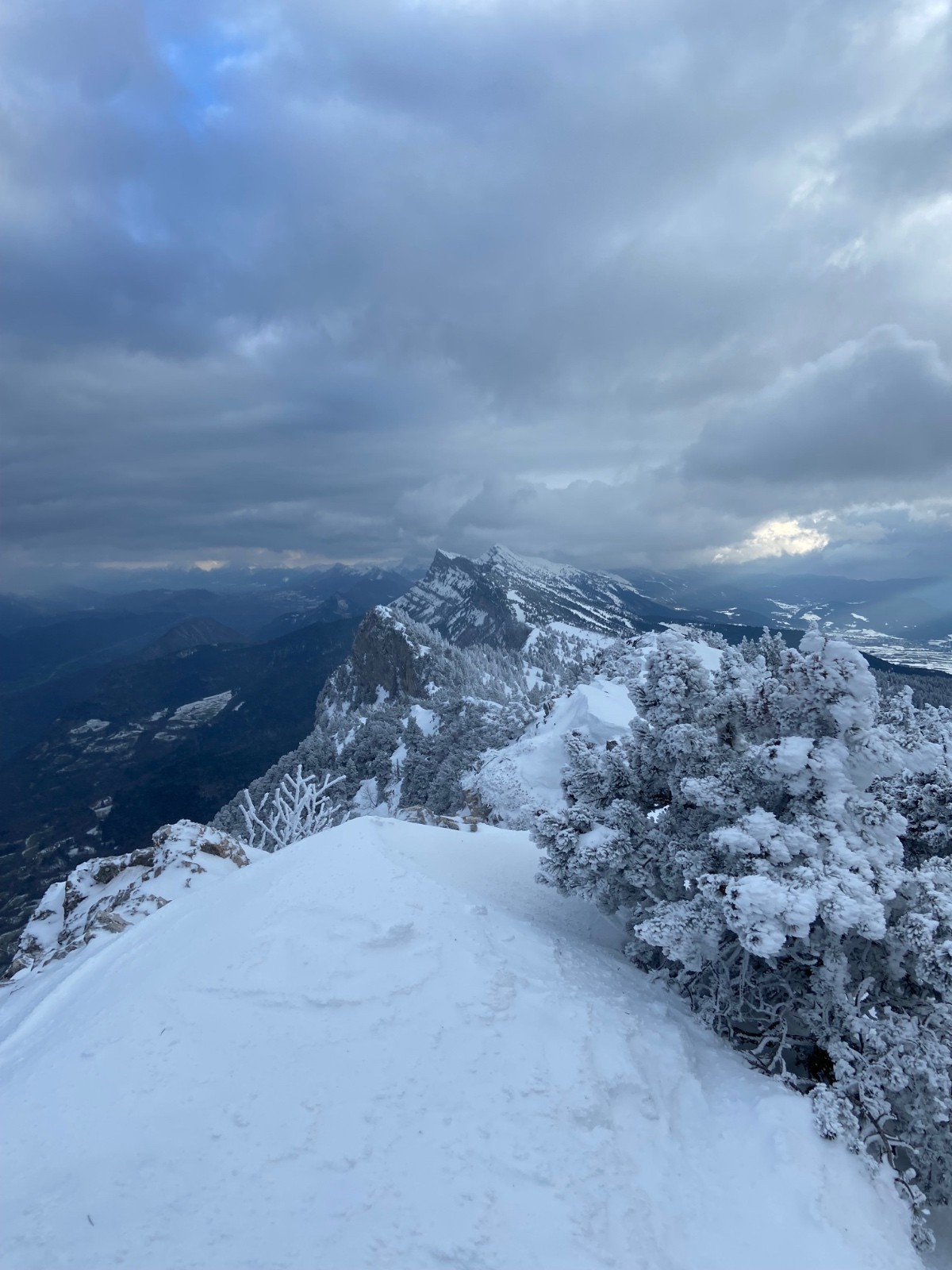 Toute la journée, il fait assez moche en ville, et d'un seul coup dans l'après-midi, les nuages commencent à remonter, et dévoilent un Moucherotte sous la neige dont le sommet flirte avec la base des nuages. Alors, je me laisse tenter, espérant que ça reste dégagé, et je vais avoir de la chance.