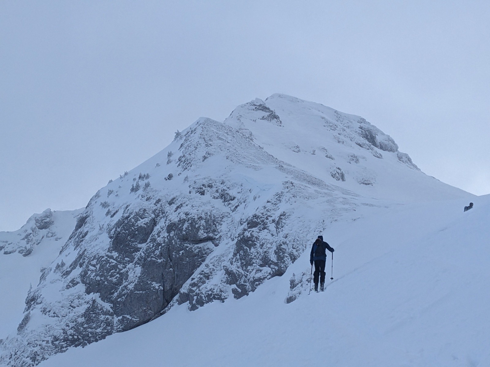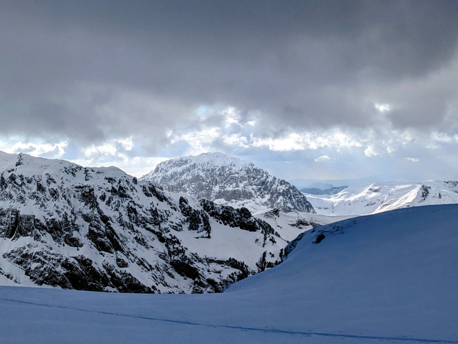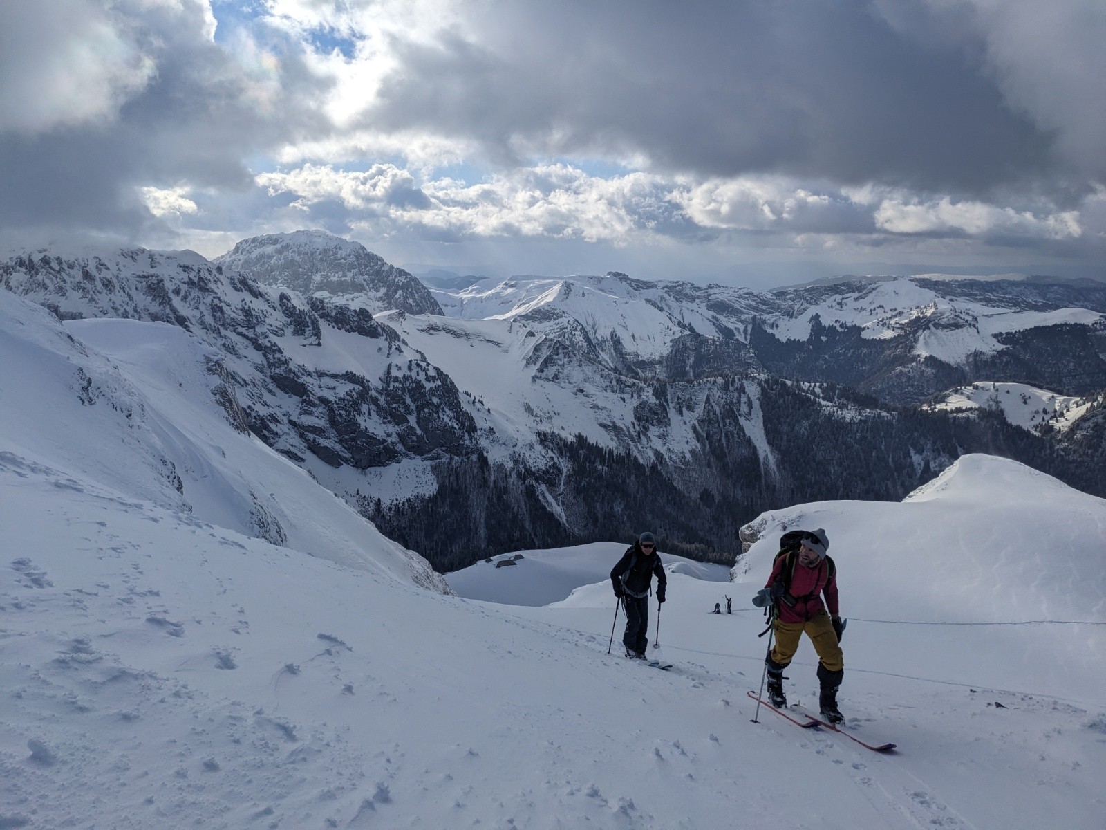 Remontée a la petite Chaurionde dans une belle ambiance, de belles éclaircies mais un plafond juste au niveau du sommet avec encore un fort vent bien froid. La encore on reste pas et on plonge dans la combe sous le sommet. Encore de belles grandes courbes !