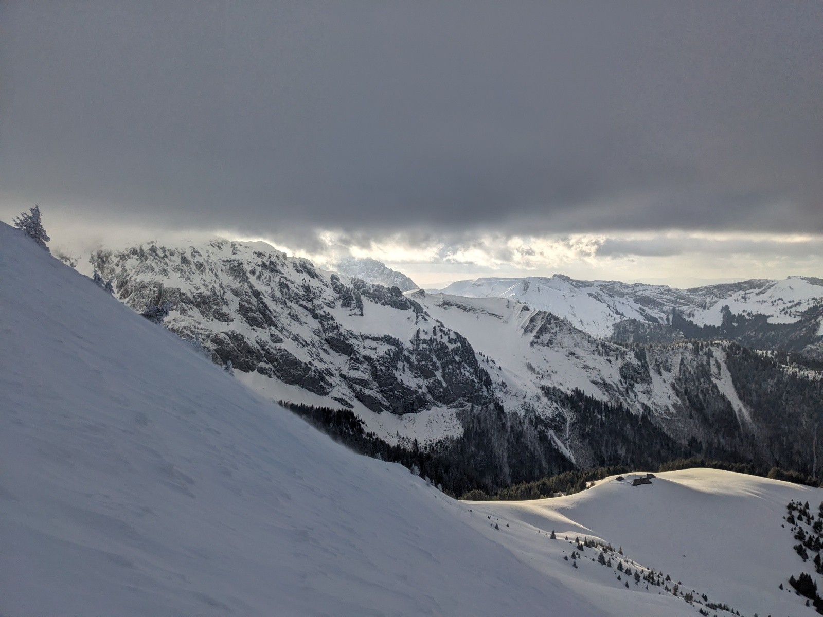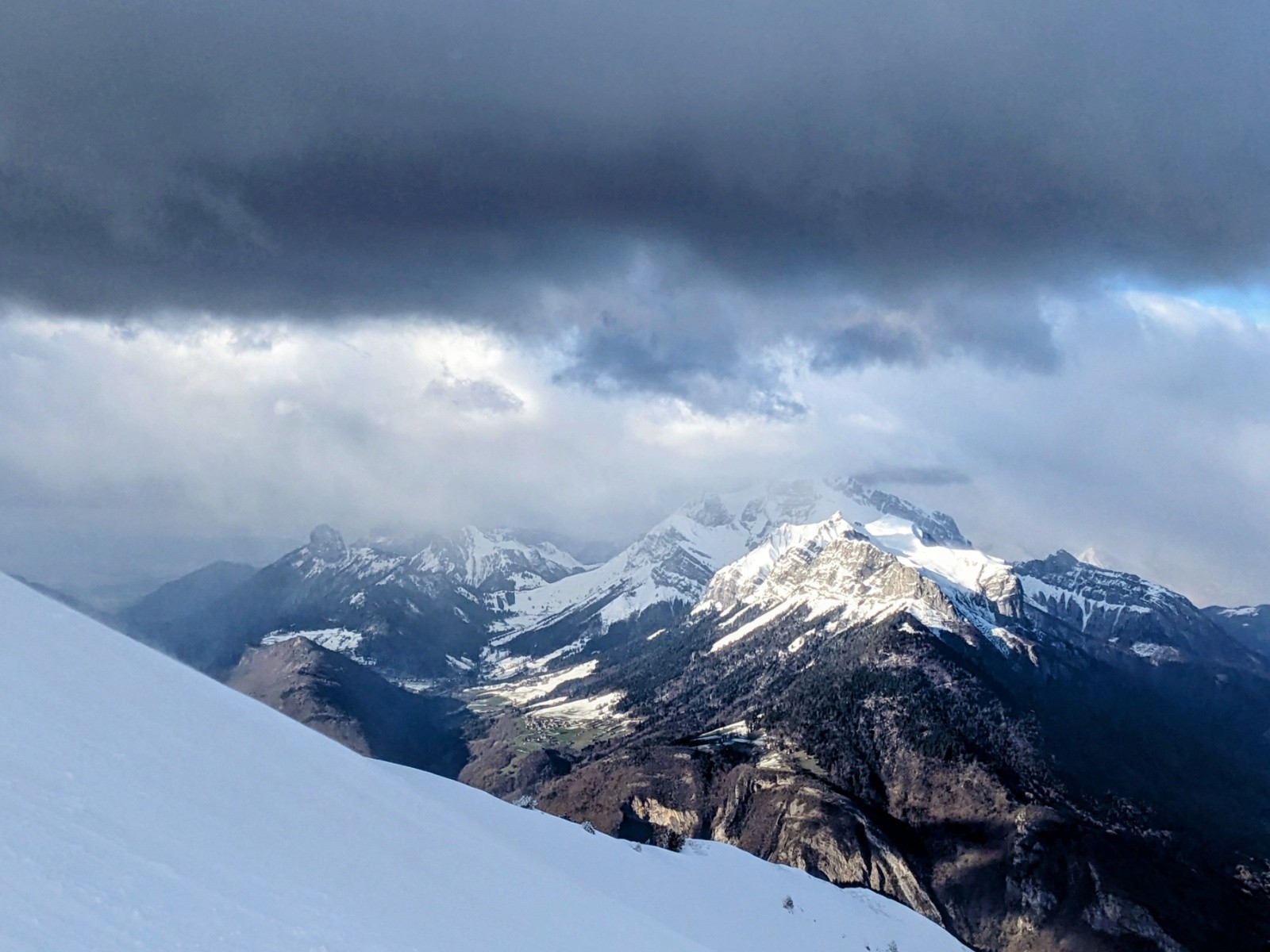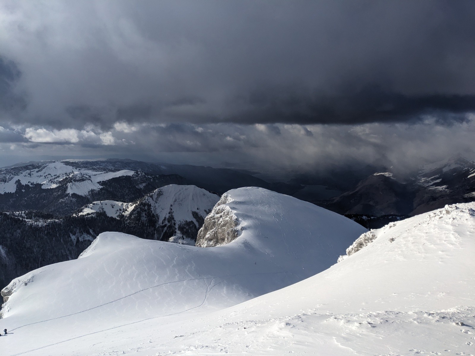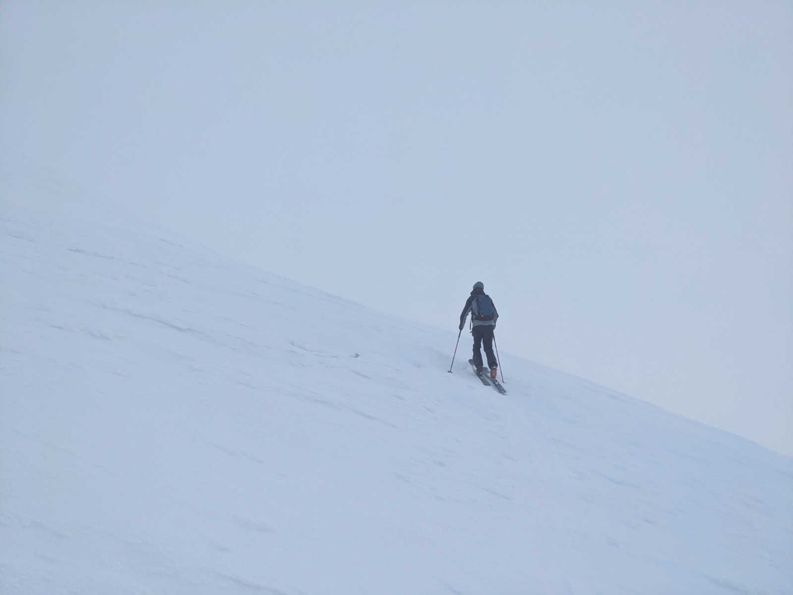 Remontée a la petite Chaurionde dans une belle ambiance, de belles éclaircies mais un plafond juste au niveau du sommet avec encore un fort vent bien froid. La encore on reste pas et on plonge dans la combe sous le sommet. Encore de belles grandes courbes !