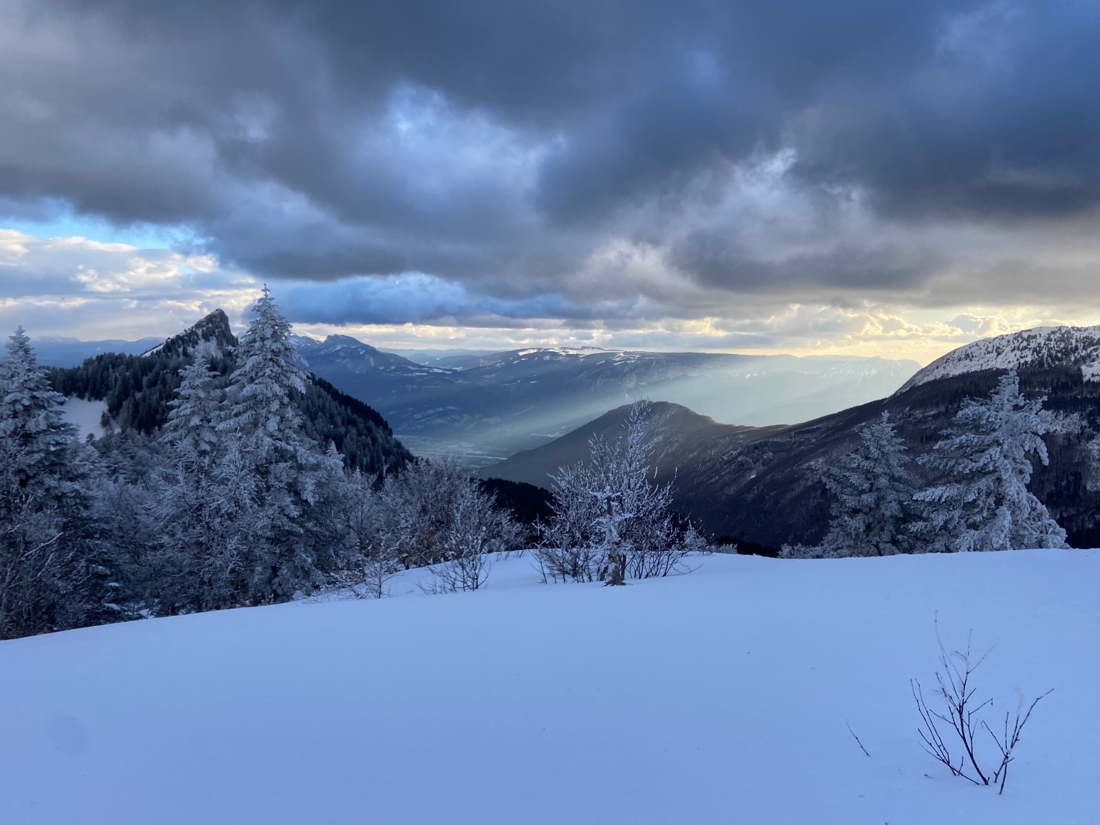 On reste une petite heure pour profiter du spectacle, avec une perspective remarquable sur La Pinéa et des rayons de soleil couchant qui transpercent les nuages.