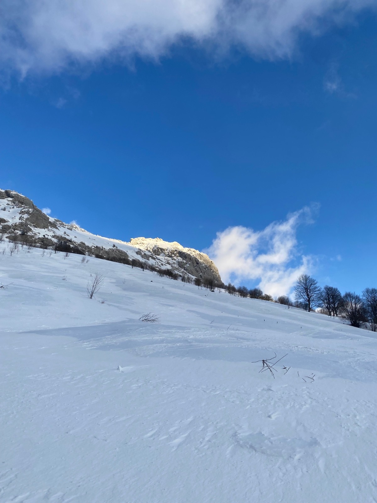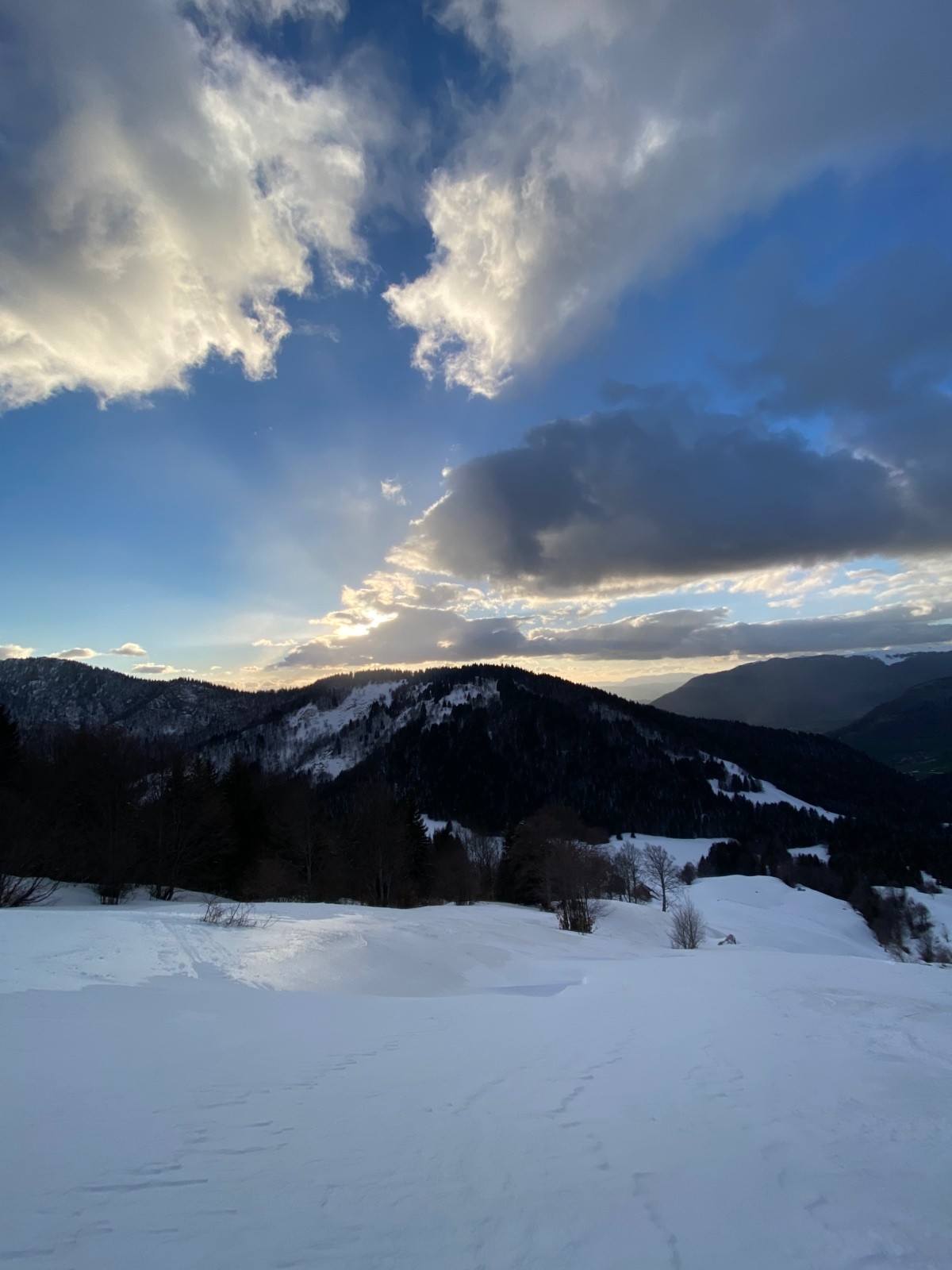 Conditions pour le ski : en bas dans la forêt neige fraîche, un peu lourde par endroit. A partir du chalet alternance de plaques de glace/croûte infâme et zones d’accumulation avec une bonne neige mais qui prend un pas mal les skis