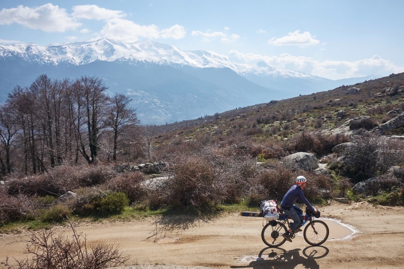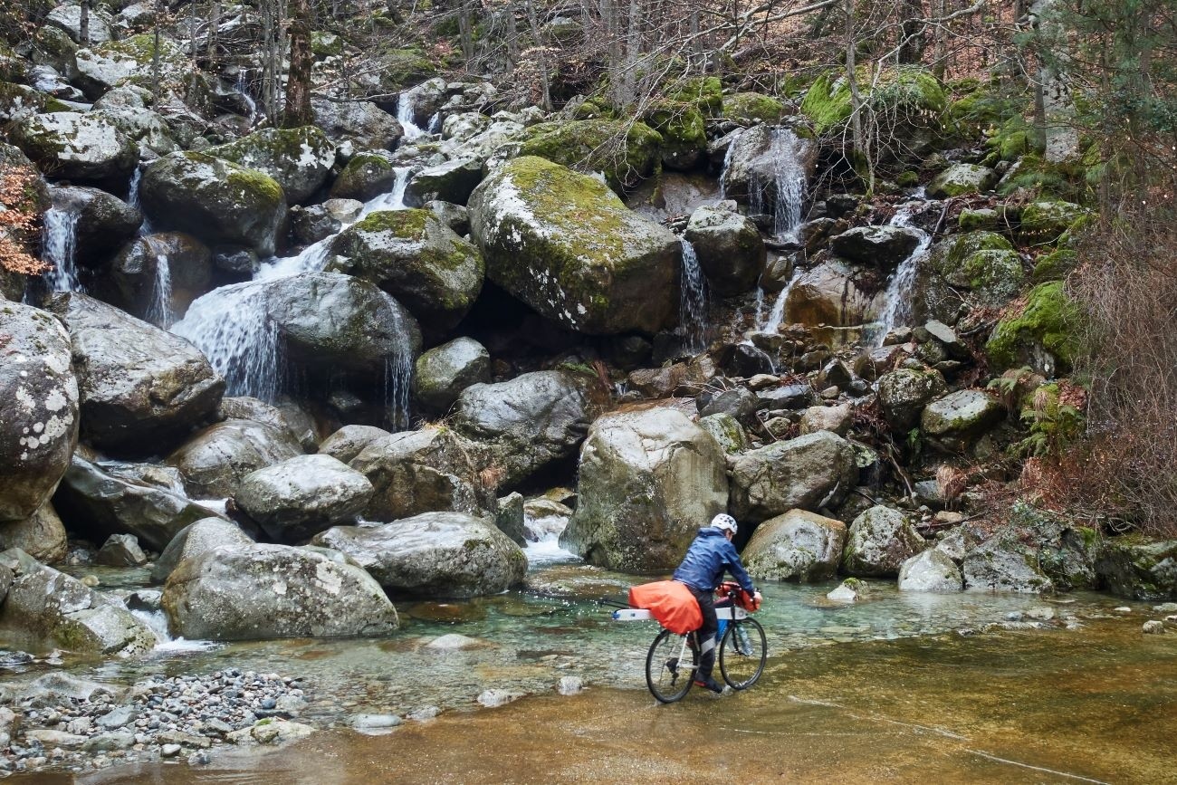 Pour des raisons de date, on choisit finalement de dĂ©barquer au petit matin dans la citĂ© napolĂ©onienne dâAjaccio, plutĂŽt quâĂ Propriano. Ceci implique une premiĂšre journĂ©e exclusivement de vĂ©lo pour sâapprocher des montagnes enneigĂ©es. MĂȘme sâil fait meilleur sur la cĂŽte, compte tenu des prĂ©vis mĂ©tĂ©os, on hĂ©site Ă suivre lâitinĂ©raire envisagĂ© initialement qui prĂ©voyait de commencer par piquer une tĂȘte Ă la plage de Cupabia ! En dĂ©finitive, on dĂ©cide de viser directement les montagnes, pour filer au plus court dans la vallĂ©e du Taravo, avant de se prendre une dĂ©gradation orageuse en pleine poire. On prĂ©fĂšre profiter des trĂšs agrĂ©ables sources dâeaux chaudes (40°CâŠ) de Guitera plutĂŽt que dâaller en quĂȘte dâune hypothĂ©tique accalmie mĂ©tĂ©o pour descendre lâIncudine/Alcudina. CâĂ©tait pourtant le sommet le plus au sud de lâile de beautĂ©, que nous envisagions de descendre Ă ski. Dommage, car cette annĂ©e, lâenneigement abondant des sommets mĂ©ridionaux augurait du bon ski sur ces montagnes plus rarement skiĂ©es que celles de lâalta strada, la Haute-Route corse Ă ski, qui se parcourt gĂ©nĂ©ralement entre la vallĂ©e dâAsco et le massif du Renoso.