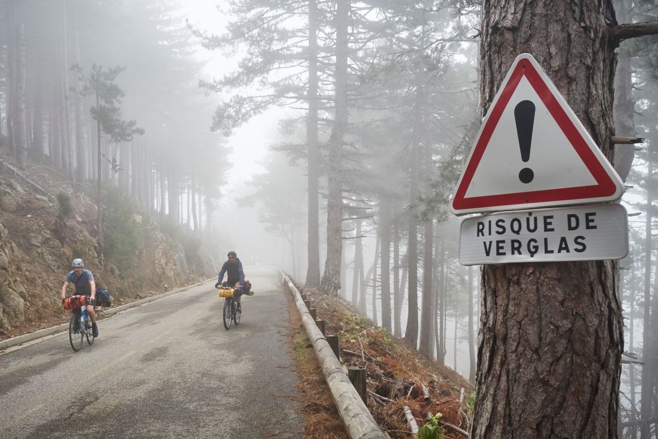 De retour à nos vélos au parking du "fer à cheval", il vient de tomber 5 cm de neige, et le chasse-neige n'est pas encore passé sur la route du col de Vergio...