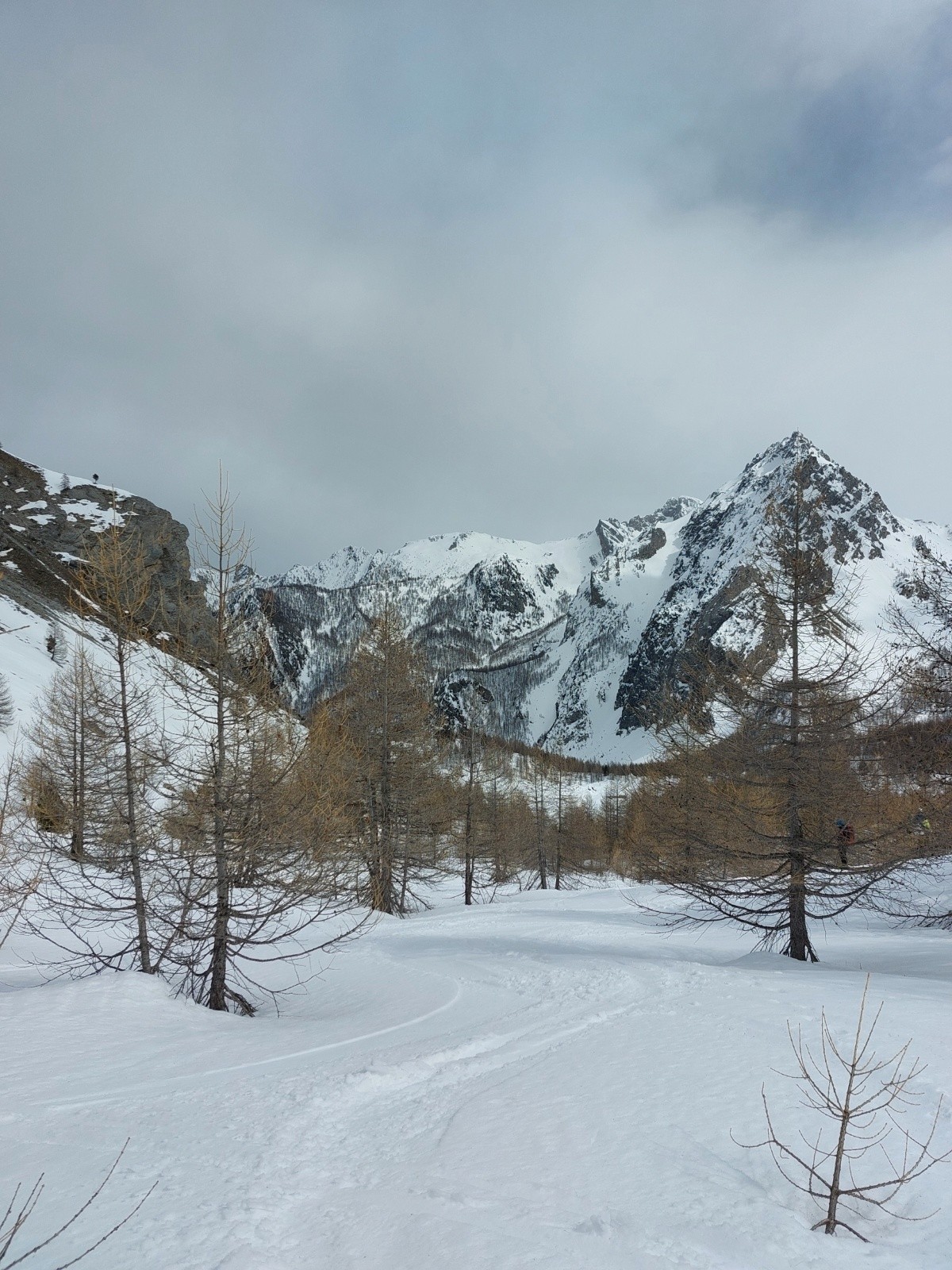 Miracle dans les mélèzes, une fine moquette et moins de vent, on repeaute 200m dans le vallon pour profiter de la foret ludique mais le temps se bâche et ça aura le temps de recrouter légèrement pour la 2eme descente... Le retour est bon dans la forêt, on ne suit pas la route en coupant dans Protorotondo et l'alpage.