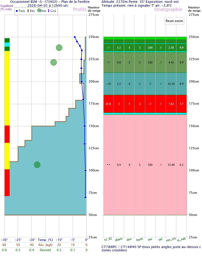 https://regobs.no/registration/458855), puis un second plus complet en versant NE, cette fois-ci à l'Est de la Cicle (méthode boraine : cf Photos). Le manteau est plutôt bien stabilisé, il reste toutefois beaucoup de neige "froide" et meuble en surface (entre 20-40 cm en général), avec quelques petites instabilités généralement temporaires. Très localement, quelques petits angles semblent s'être formés à l'interface entre les couches de neige froides tombées ces derniers jours, et l'ancien manteau qui était crouté en surface --> cf CT14@40SP lors du deuxième sondage. Mais globalement rien d'inquiétant, les prochains jours vont être de plus en plus printanier, les gradients seront faibles dans le manteau permettant aux grains d'évoluer très favorablement.