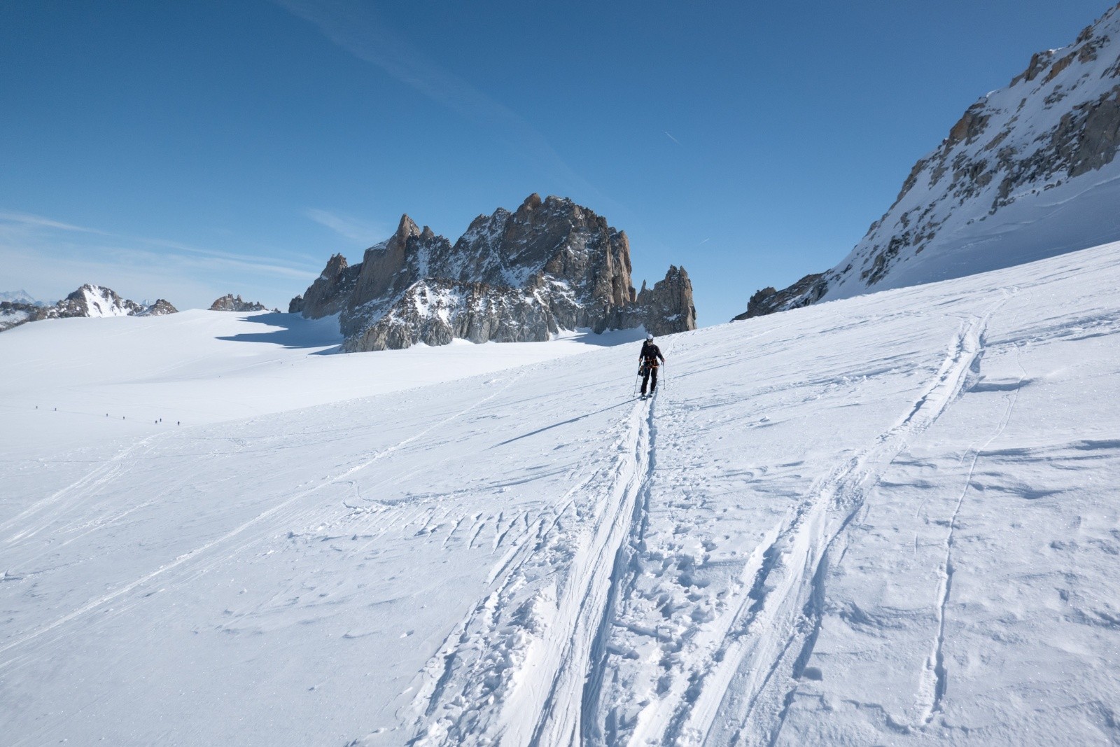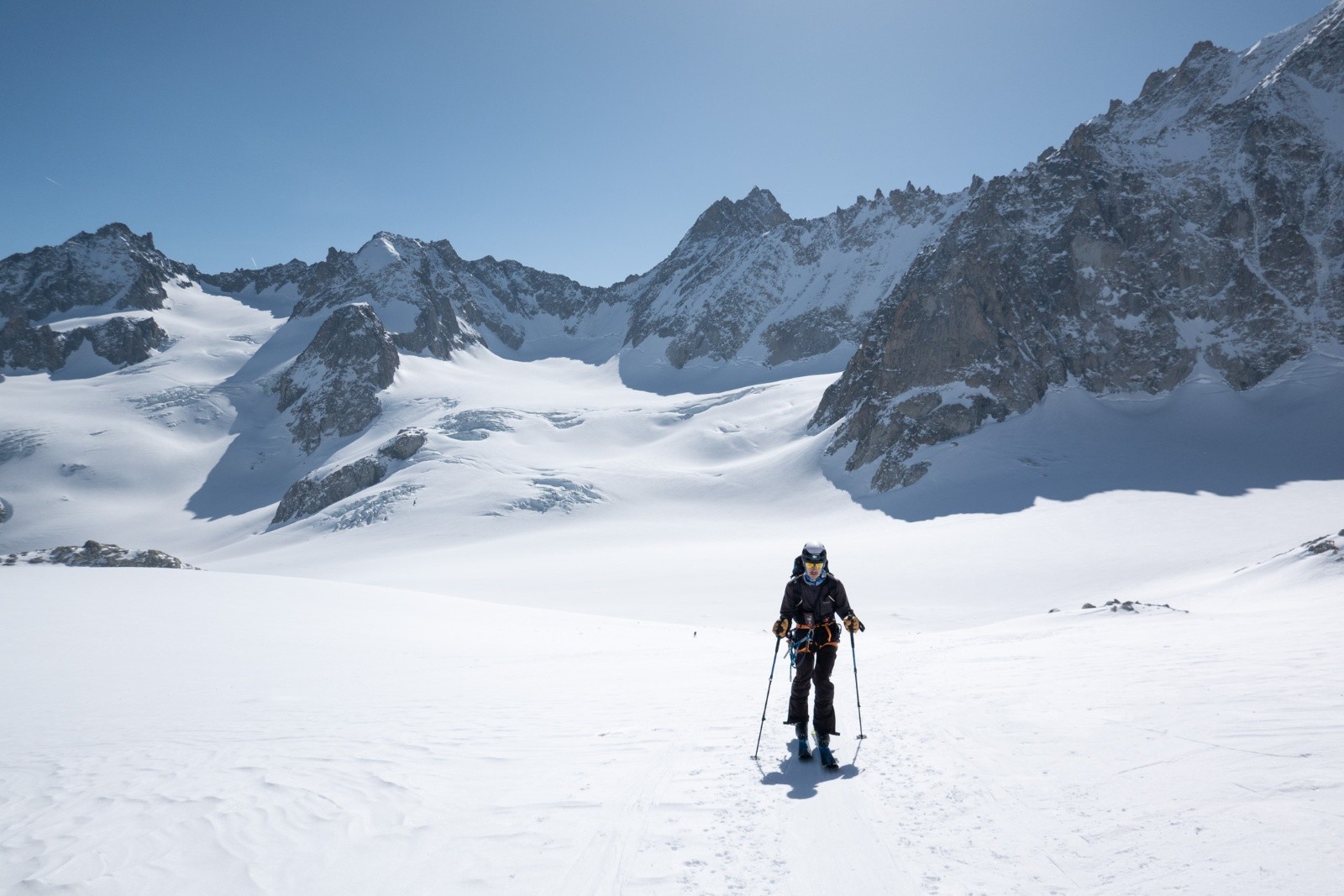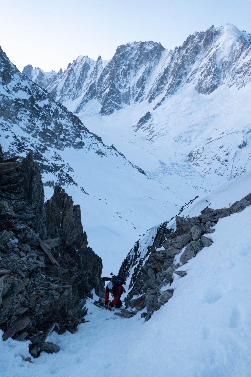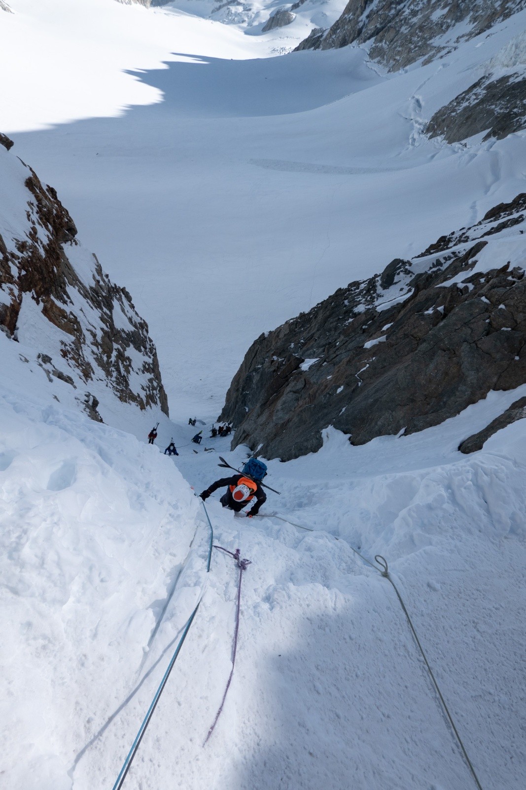 A la base on était monté au Refuge Albert 1e pour faire une goulotte sur l'Aiguille du Chardonnet, mais au vu des condis (trop sec) on s'est rabattu sur un bon tour en ski de rando avec 4 cols. Ca nous a fait bosser l'efficacité de pose et dépose des crampons !