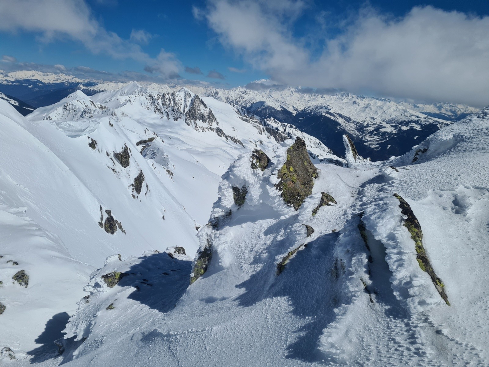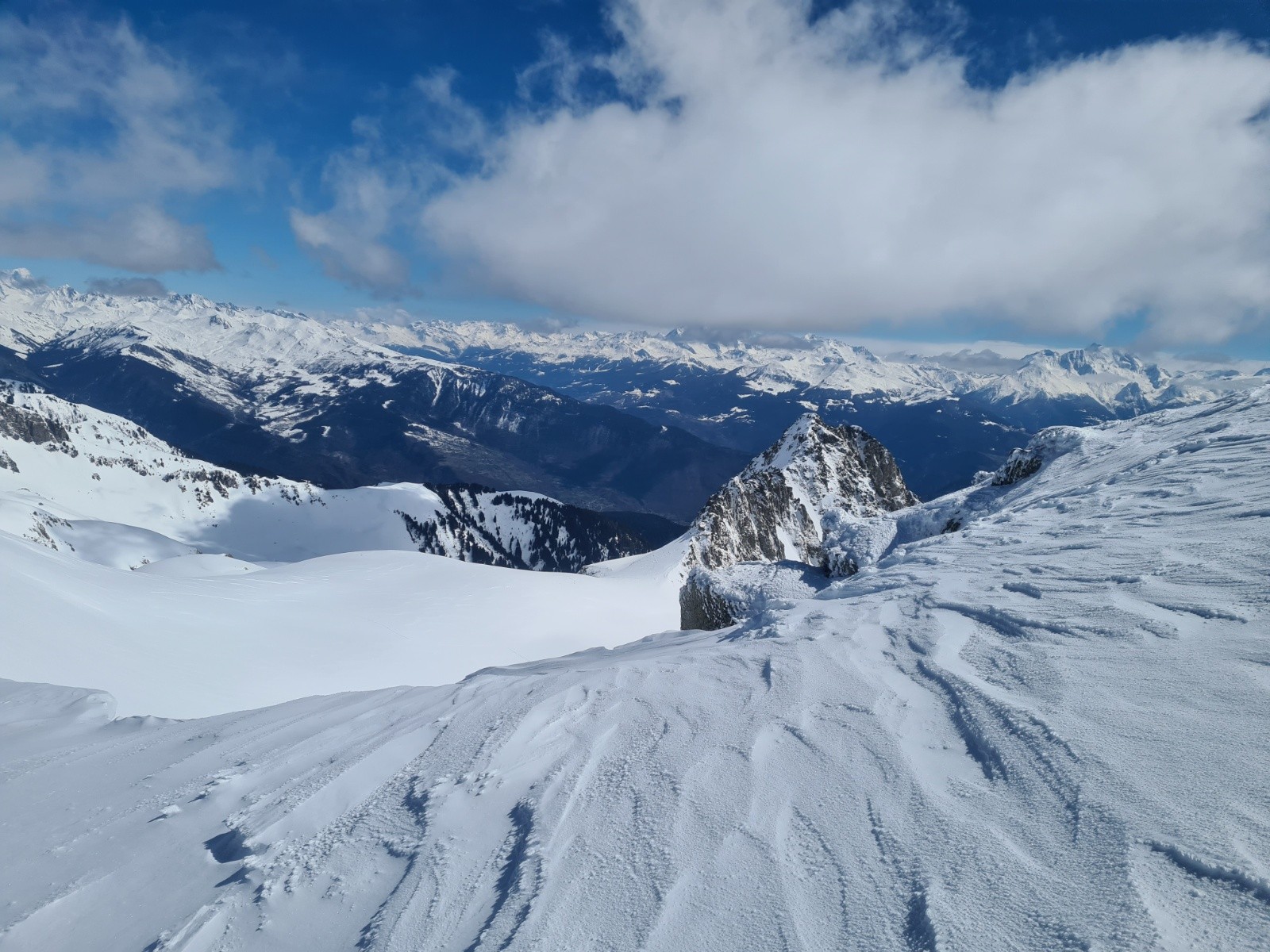Sur la crête des Frettes, la poudre n'est plus, on voit les plaques formées par le vent et les belles corniches de glace bleu.