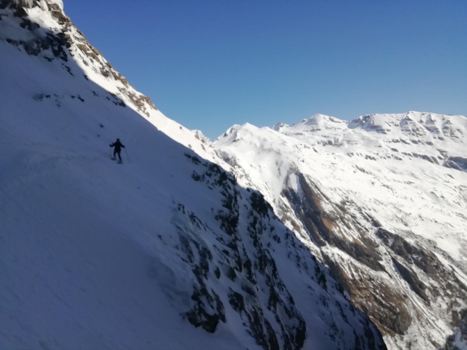 Manque 1m de neige pour que le ressaut se skie. On a désescaladé sur 5m. Ensuite 100% poudreuse, chauffée sur la banquette intermédiaire et froide dans le couloir inférieur un délice !