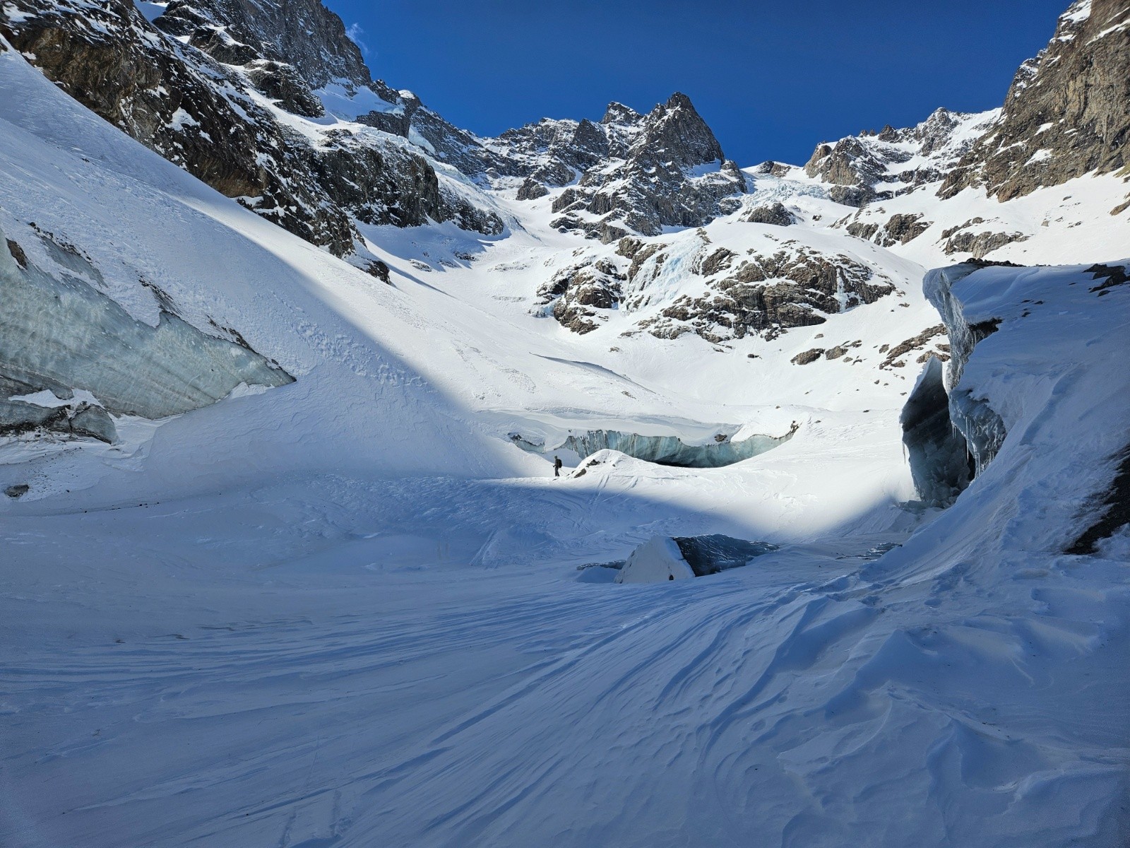 Col Claire : de la glace sur la 1ere pente mais ça passe en rive gauche, il a l'air de manquer de neige sur l'itinéraire au milieu du glacier.